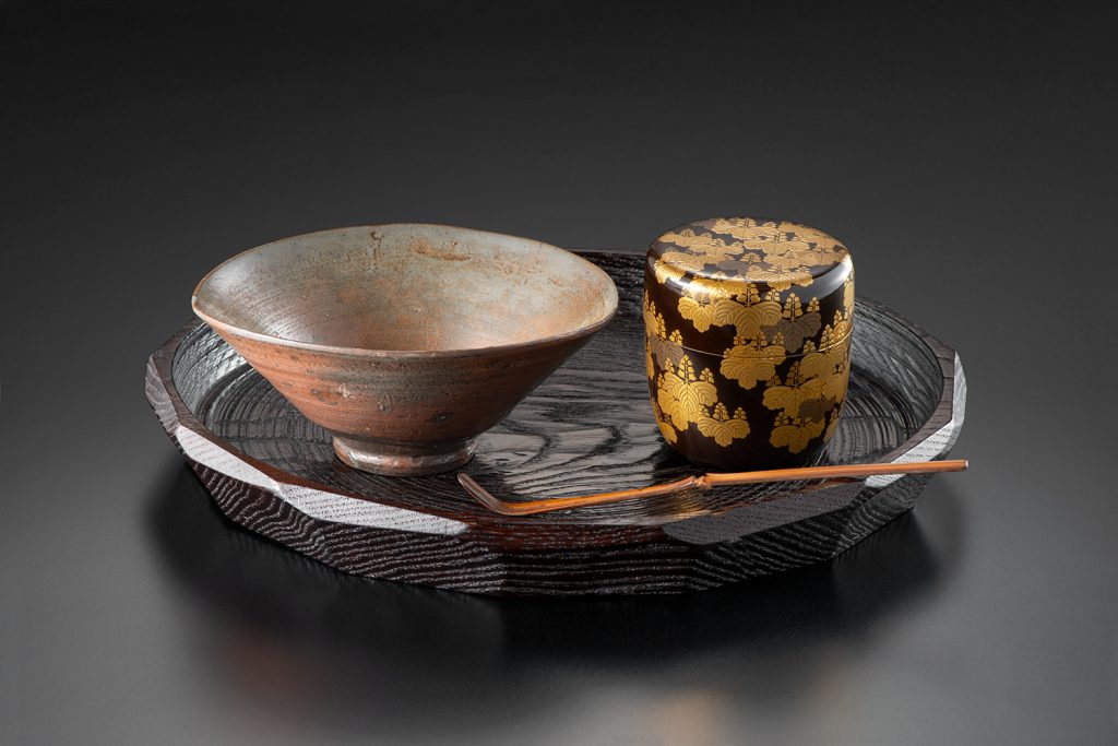 斗々屋茶碗(時代箱) 桐蒔絵大棗(時代箱) 千少庵 茶杓 山田宗偏筒 三代村瀬治兵衛 沢栗ハツリ盆
