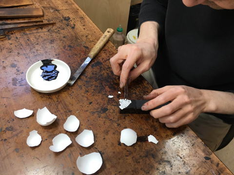 卵殻の罅(ひび)の美しさに魅せられ、主に卵殻細工の仕事をしております。