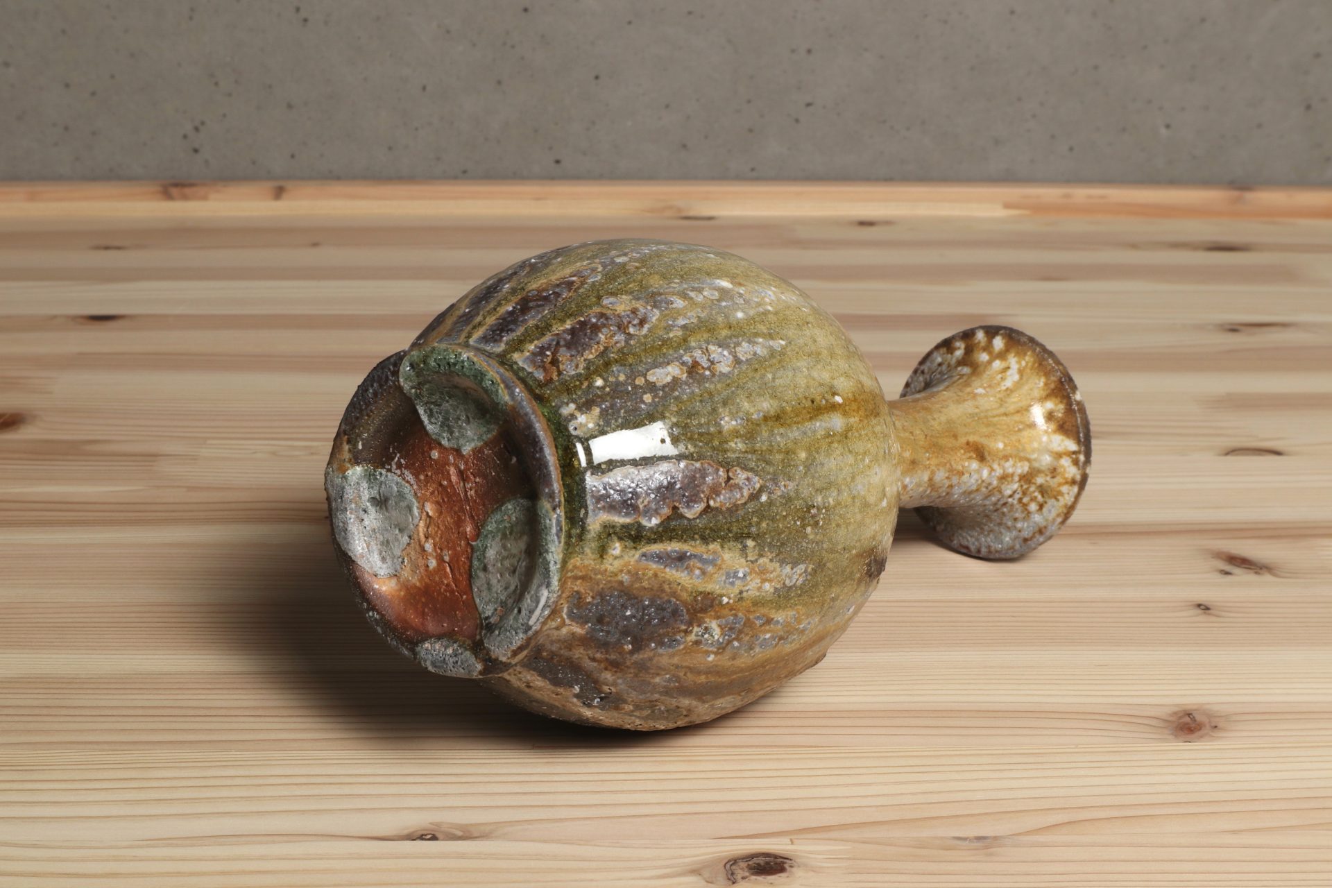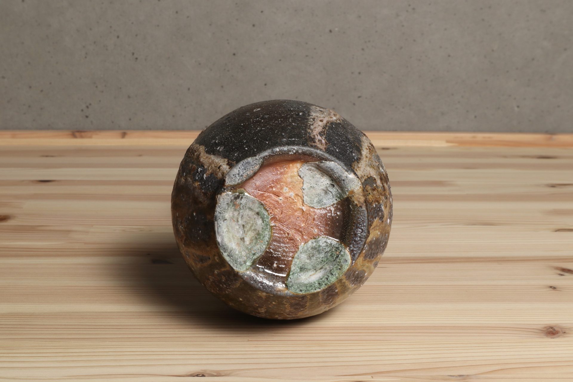 岸野寛さんの伊賀焼〆長頸壺です。深いエメラルドグリーンのビードロに、侘びた風情の灰被窯変。その豪胆で美しい景色に比して、清廉とした静謐な佇まいが印象的です。花を活けると一歩下がって花を引き立ててくれる・・・、そんな道具としても一流の花入。