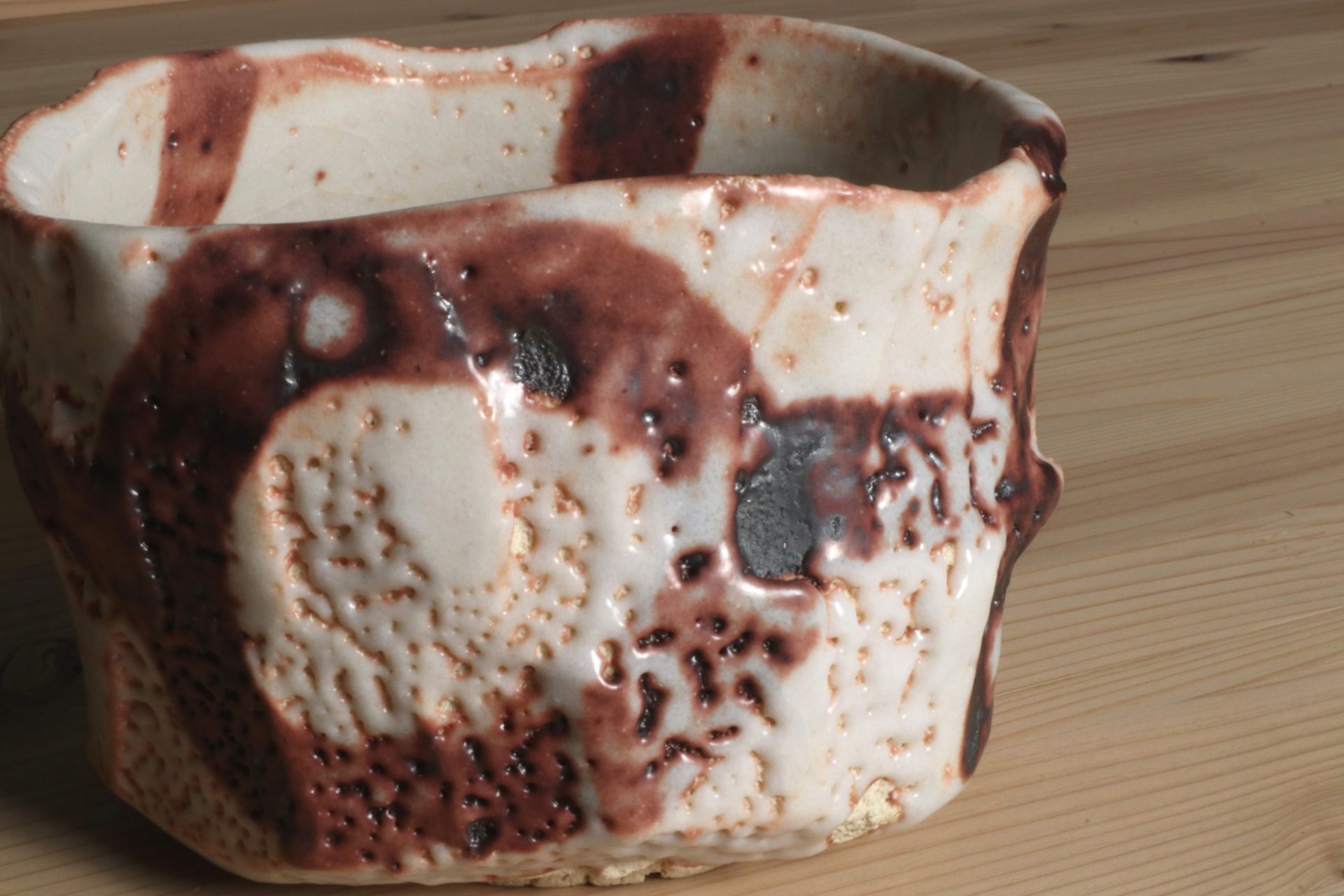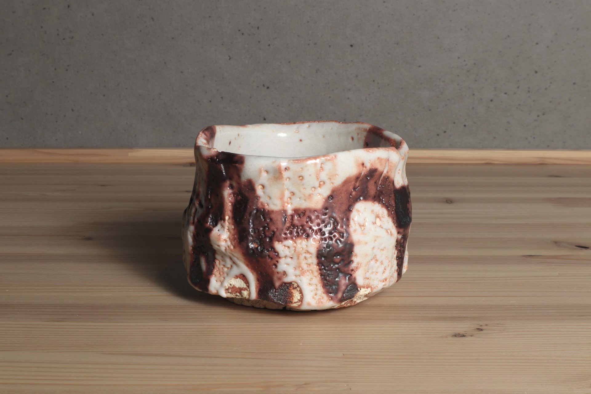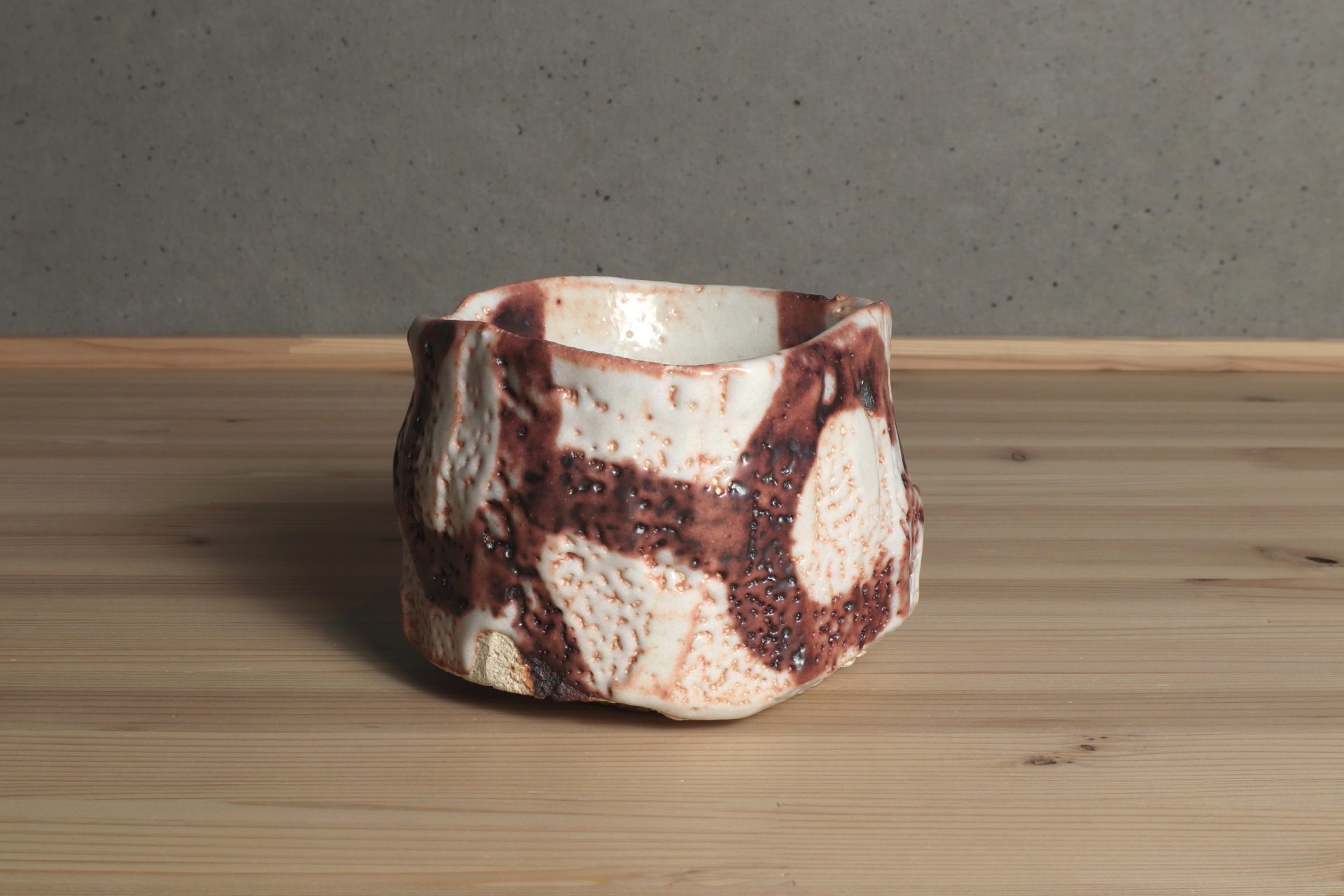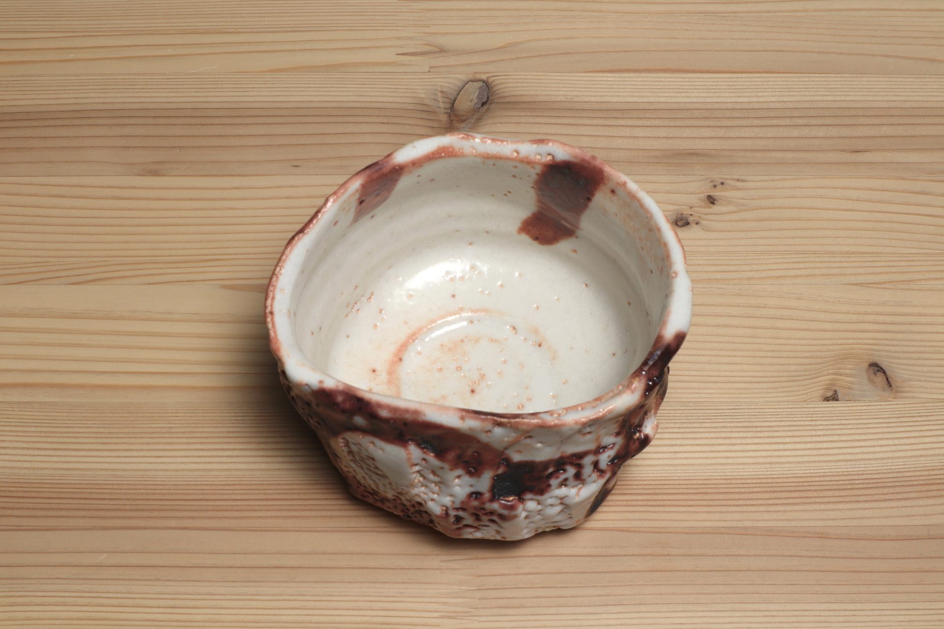 山田和先生の手斧で削ぎ落したような、動きのある巧みな造形が魅力の志野茶碗。繊細な柚子肌を呈した淡雪のようなぼってりとした志野釉に、茜色の円繋ぎのような大胆で遊び心ある鉄絵の意匠。重厚ながらも軽妙、瀟洒でありながらも品格のある一碗です。旧作ですが新品未使用、特別価格でのご紹介です。
