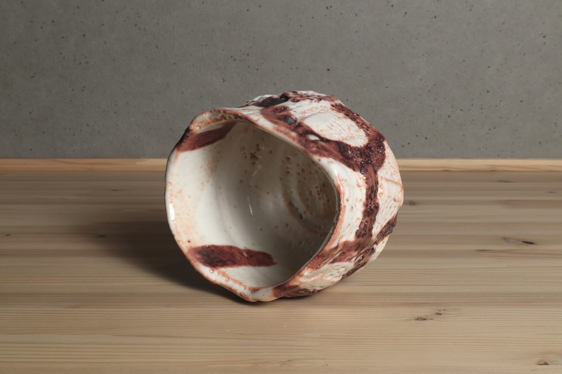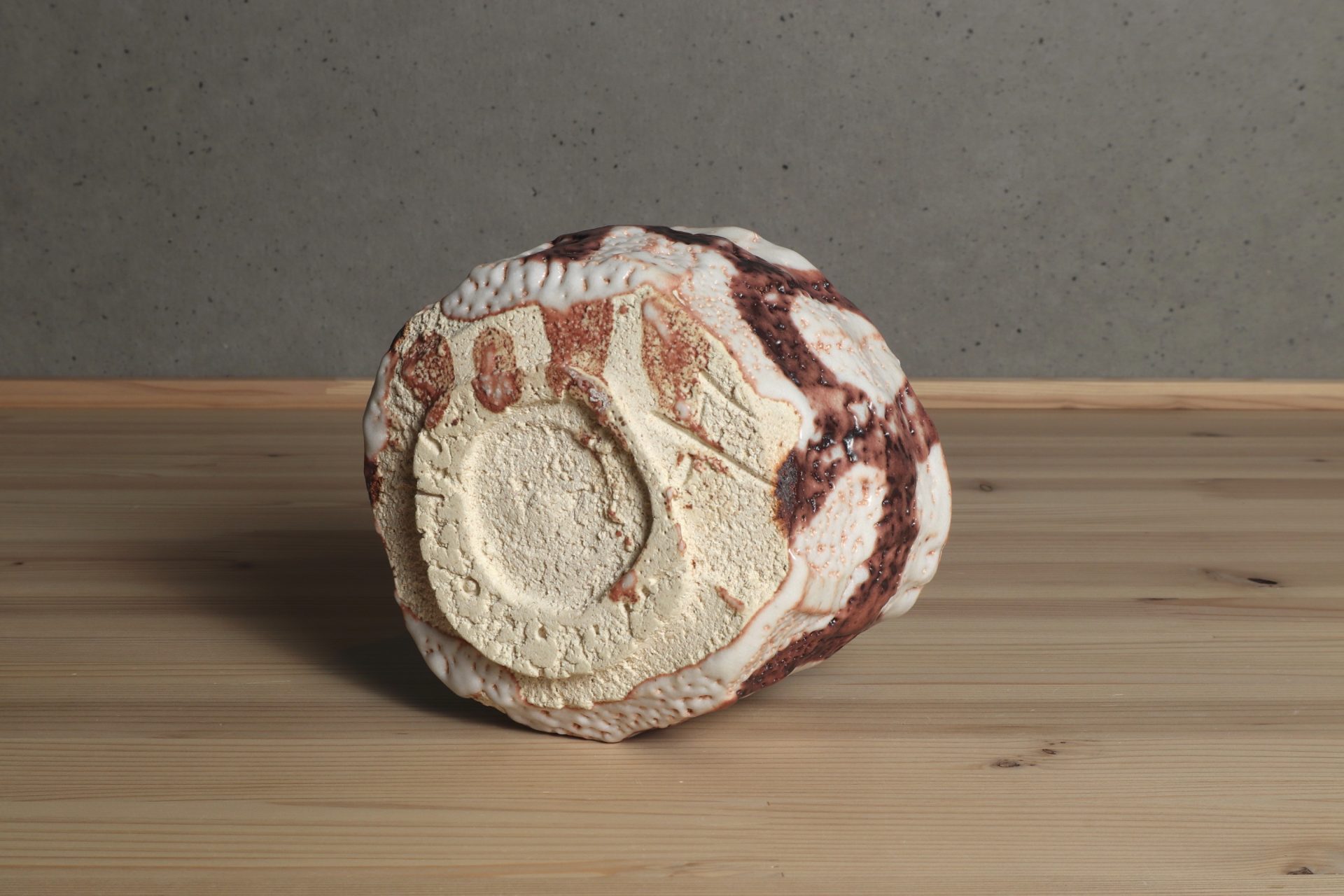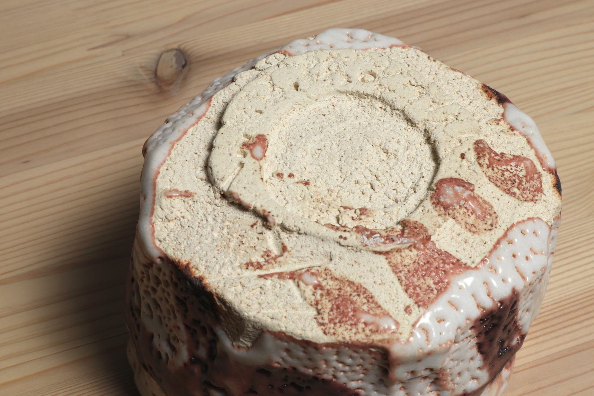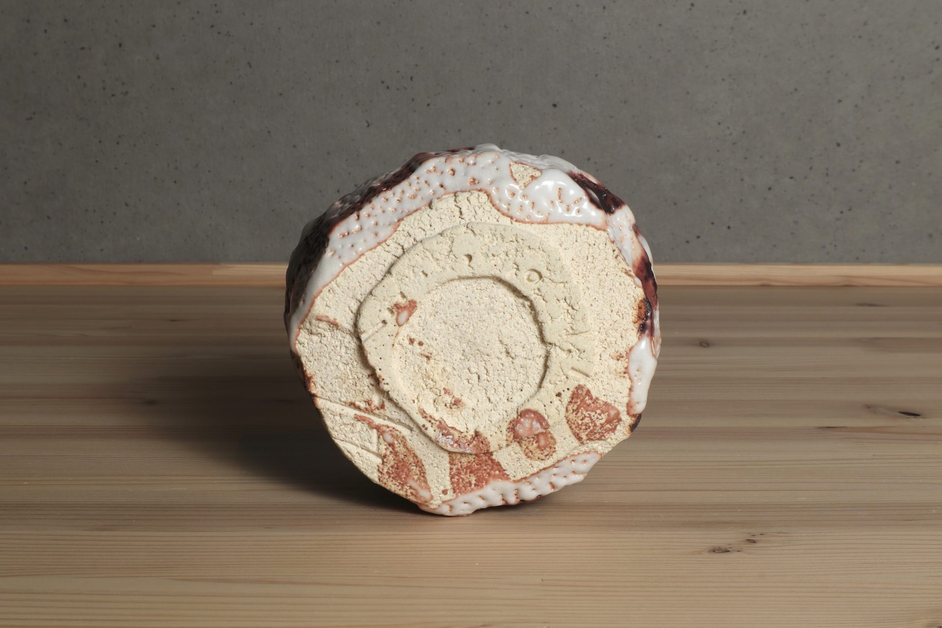 山田和先生の手斧で削ぎ落したような、動きのある巧みな造形が魅力の志野茶碗。繊細な柚子肌を呈した淡雪のようなぼってりとした志野釉に、茜色の円繋ぎのような大胆で遊び心ある鉄絵の意匠。重厚ながらも軽妙、瀟洒でありながらも品格のある一碗です。旧作ですが新品未使用、特別価格でのご紹介です。