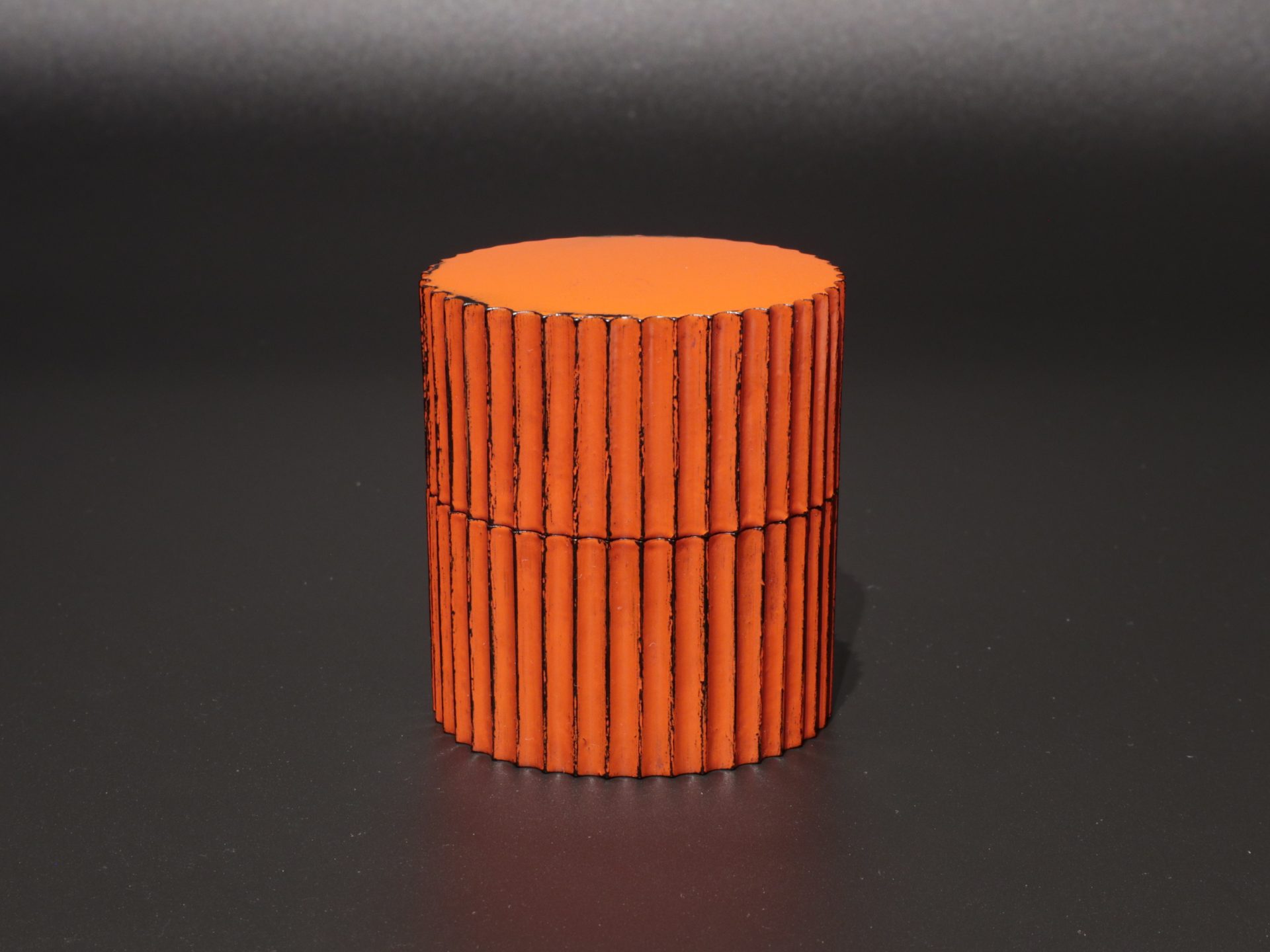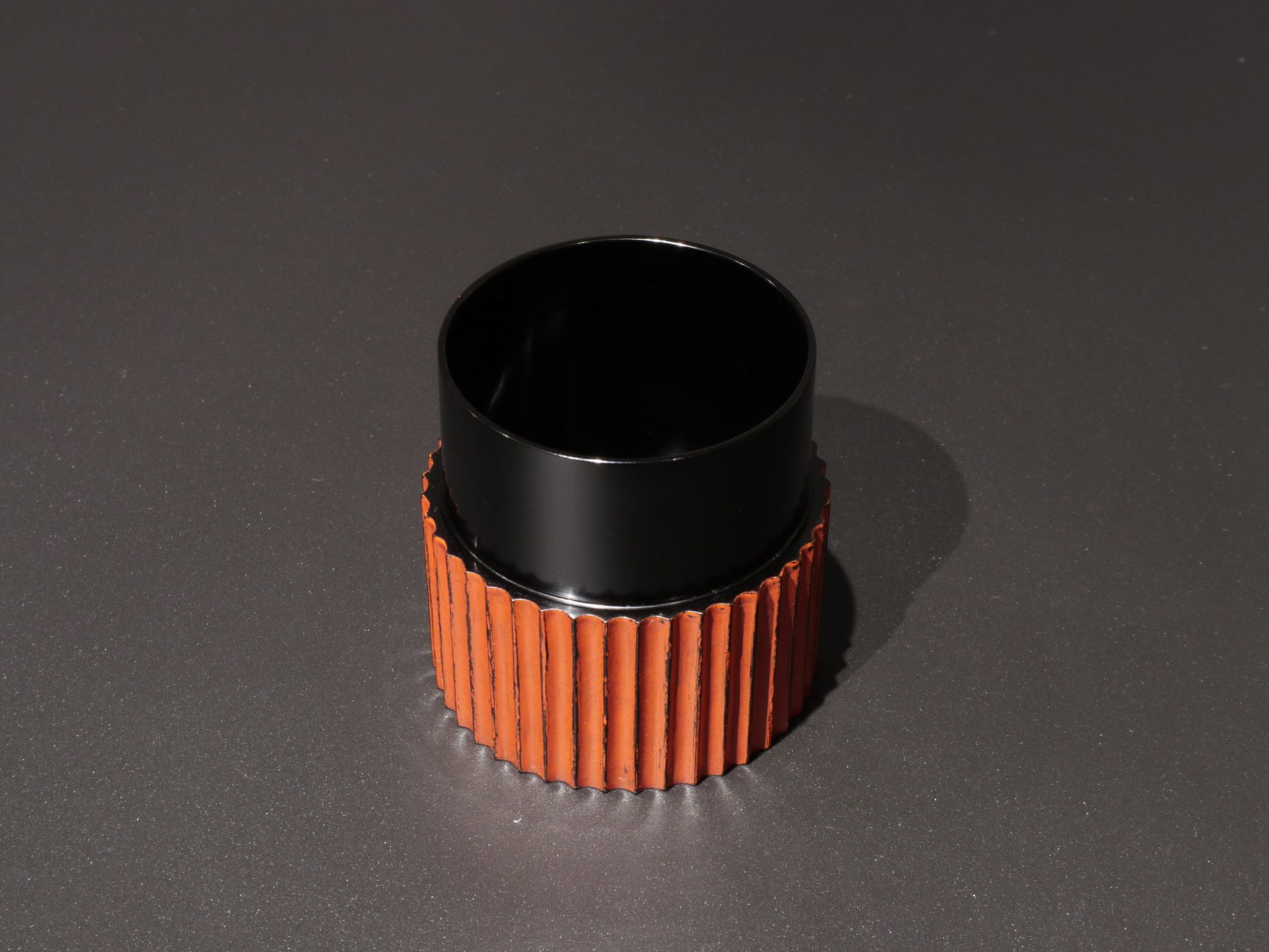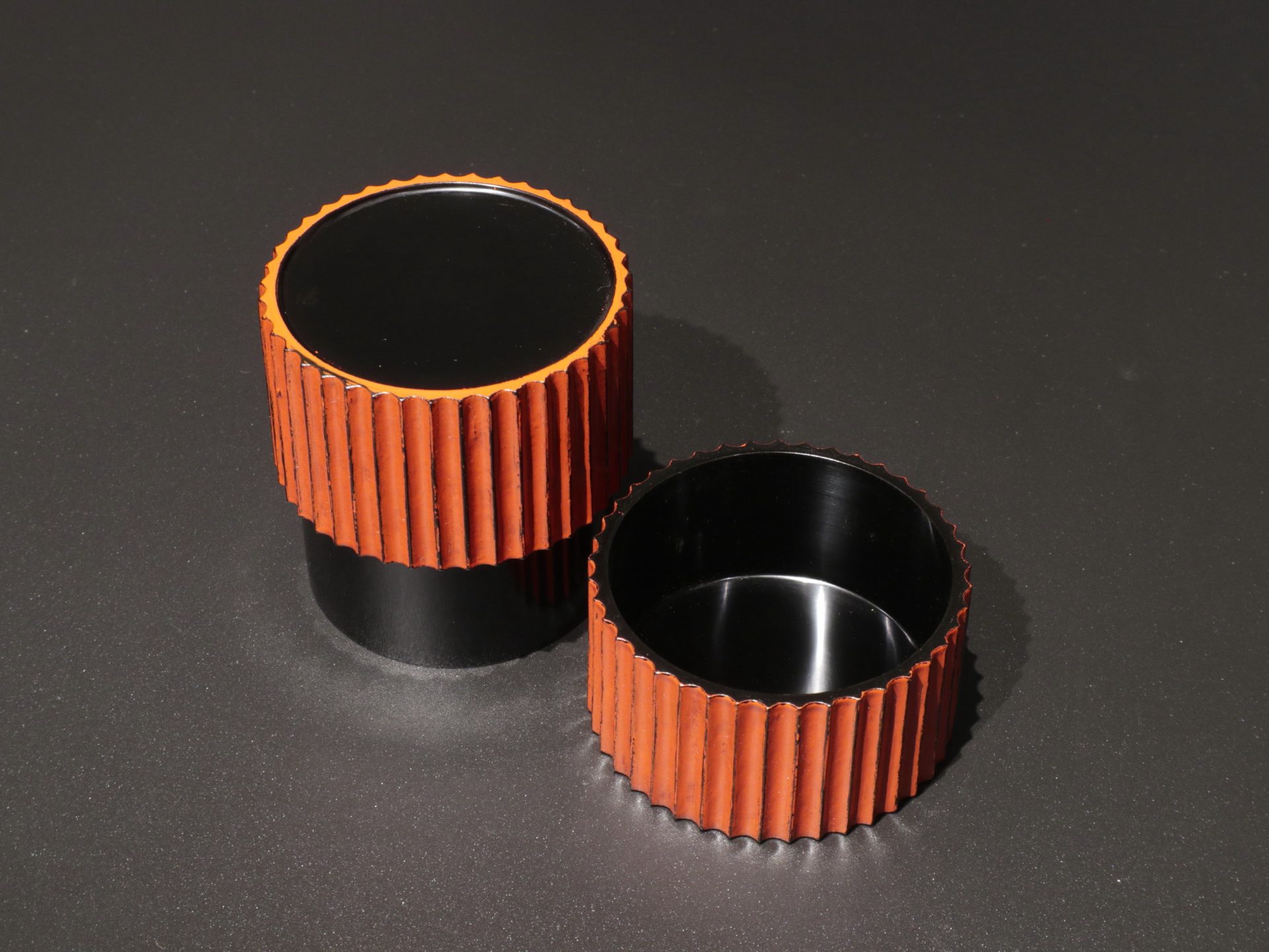 村瀬治兵衛さんの根来塗線刻中次。柔らかい発色の格調高い根来塗に、繊細ながらも強靭な雰囲気の線刻紋。凛とした佇まいの筒中次形で、身と蓋は吸い付くような感覚の絶妙な造りとなっています。伝統的な造形でありながら、現代の茶の湯空間を創造させてくれるシンプルでスタイリッシュな佇まいです。