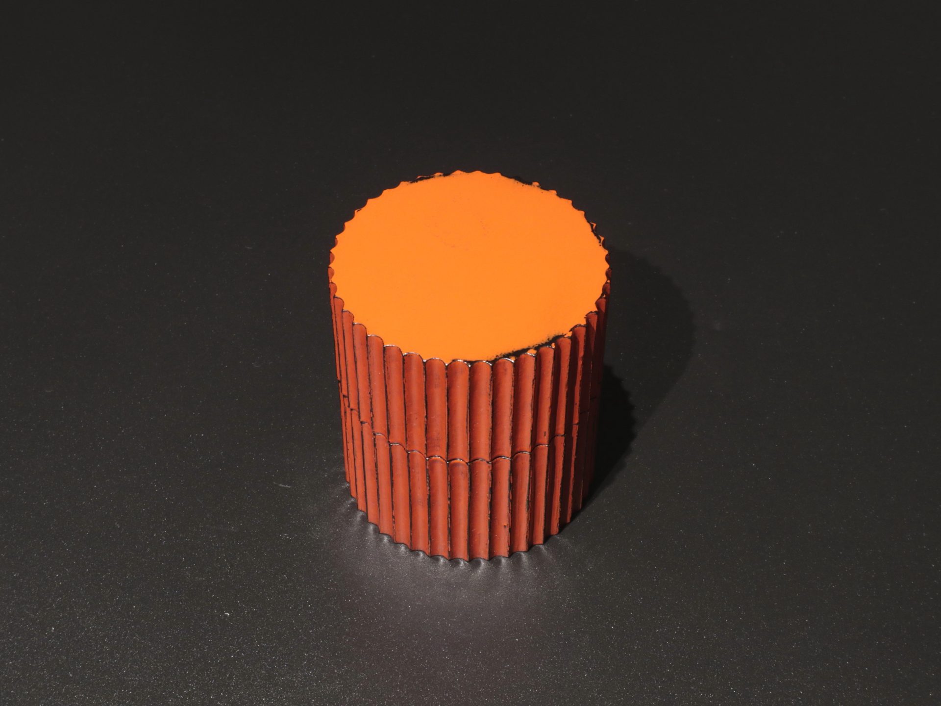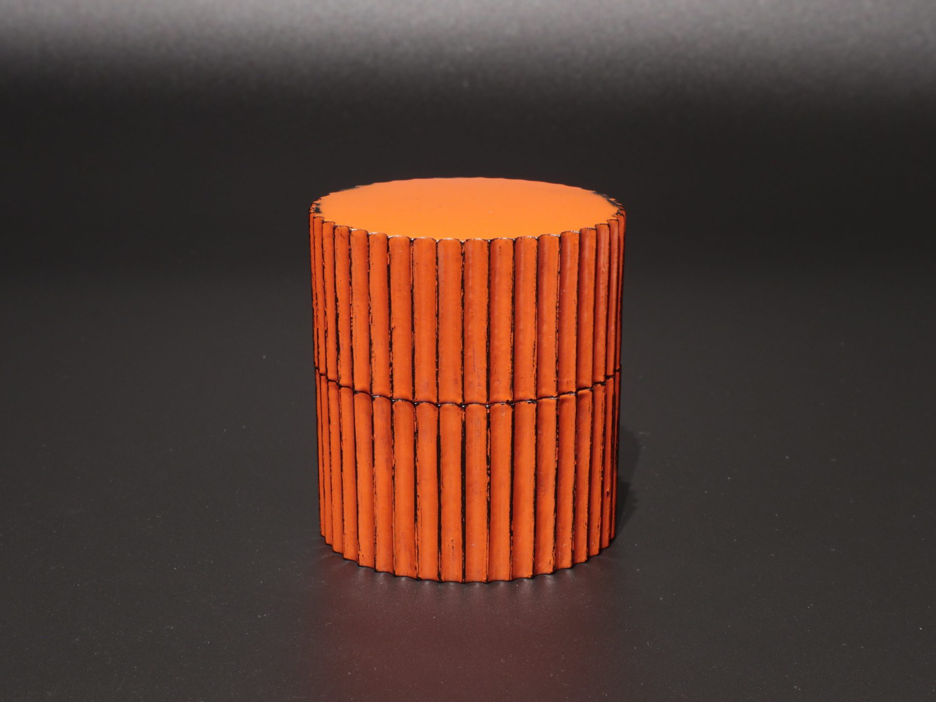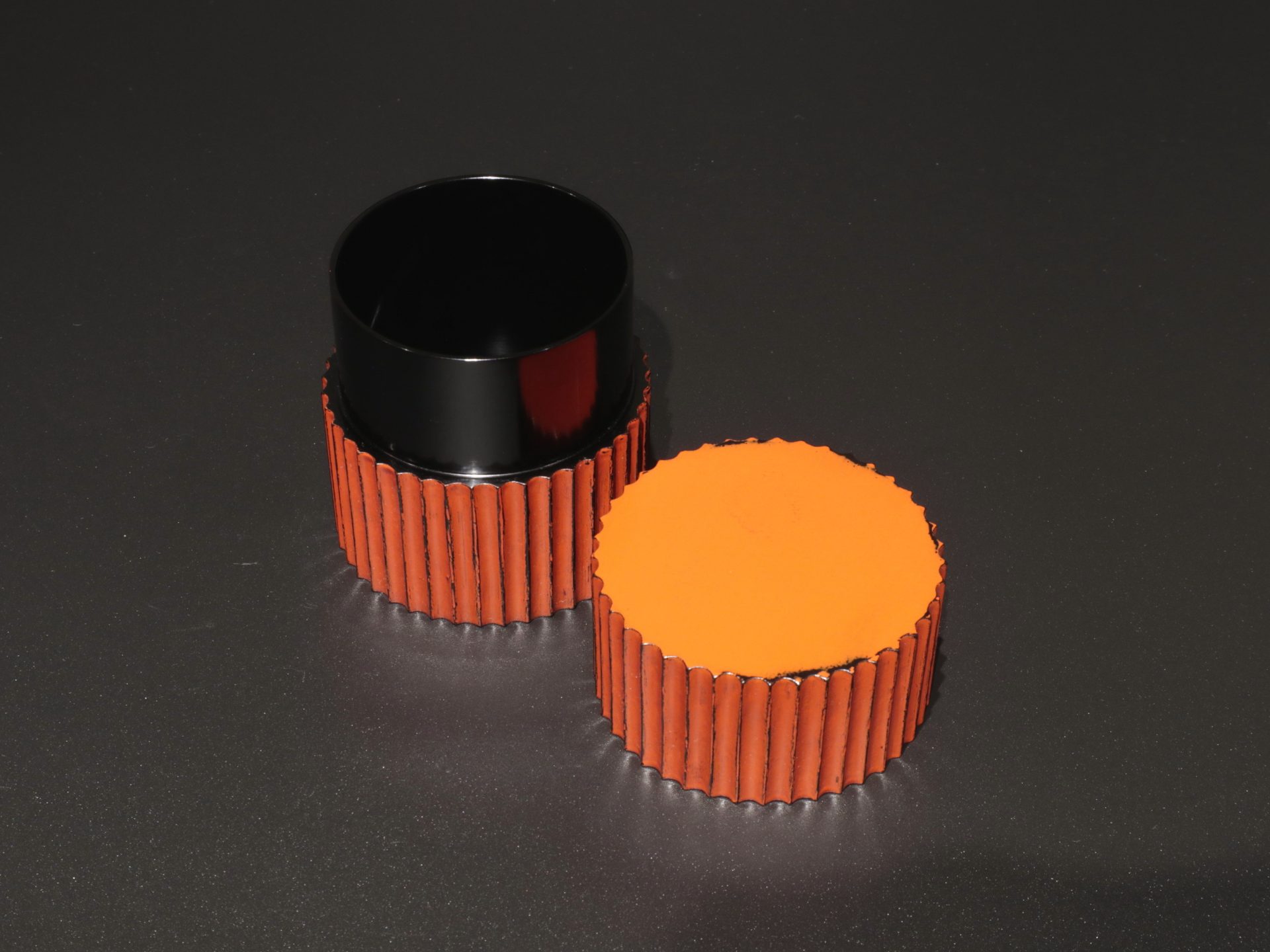 村瀬治兵衛さんの根来塗線刻中次。柔らかい発色の格調高い根来塗に、繊細ながらも強靭な雰囲気の線刻紋。凛とした佇まいの筒中次形で、身と蓋は吸い付くような感覚の絶妙な造りとなっています。伝統的な造形でありながら、現代の茶の湯空間を創造させてくれるシンプルでスタイリッシュな佇まいです。