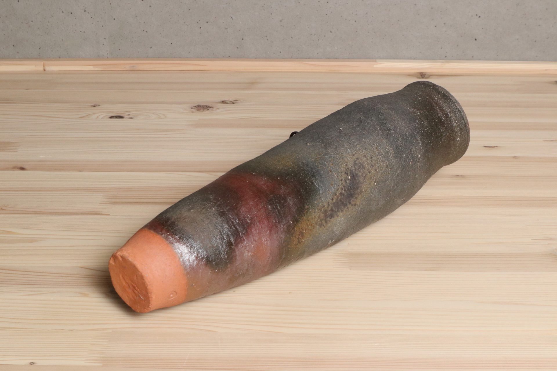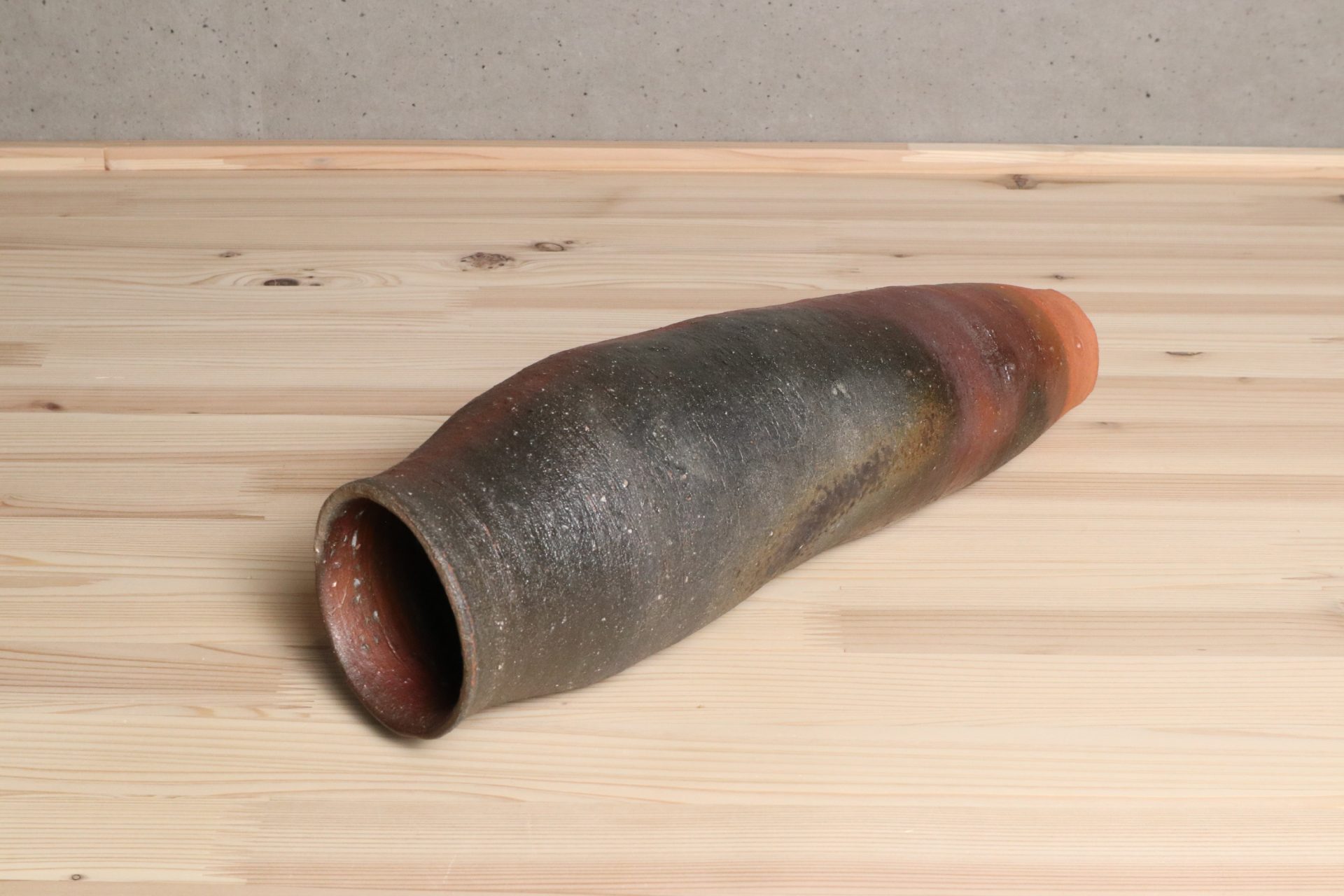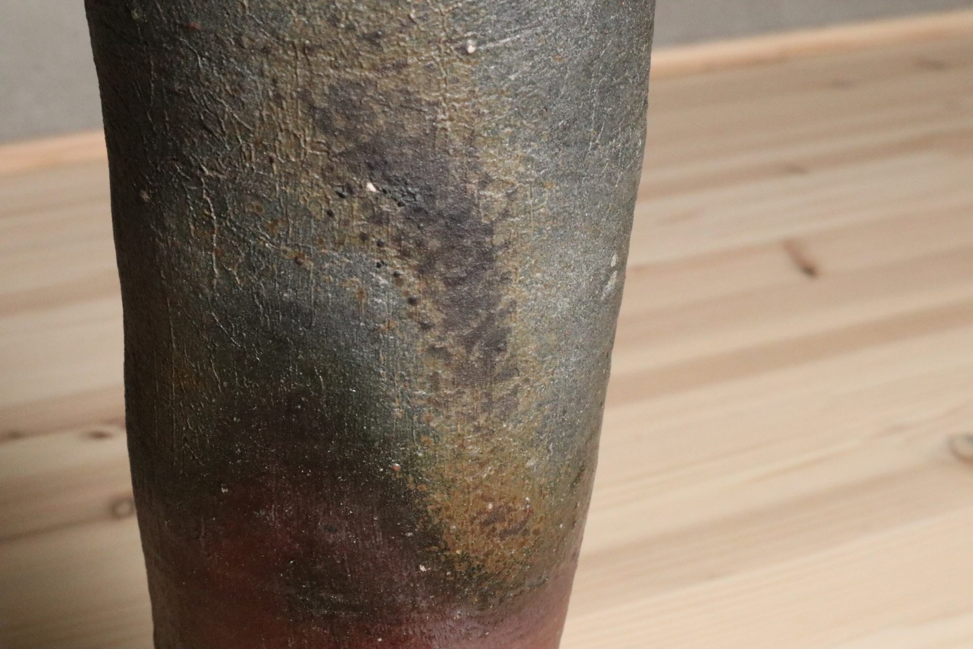 金重有邦さんの伊部掛花入です。じっくりと時間をかけて轆轤成形された、揺らぎを伴いつつ立ち上げられた細筒型の成形。しっとりとした火色、黄胡麻に枯せた灰被りなど、野性味ある迫力ある表情となっています。