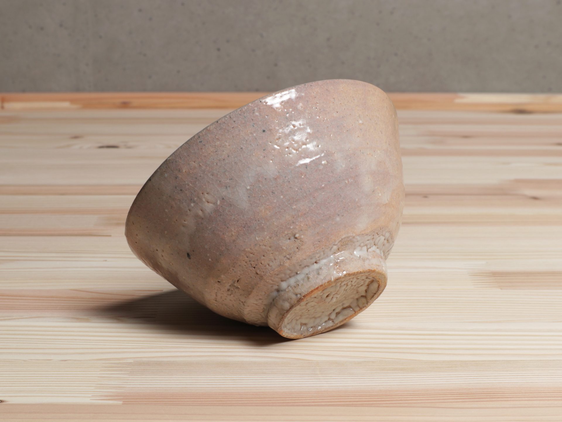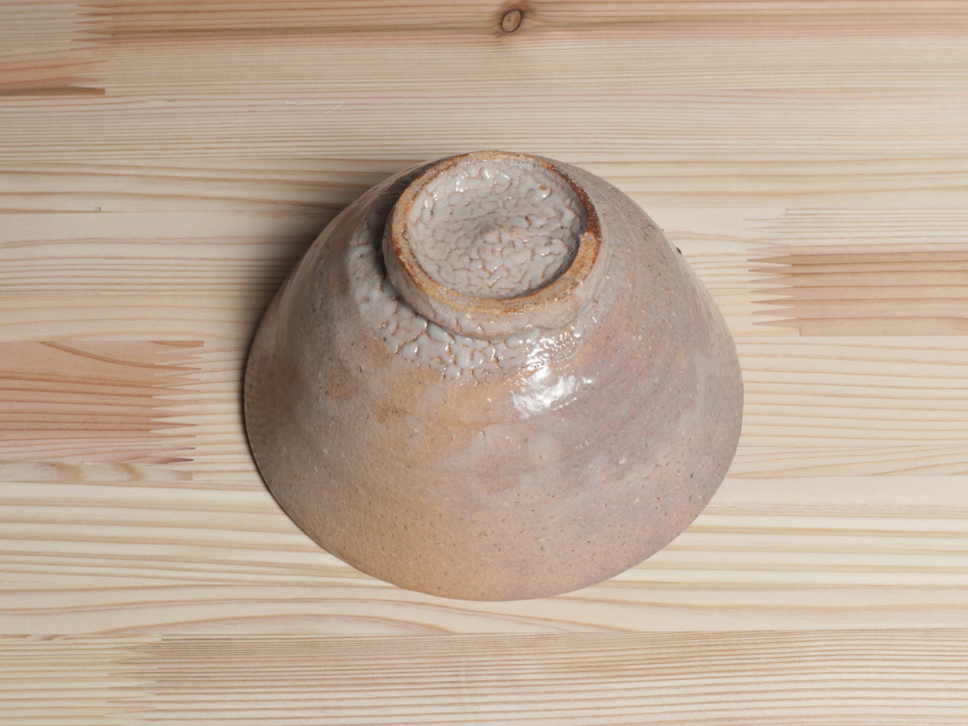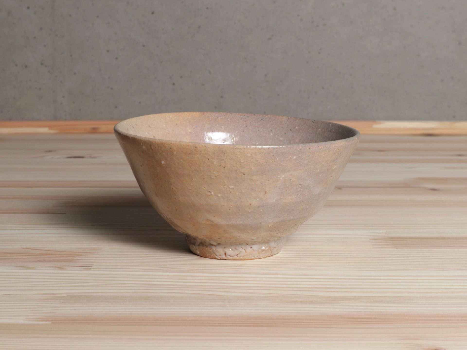 藤ノ木土平さんの唐津茶碗です。小井戸のような浅い杉形のフォルム。酸化と還元による片身替わりの釉調は、しっとりと人肌の温もりを感じます。見込みの目跡や、風情ある梅花皮も魅力があり、使い込むほどの育ちが楽しみな一碗です。