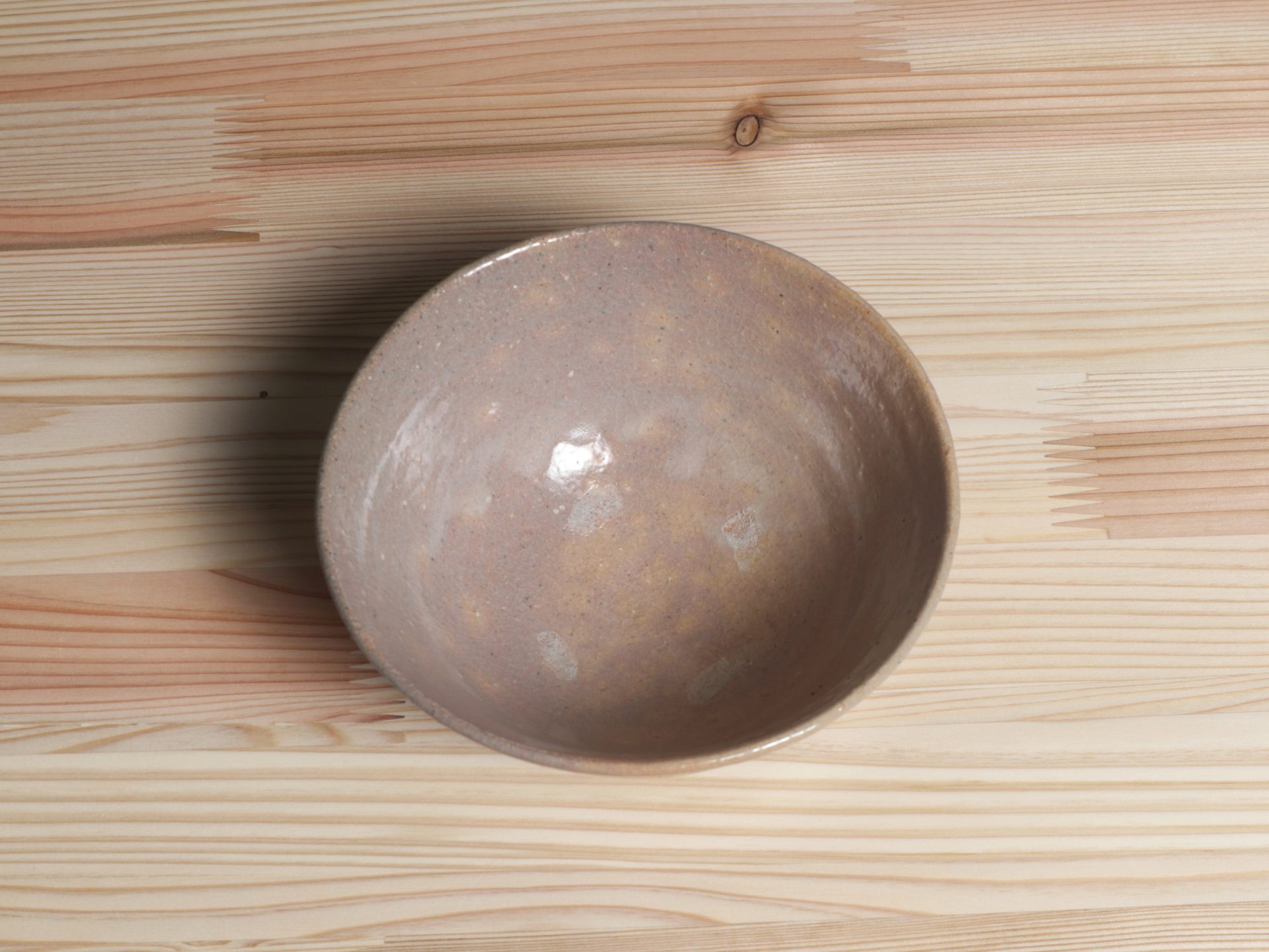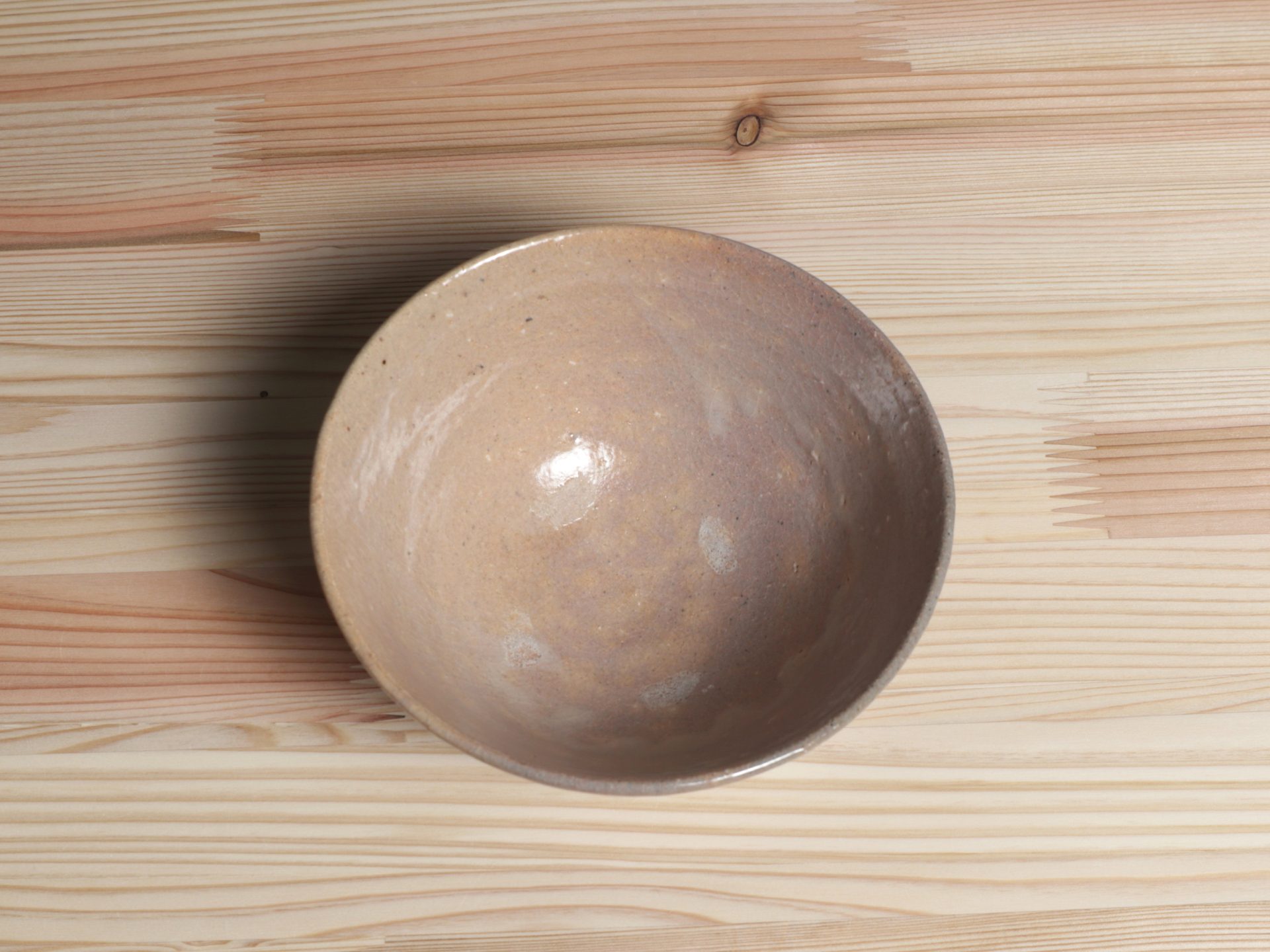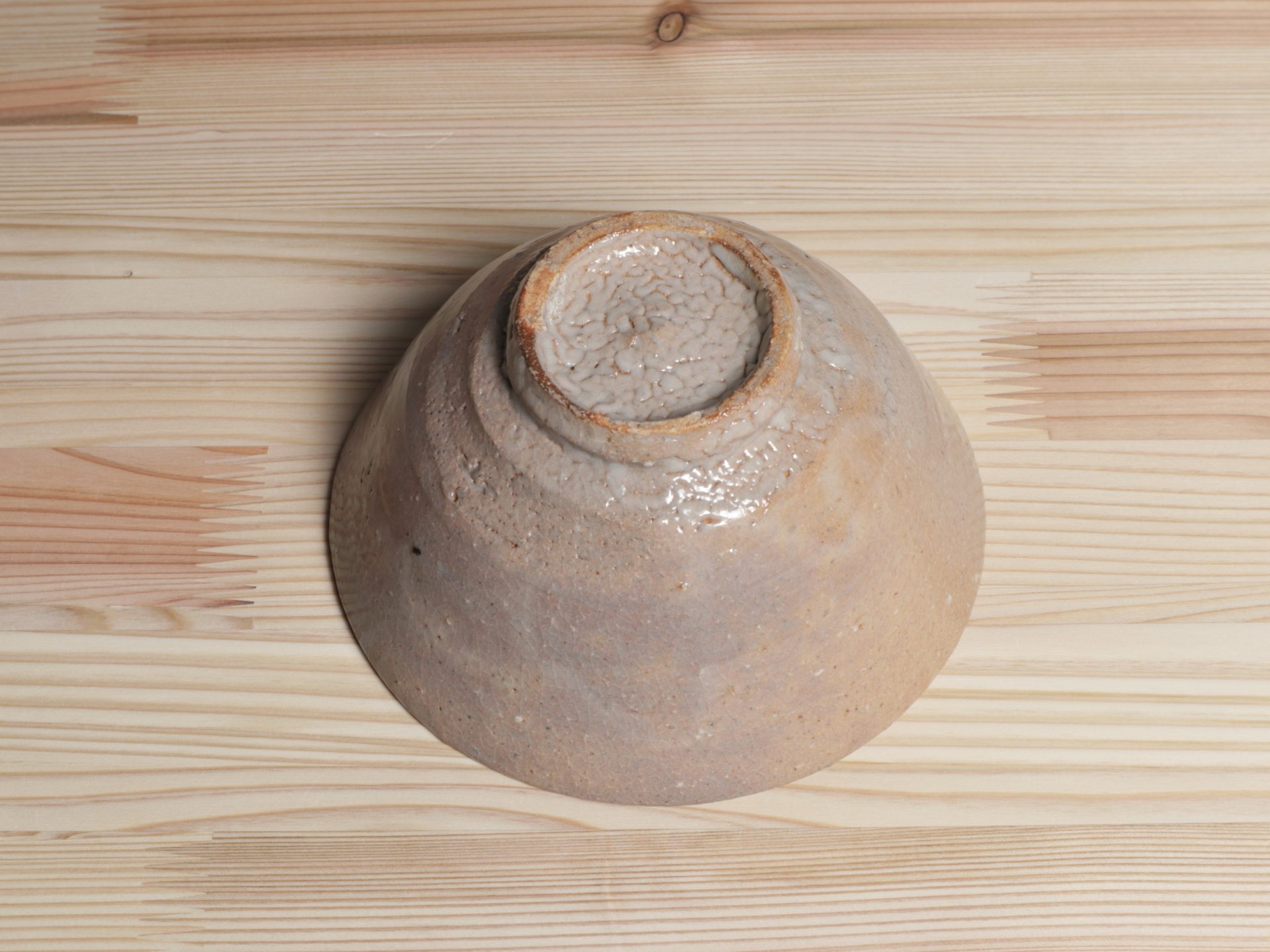 藤ノ木土平さんの唐津茶碗です。小井戸のような浅い杉形のフォルム。酸化と還元による片身替わりの釉調は、しっとりと人肌の温もりを感じます。見込みの目跡や、風情ある梅花皮も魅力があり、使い込むほどの育ちが楽しみな一碗です。