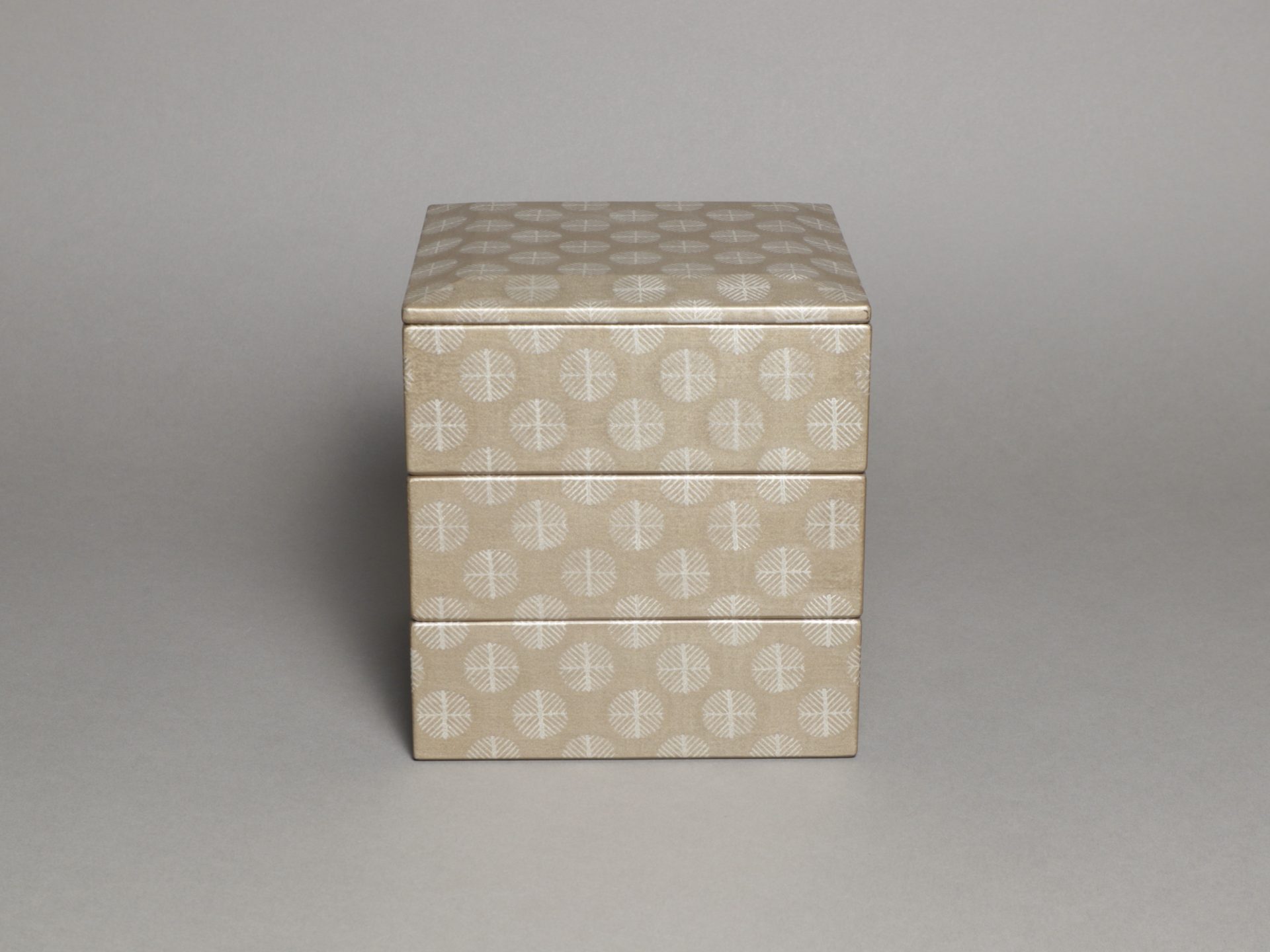 吉野杉を用いた三段重。木地に麻布と和紙を貼ることで柔らかい風合い引き出し、印判蒔絵による唐松の意匠が素敵な雰囲気です。ハレの器としてだけでなく、日常の器として楽しんでいただければ。