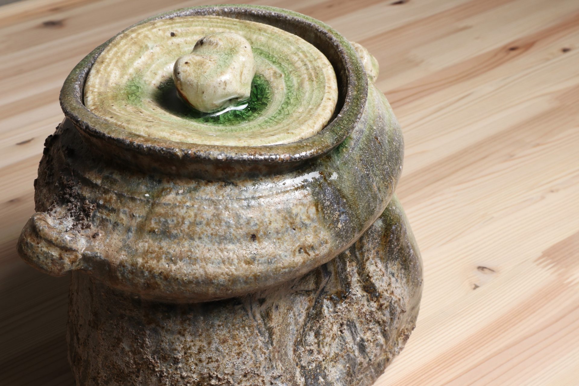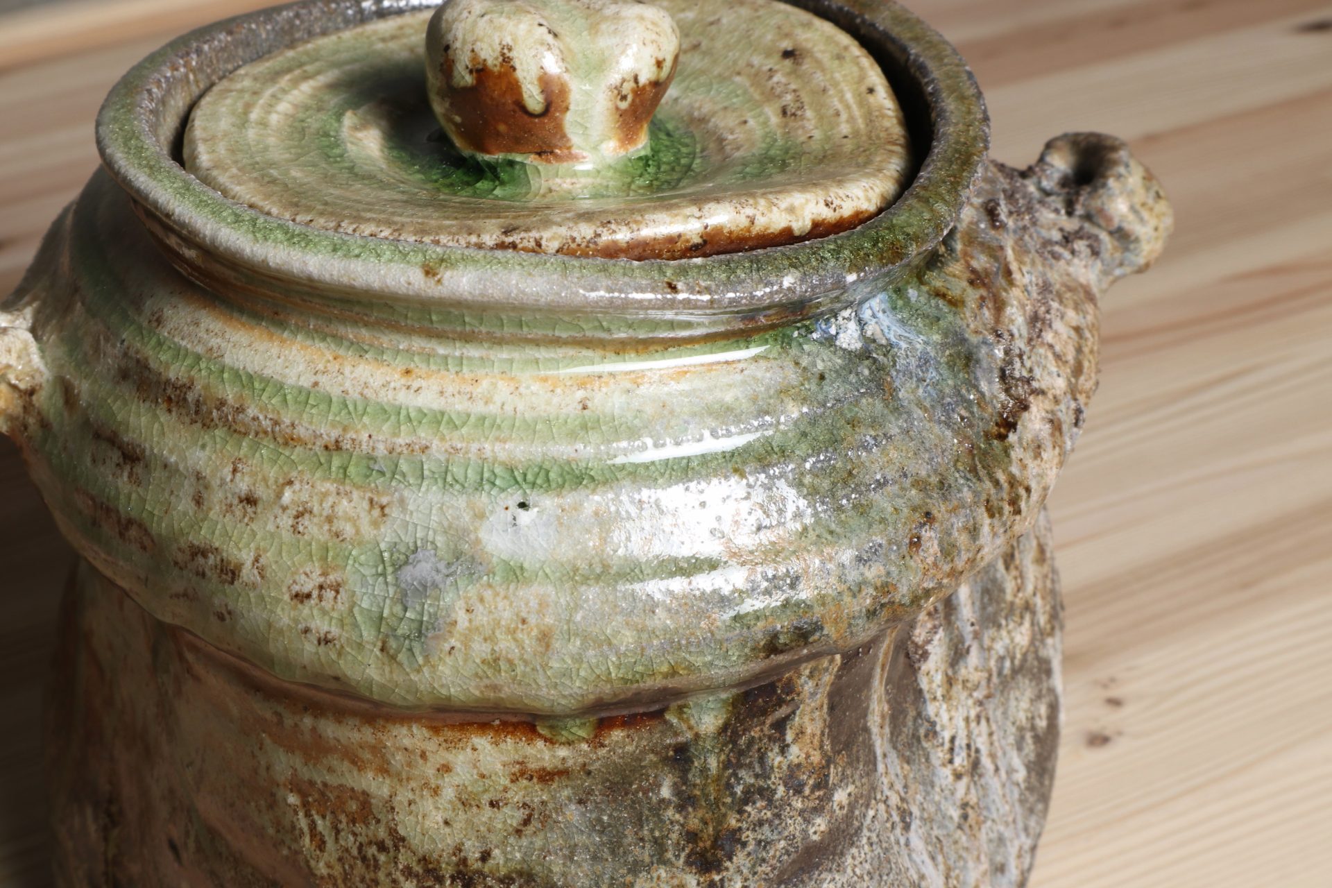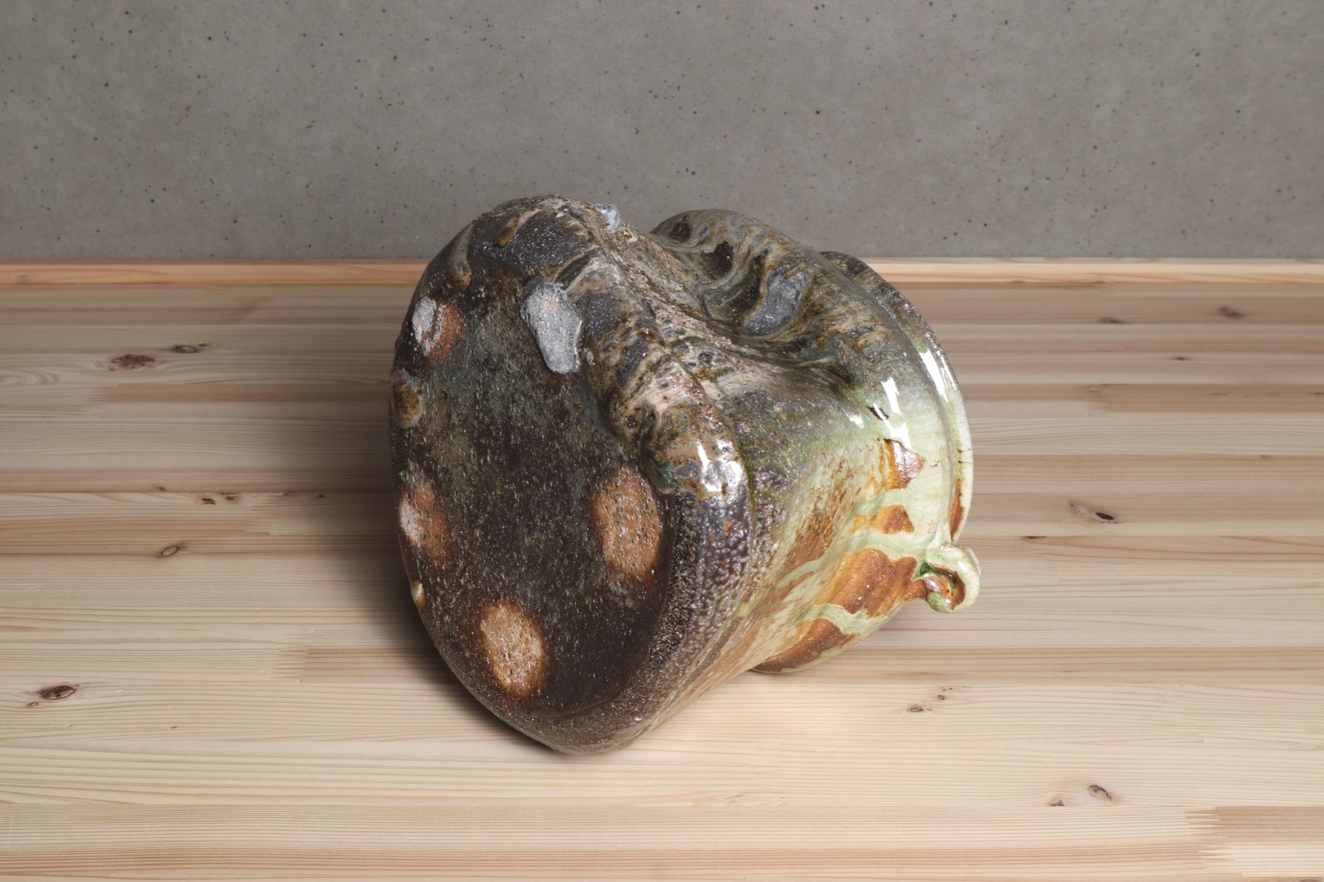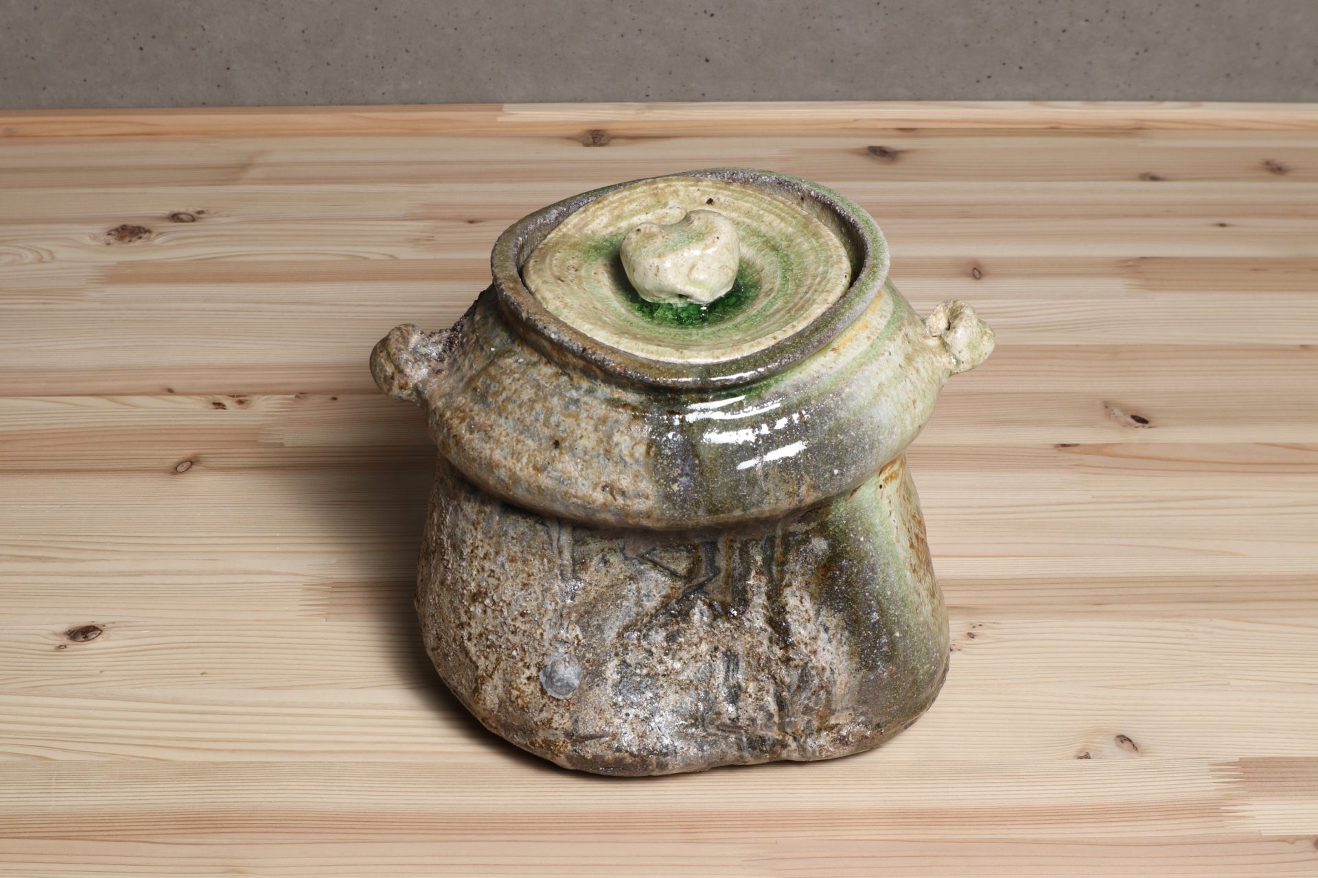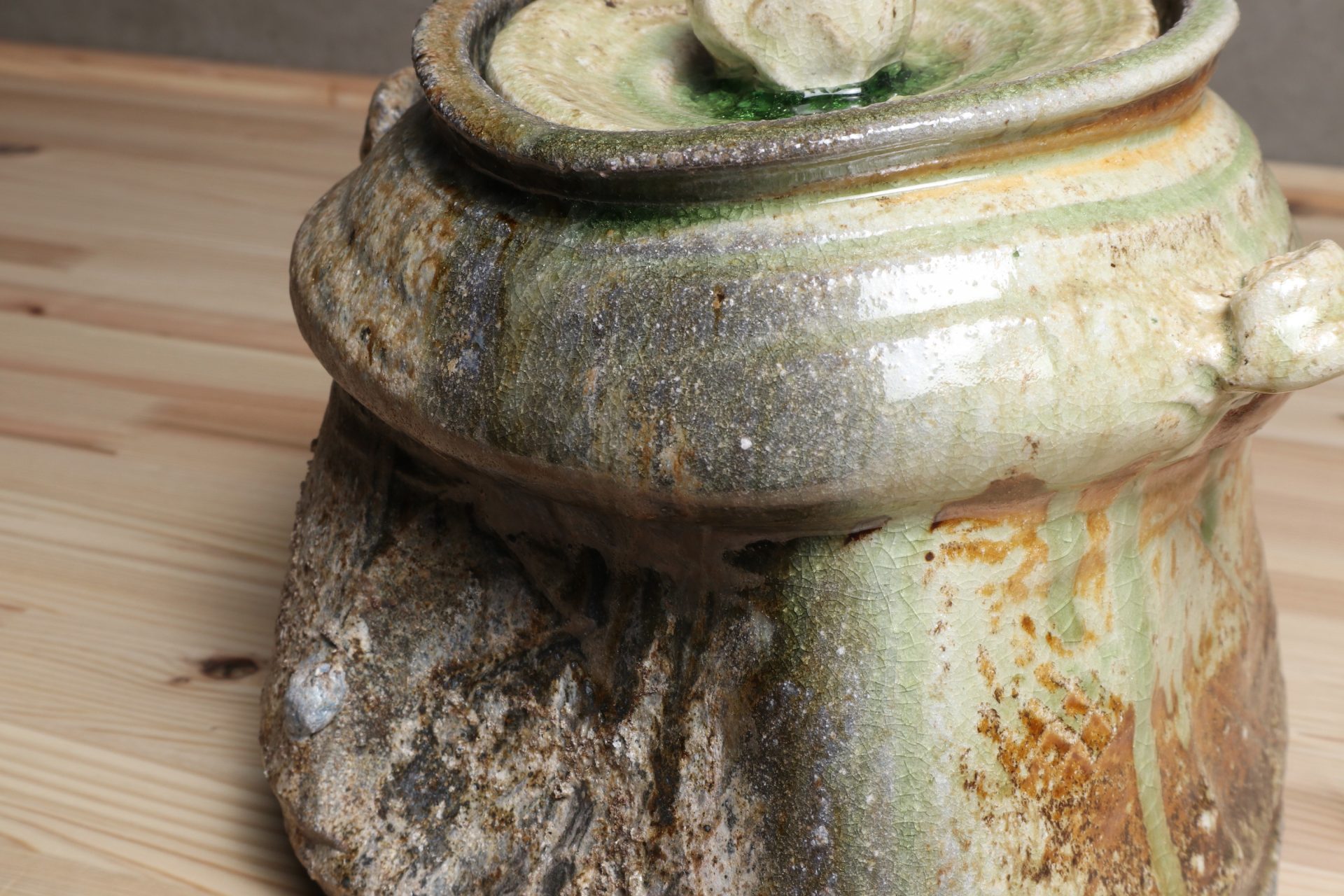 小島憲二さんの伊賀耳付水指です。強靭な巌のような造形に、枯れた風情の灰被とエメラルドグリーンの美しいビードロの景色。これぞ「最上の伊賀」という豪胆で格調高い佇まいです。旧作ですが新品未使用です。特別価格でのご紹介です。