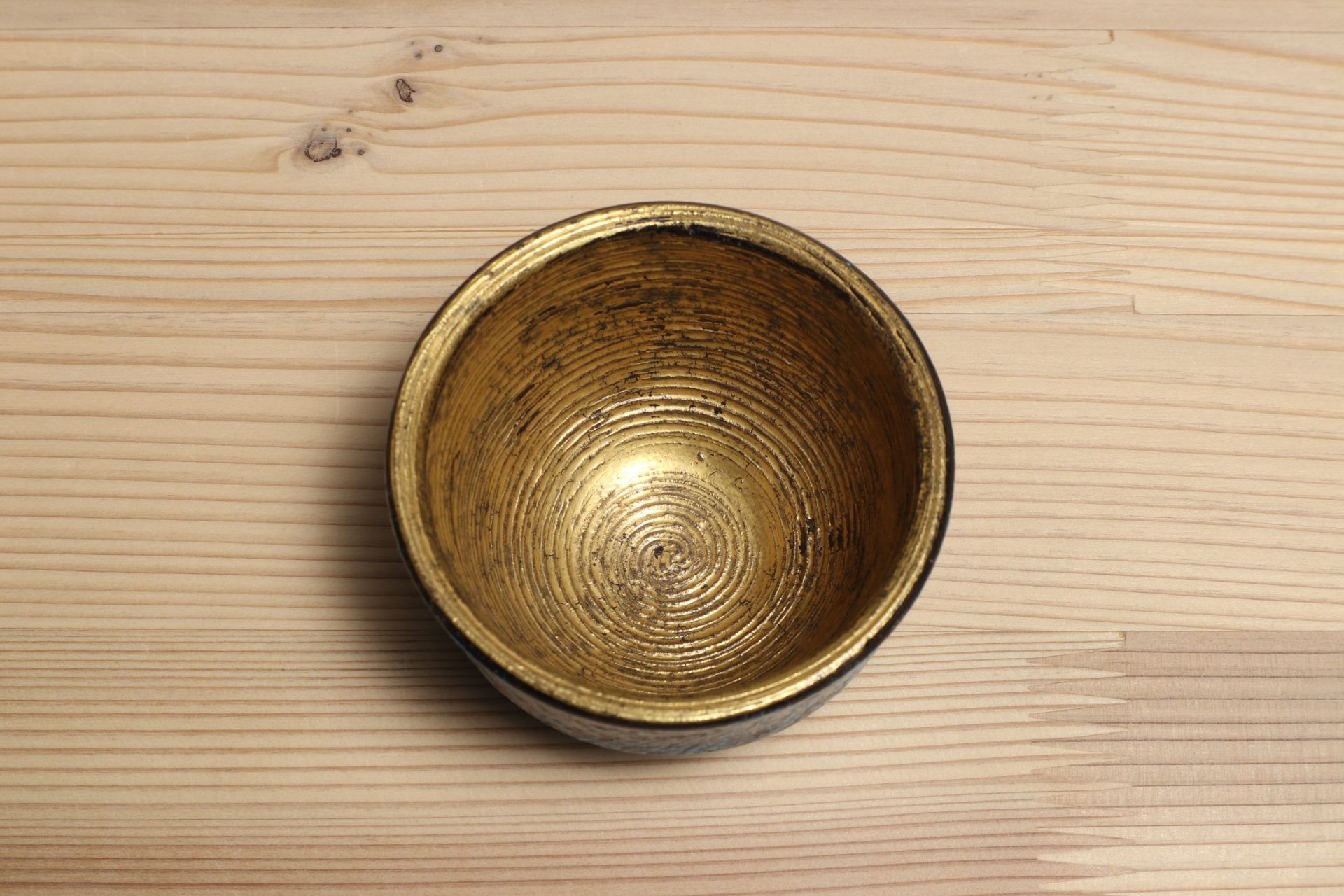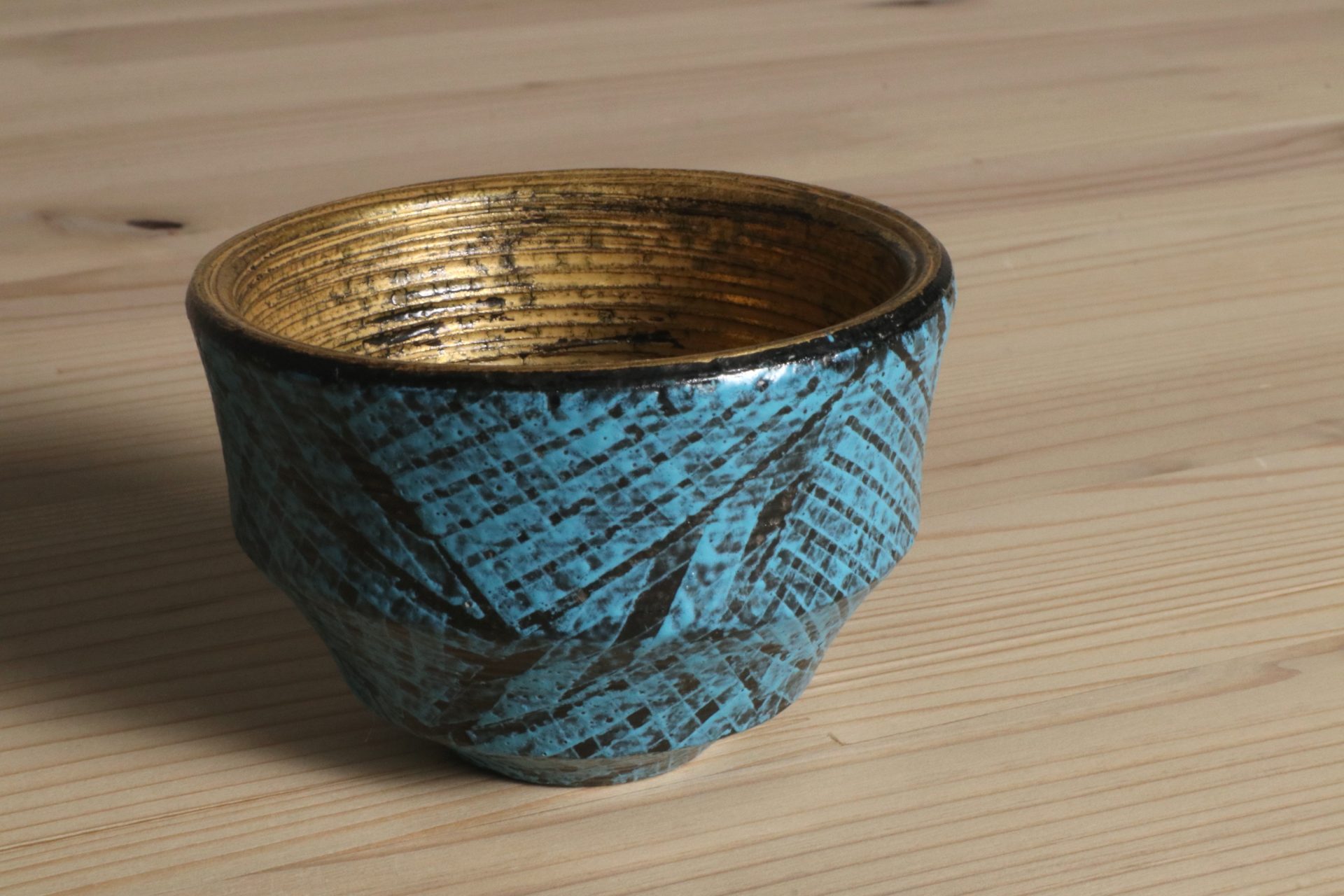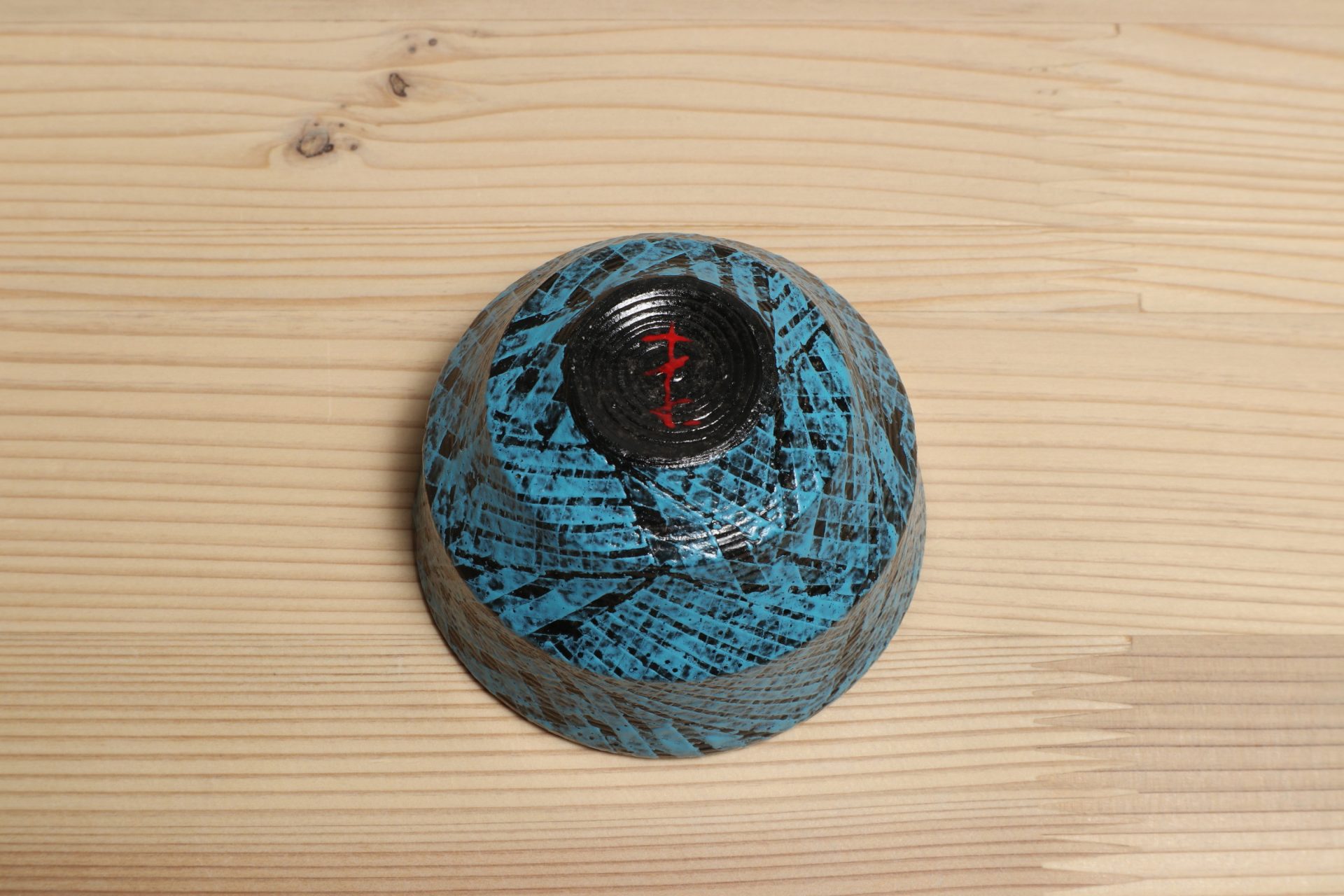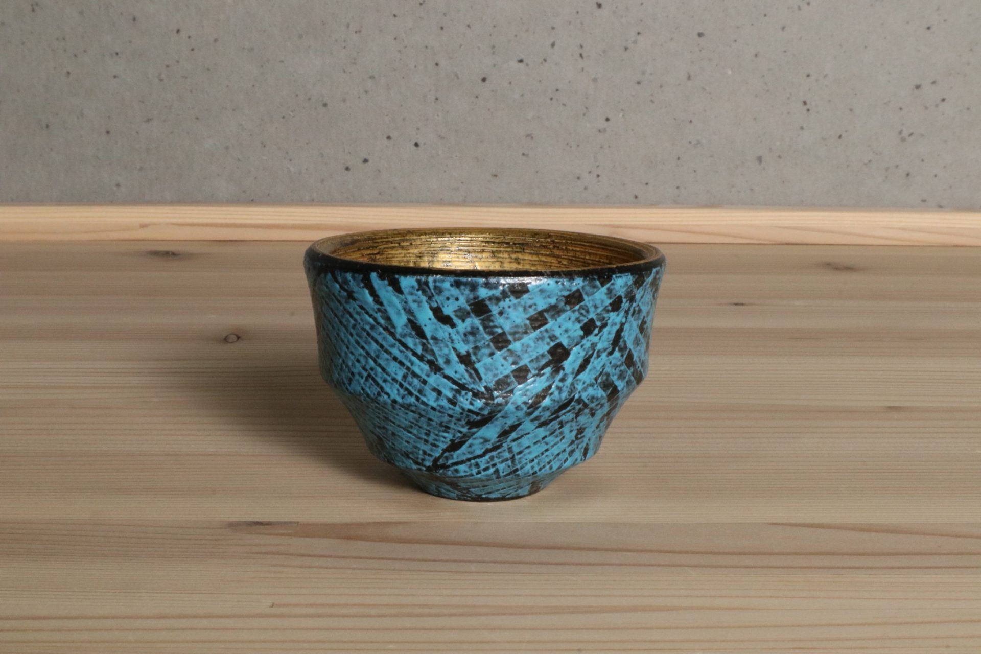 前田正博さんの白磁をキャンバスに市松文様をモチーフとしたぐい呑。マスキングにより何度も色を塗り重ねて焼成を繰り返すことで、黒とブルーがポップで枯せた意匠に。見込みは黒と金の根来風の仕上げになっています。