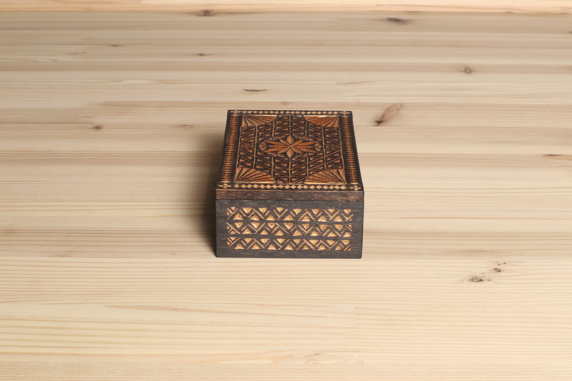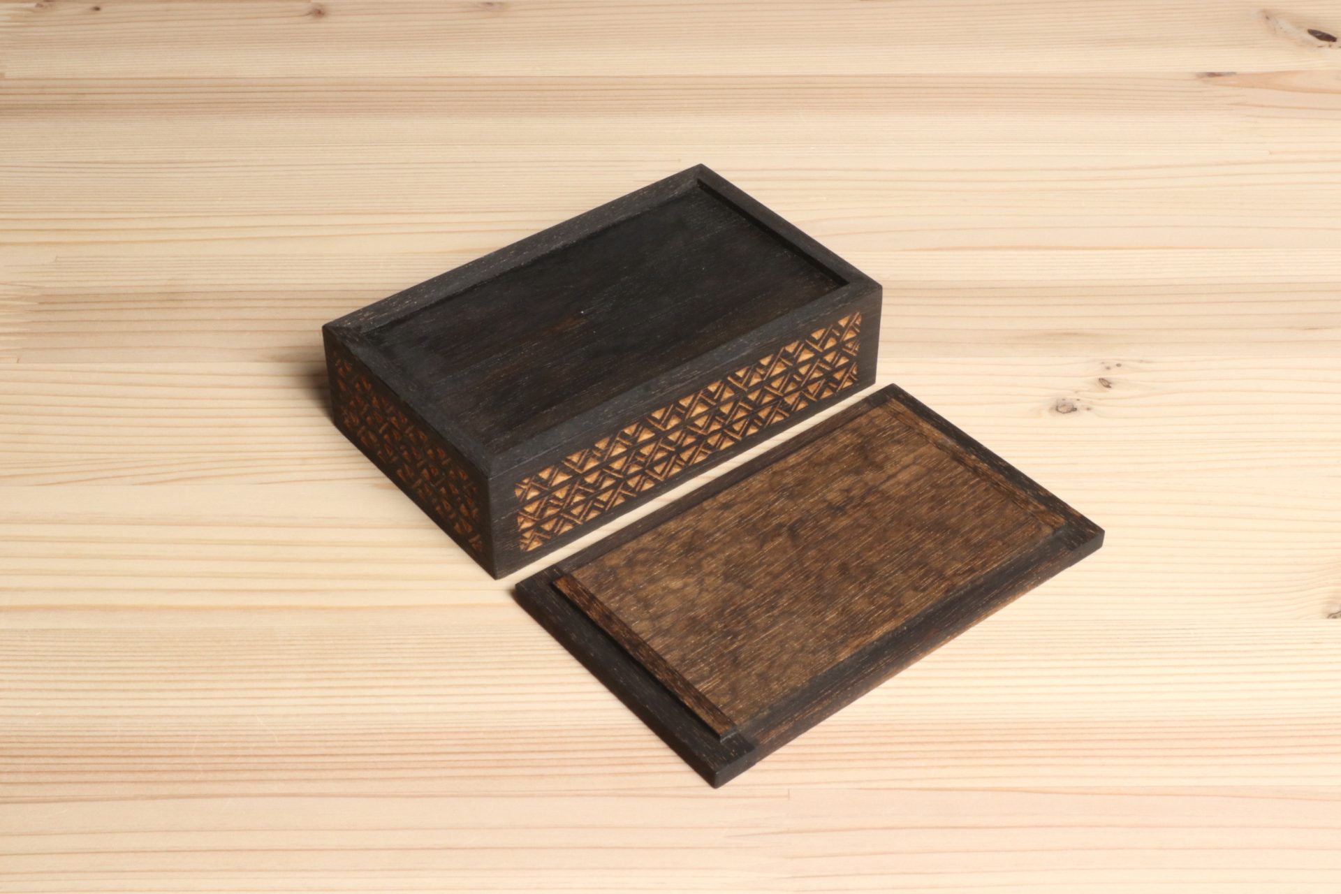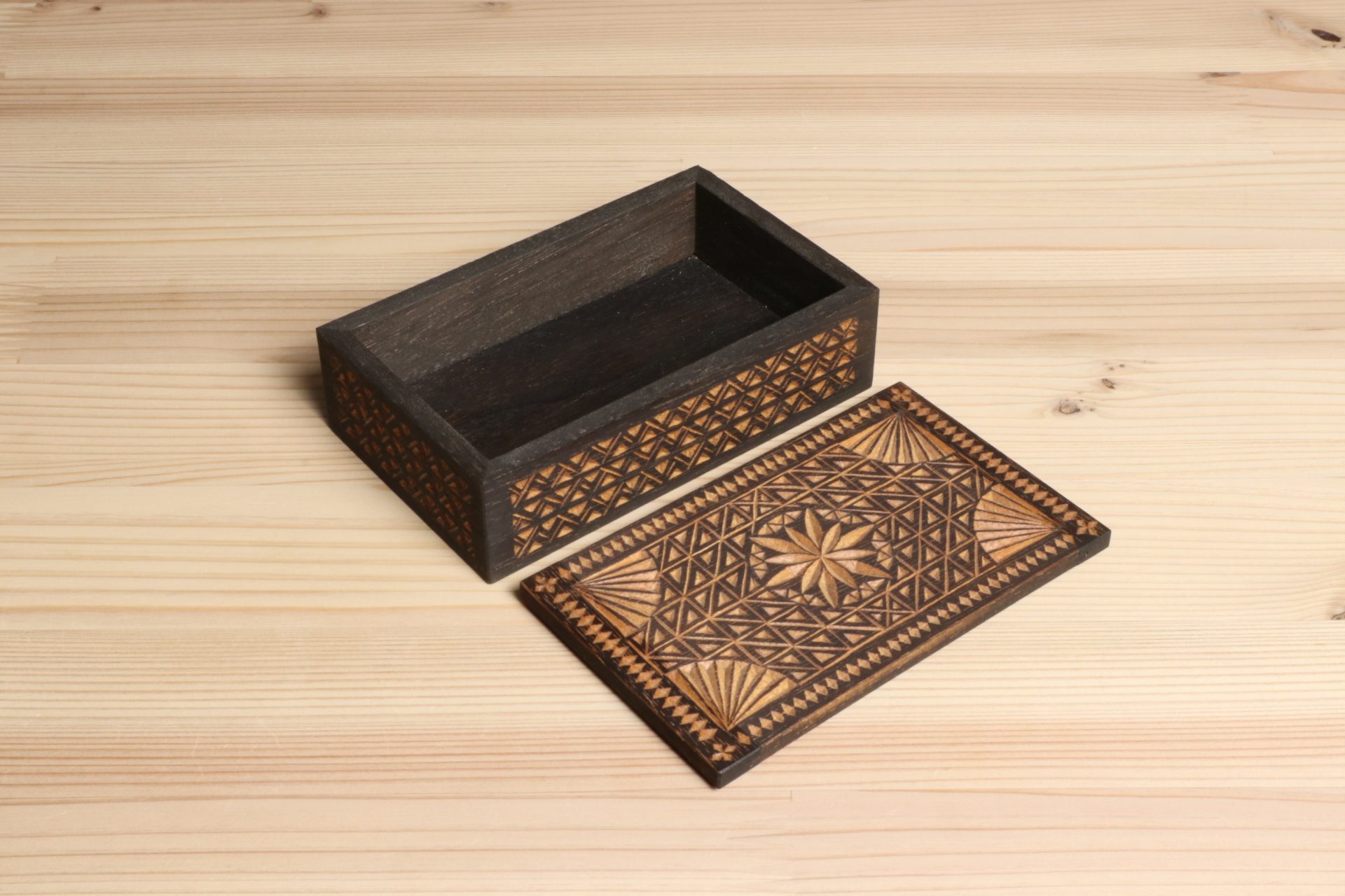 泉健太郎さんの胡桃草木染木彫箱です。胡桃材による名刺がちょうど収まるほどの小さな長方箱です。草木染による落ち着いた色調に、丹念に手彫りされた幾何学的な洗練された意匠となっています。