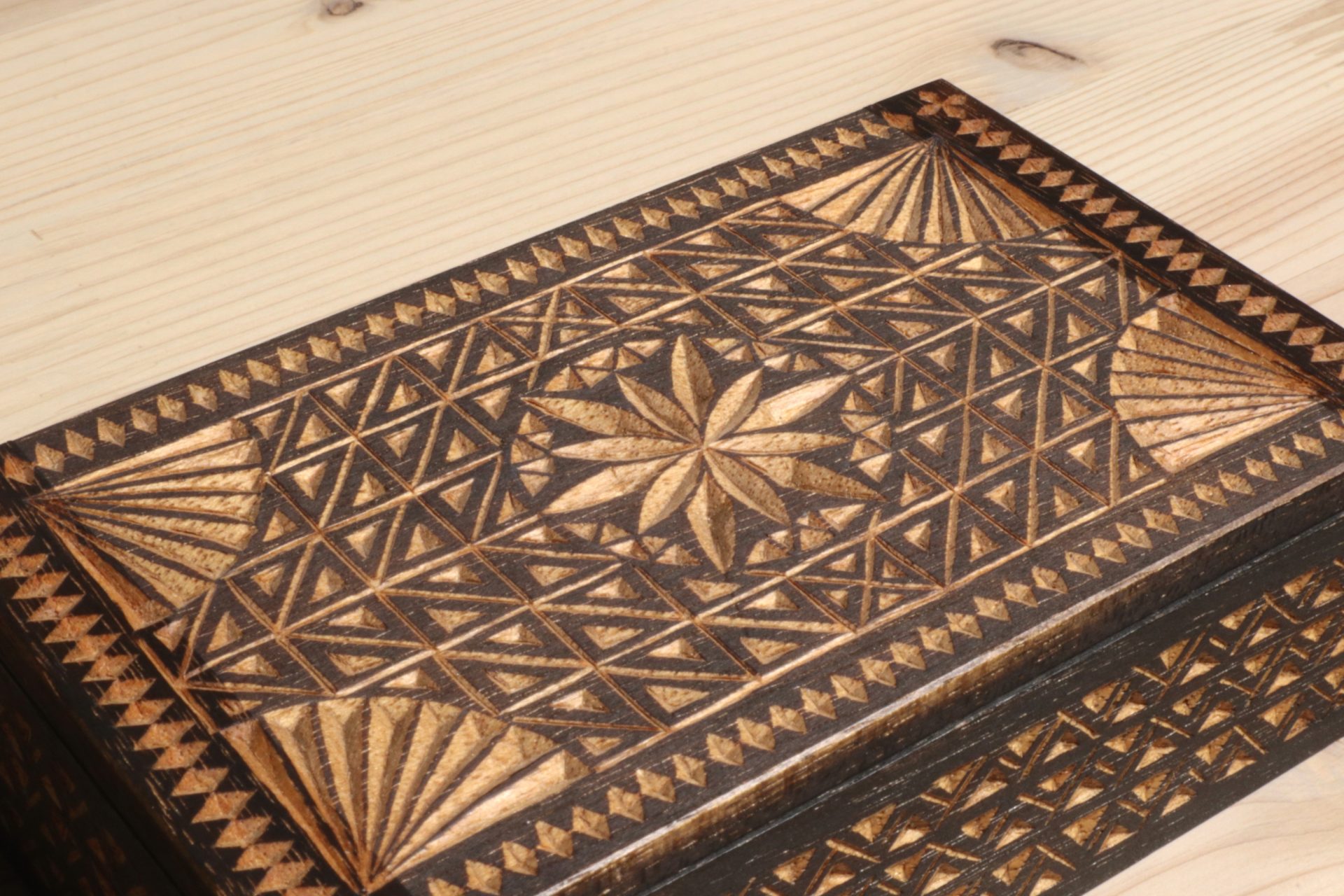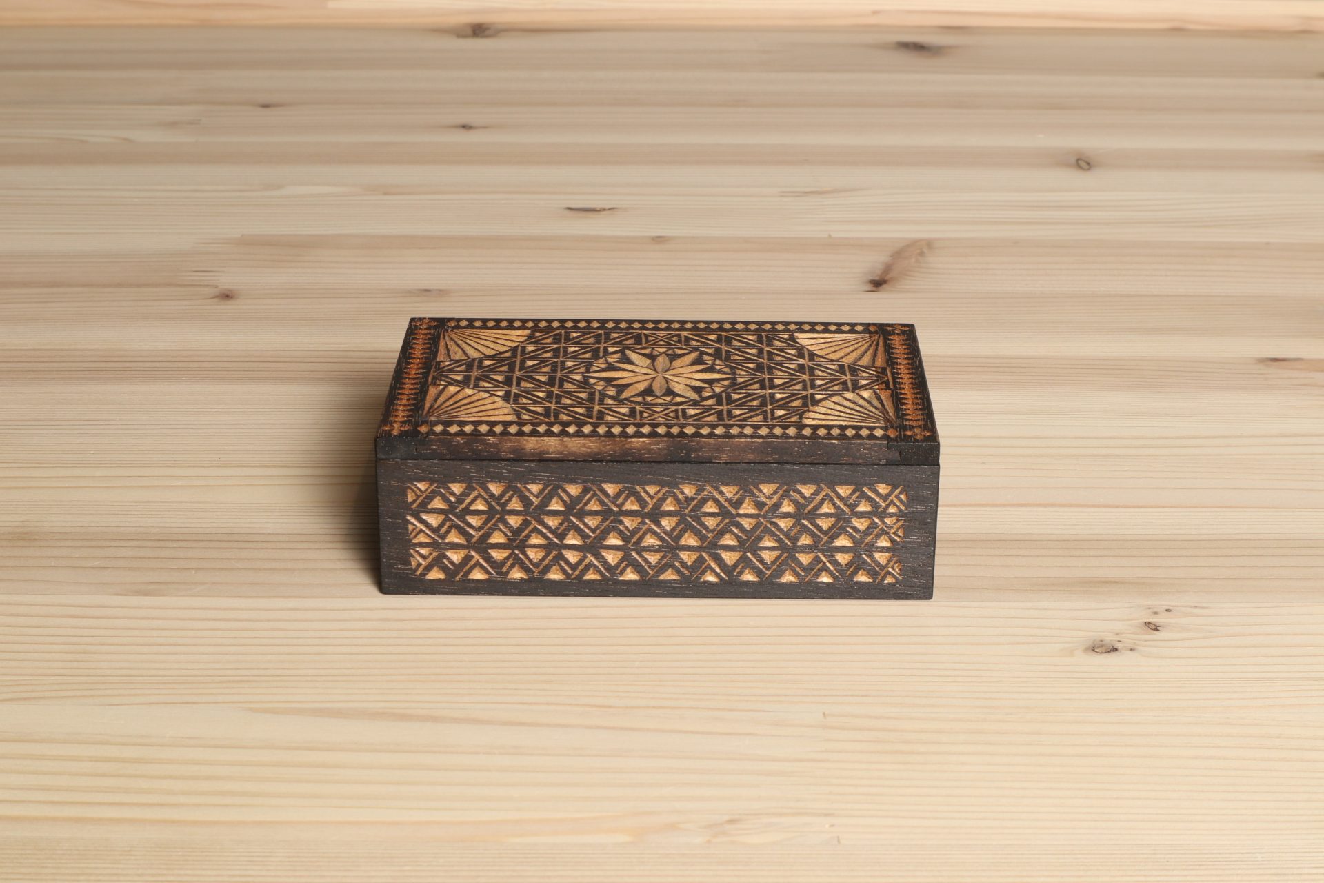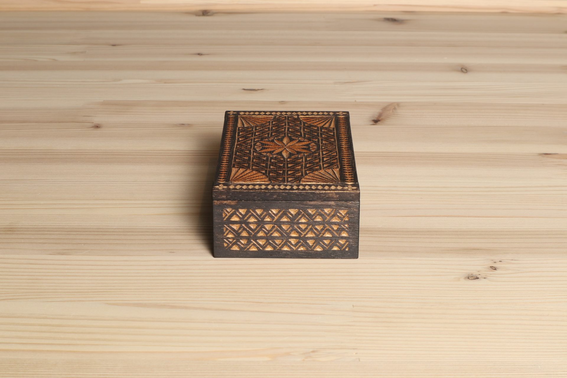 泉健太郎さんの胡桃草木染木彫箱です。胡桃材による名刺がちょうど収まるほどの小さな長方箱です。草木染による落ち着いた色調に、丹念に手彫りされた幾何学的な洗練された意匠となっています。