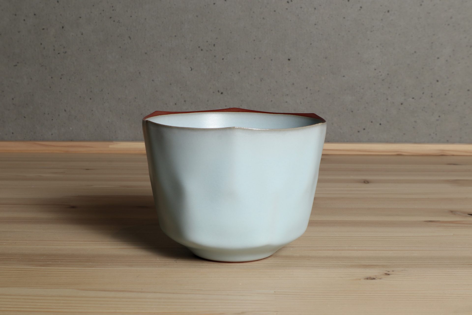 【 志賀暁吉陶展 】の出品作です。無貫入の青瓷面取茶碗。