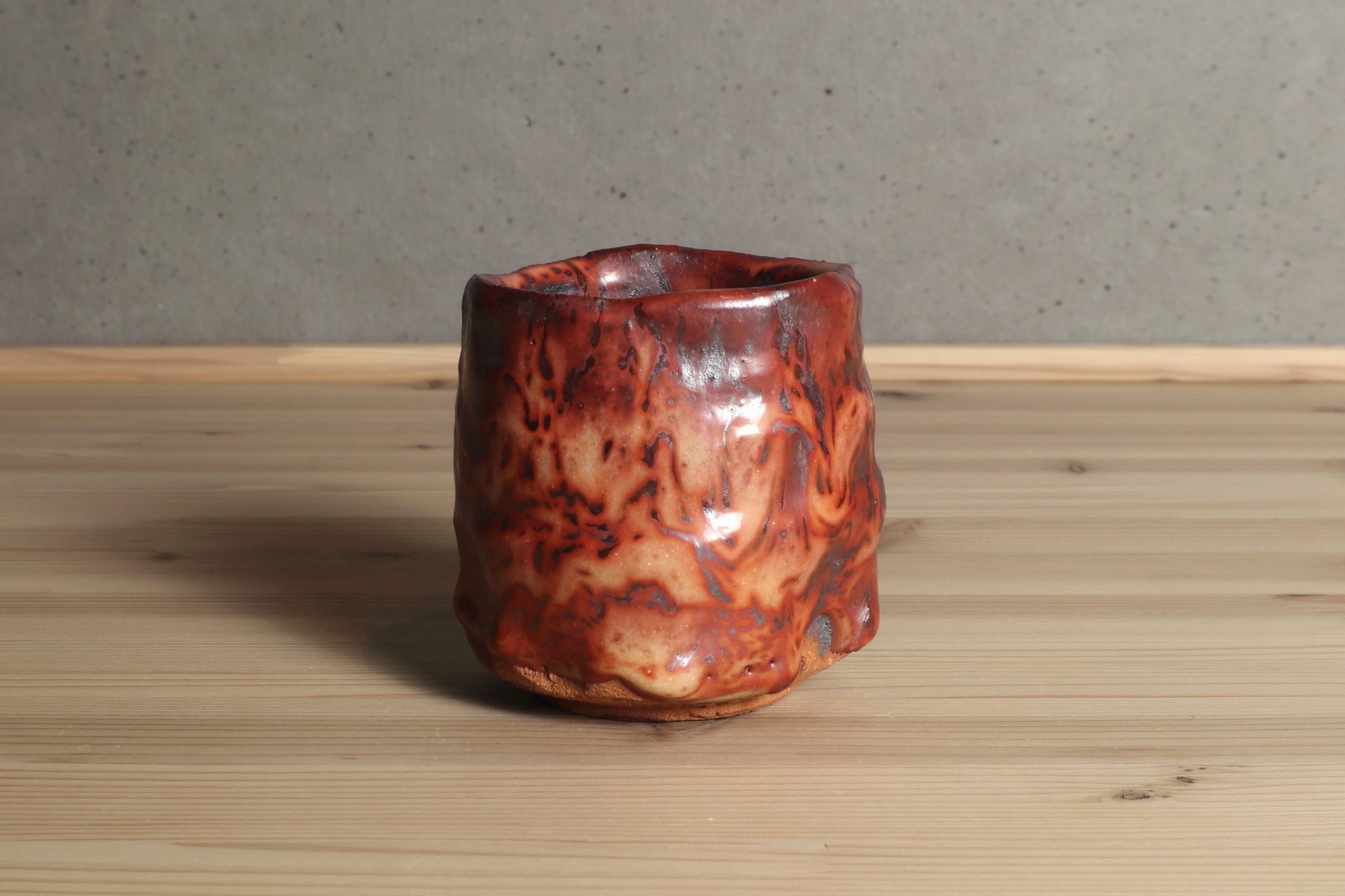 山田和さんの炎舞志野湯呑です。巧みなヘラ使いによる強靭な筒型のフォルムに、舞い上がる炎のような迫力ある釉景色が魅力です。