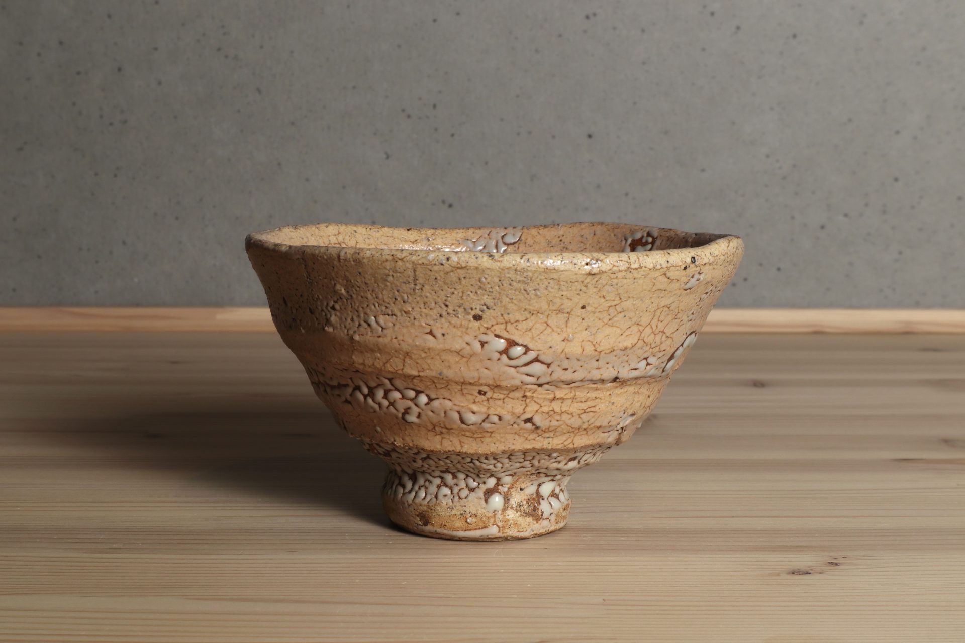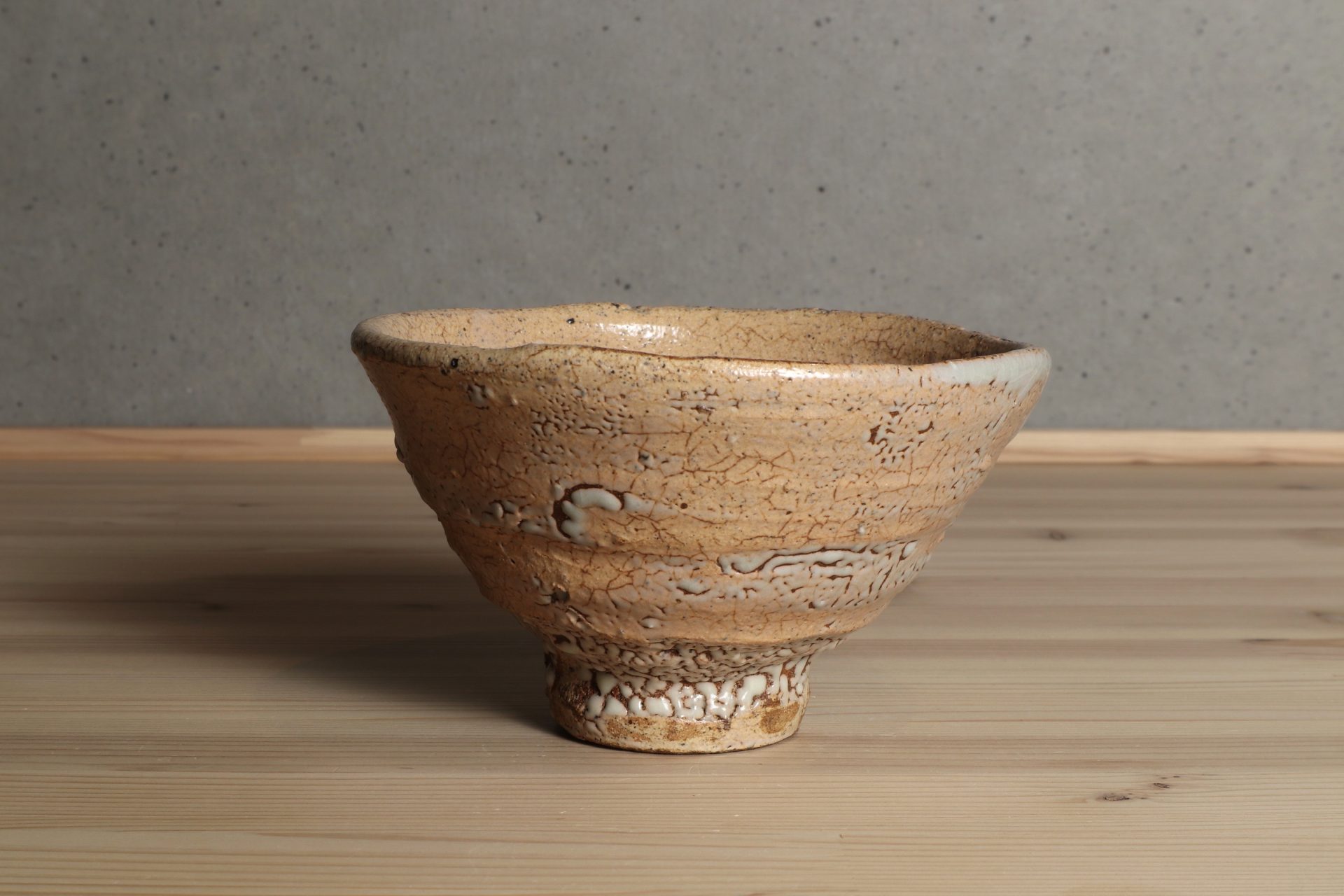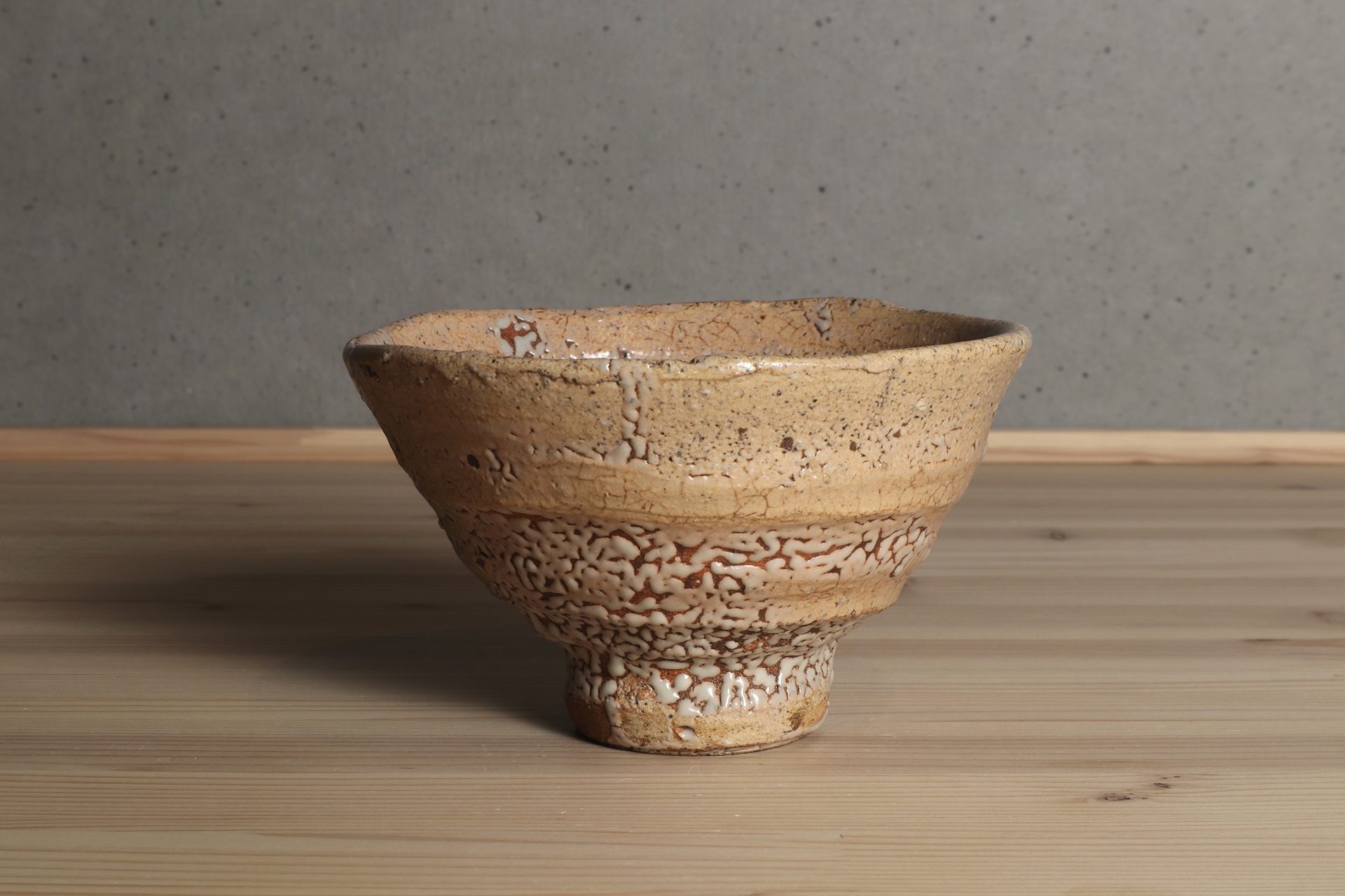 中村康平さんの井戸茶碗です。古陶から解釈した美のエッセンスを、工芸とアートが交錯した独自の概念で表現する「思考のうつわ」としての茶碗。「表現」を前提とした現代美術を手掛けてきた作家だからこその、特異なアプローチと茶碗観。「現代の古典」という独自のコンセプトに魅了されます。堂々たる井戸形の立ち姿に、詩情ある枯れた風情の釉調。豪胆な竹の節高台に梅花皮も魅力の茶碗です。
