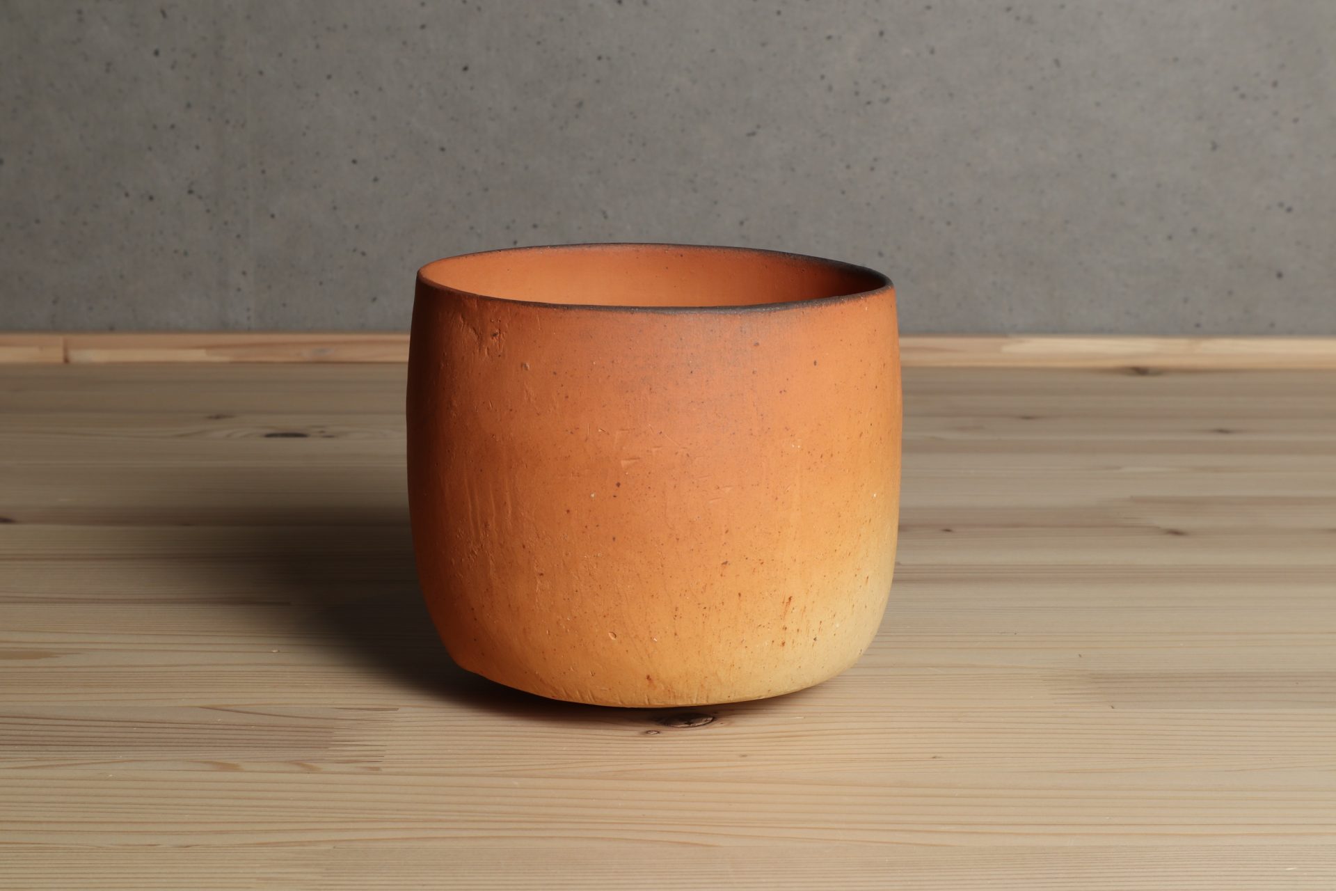 金重有邦さんの伊部志呂茶盌です。紐造りと轆轤による合わせ技で、じっくりと時間をかけて成形された筒型のフォルム。丹念に丁寧に、最良の道具である自身の手指を使って、土肌を撫でるように繊細に形を整えていきます。独自の土窯でじっくりと焼成された備前土は、しっとりとした淡い緋色に。寡黙ながらも饒舌な、シンプルながらも多くの時間と手間を積み重ねることで生まれる、ただ単純に茶を喫するための茶碗。ですが、そこに普遍的な「美」を感じます。焼き物という範疇を超えた、現代美術のエッセンスを感じる茶碗です。