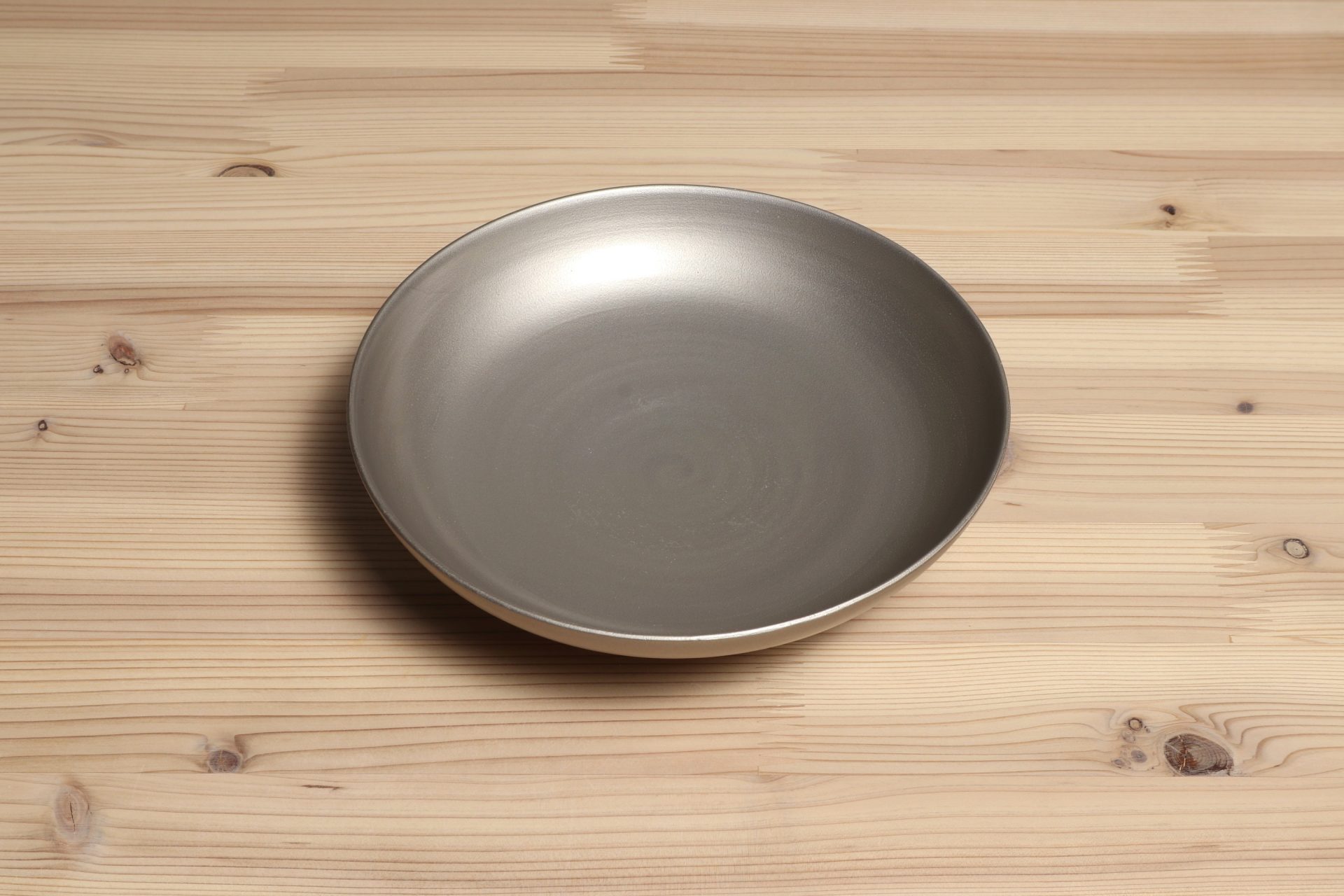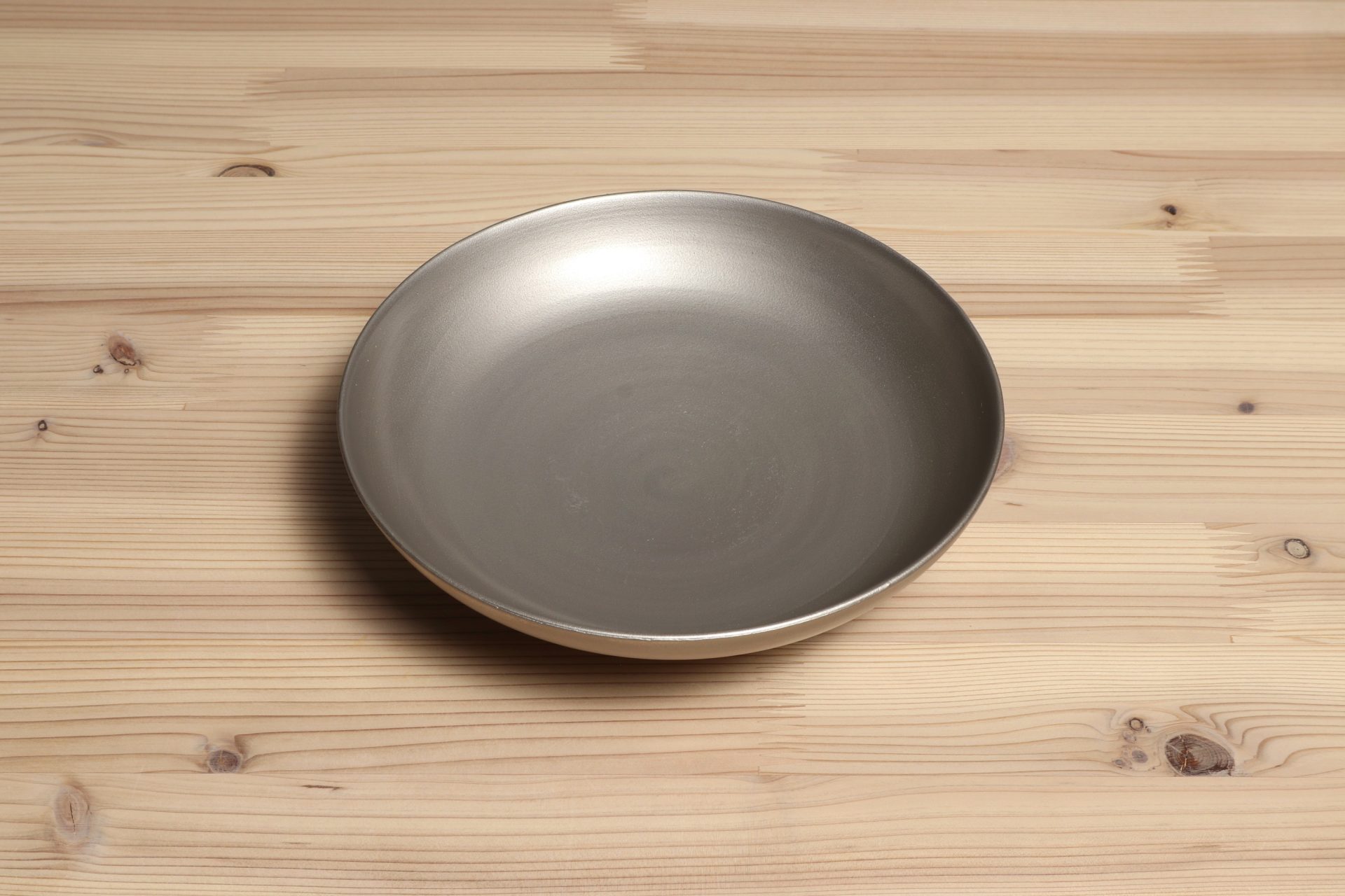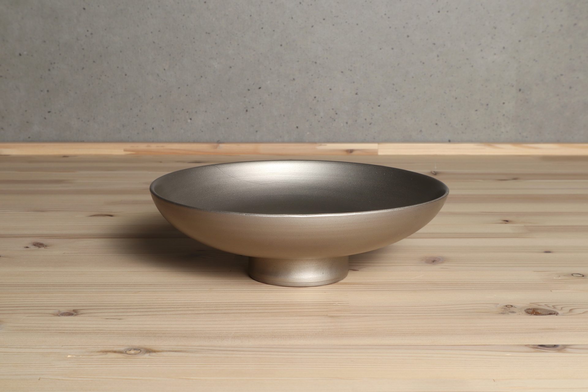 山田晶さんのプラチナ彩高坏皿です。2㎝ほどの少し高い高台が付けられたシンプルな丸皿。落ち着いたマットな光沢のプラチナ彩がモダンな風韻です。
