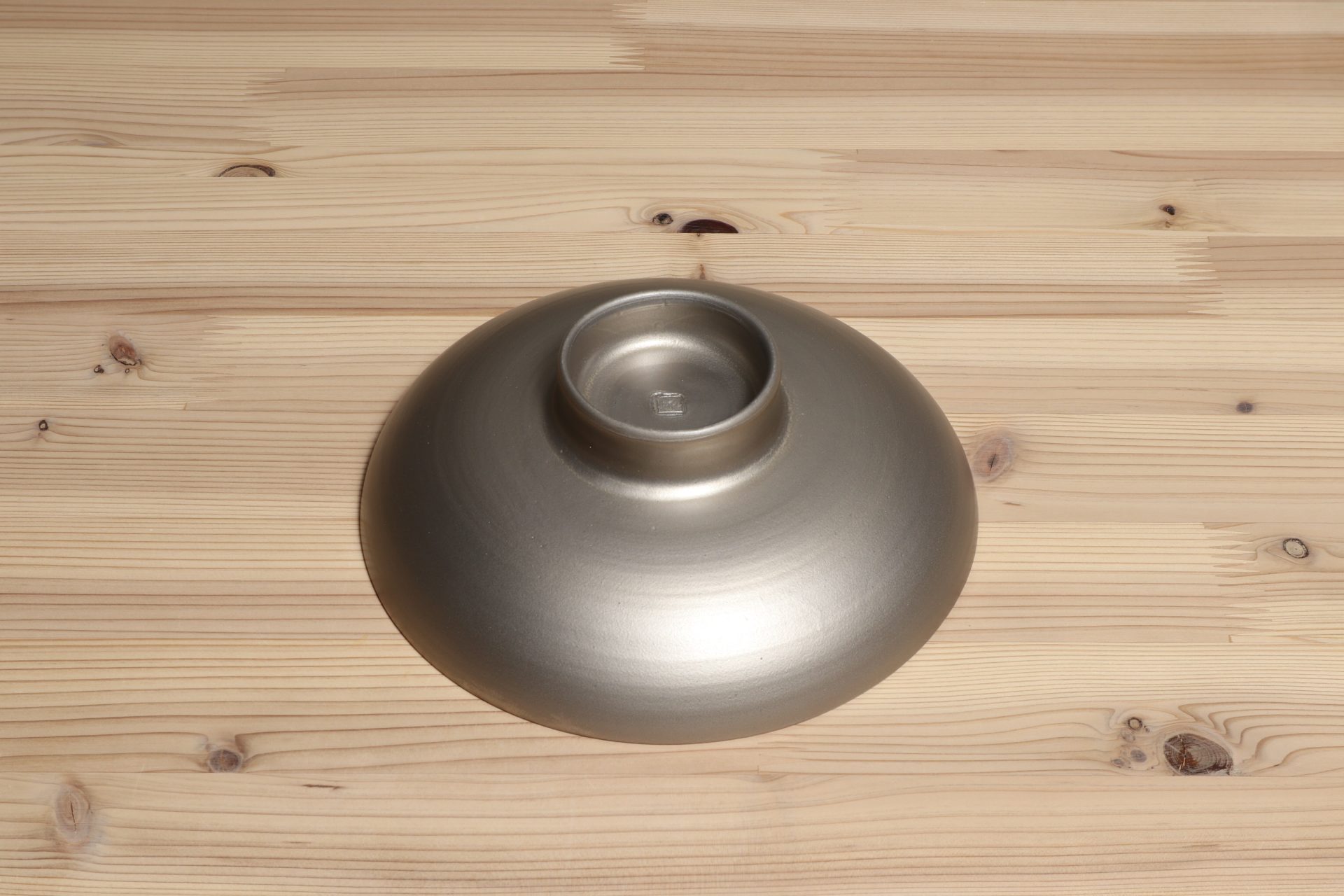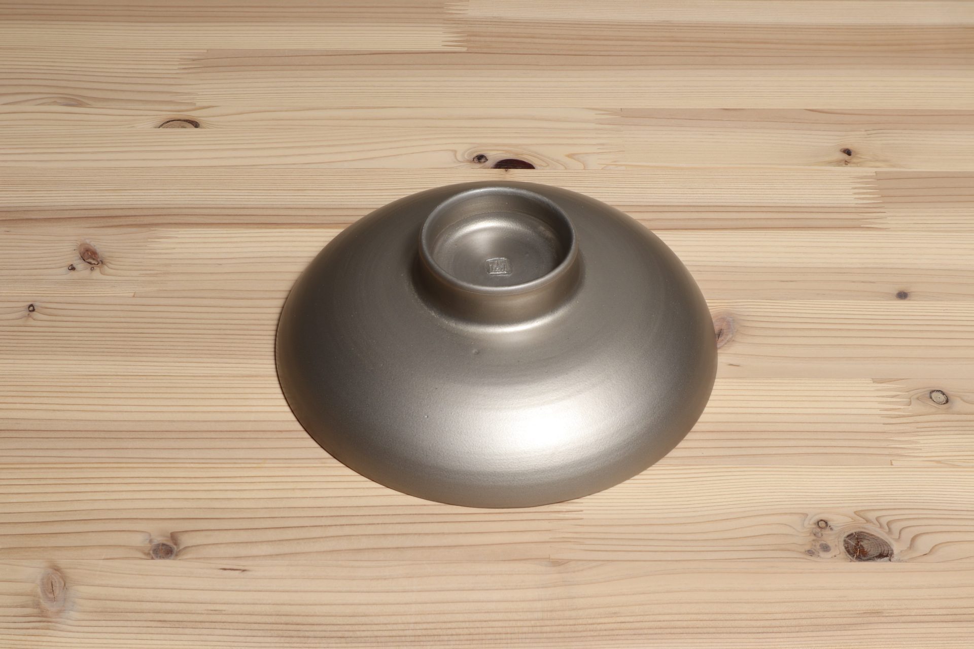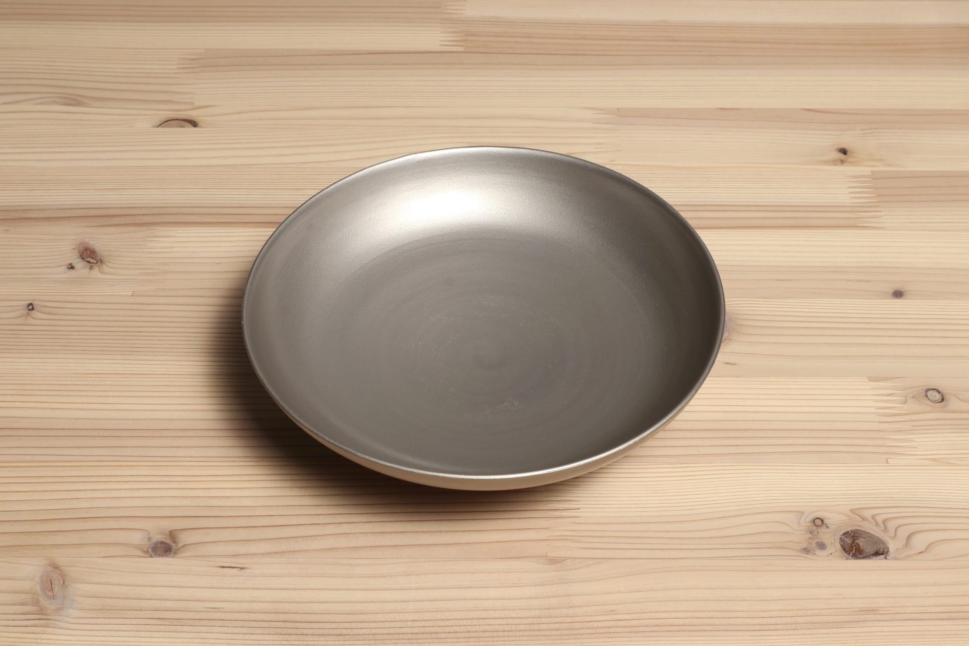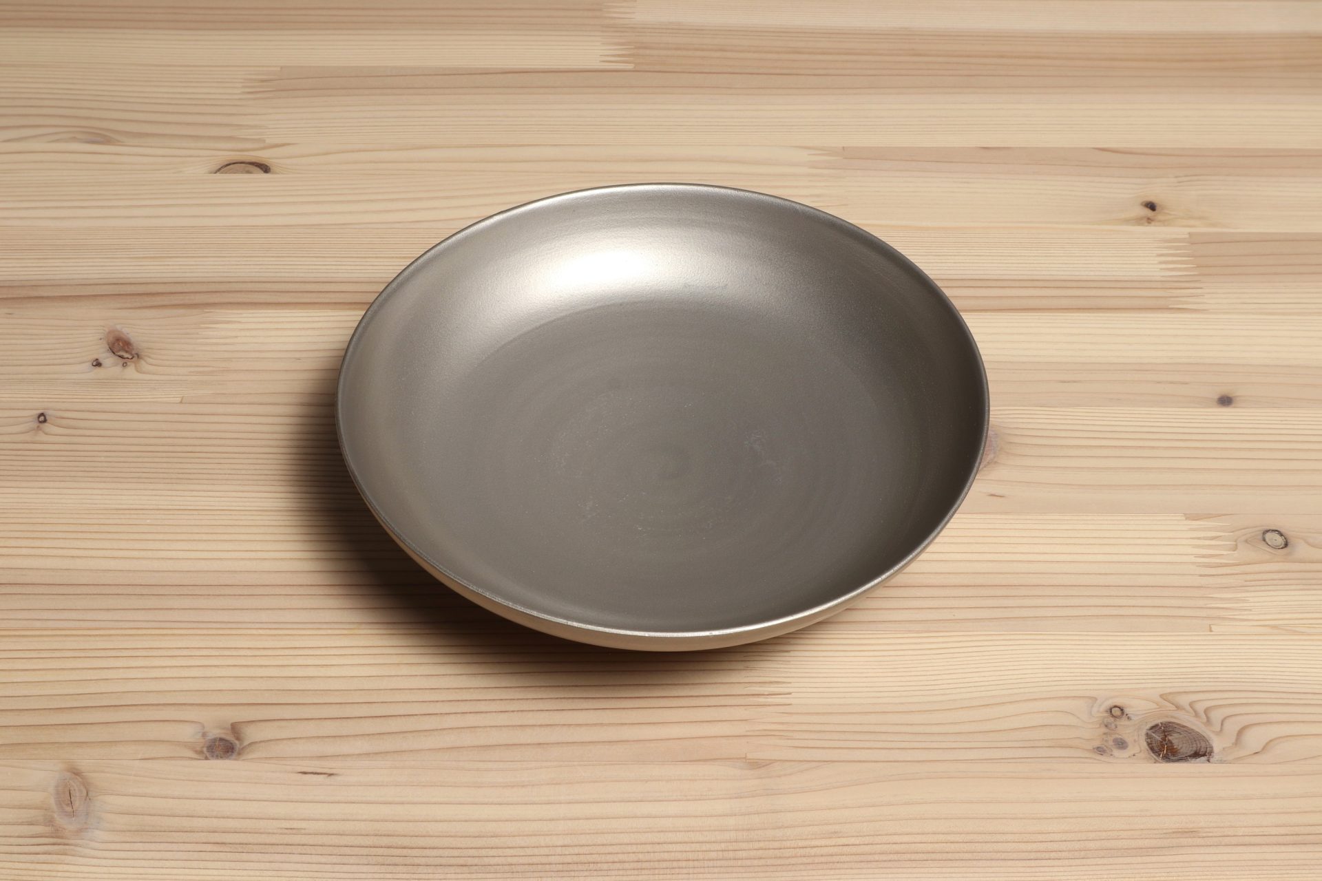 山田晶さんのプラチナ彩高坏皿です。2㎝ほどの少し高い高台が付けられたシンプルな丸皿。落ち着いたマットな光沢のプラチナ彩がモダンな風韻です。