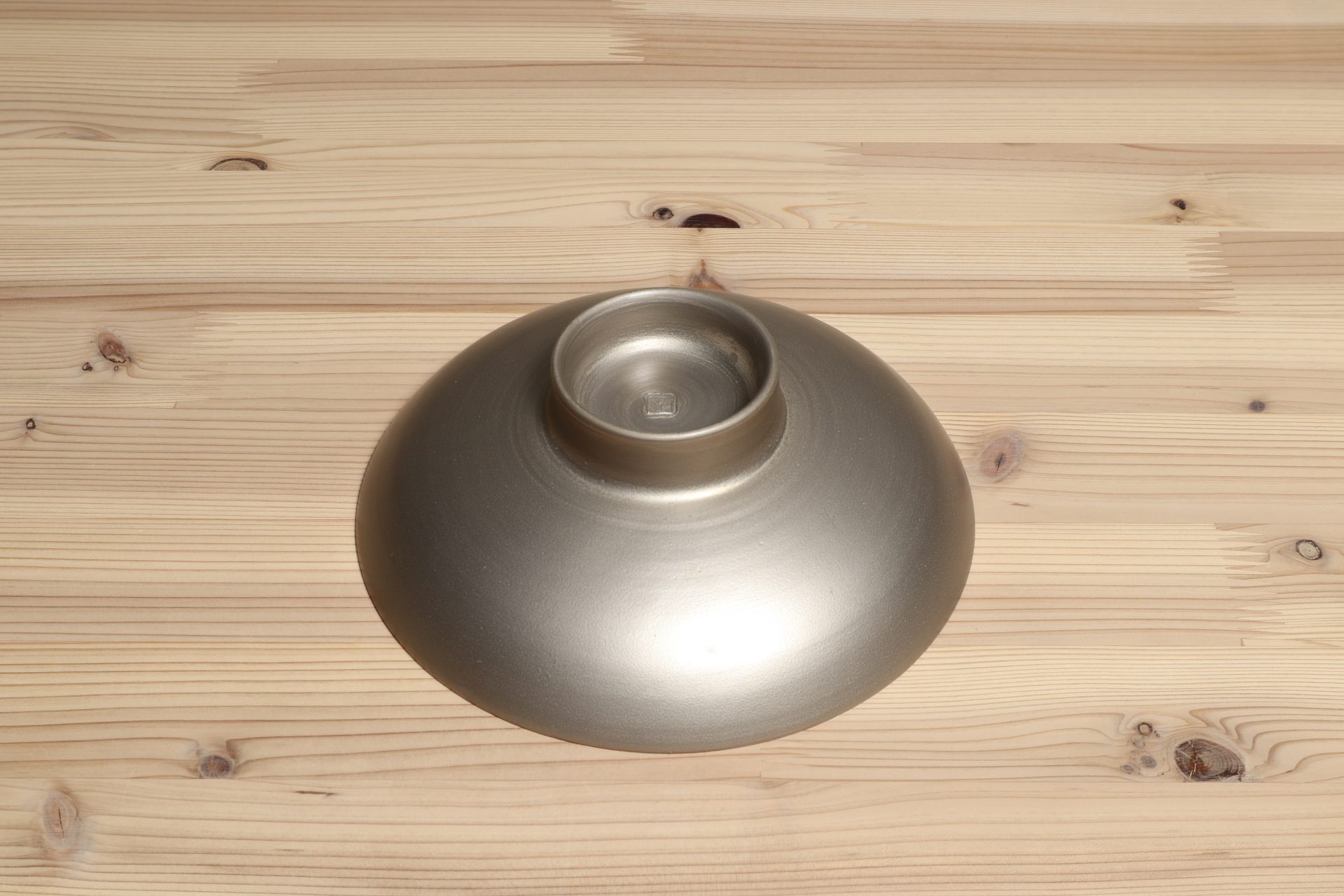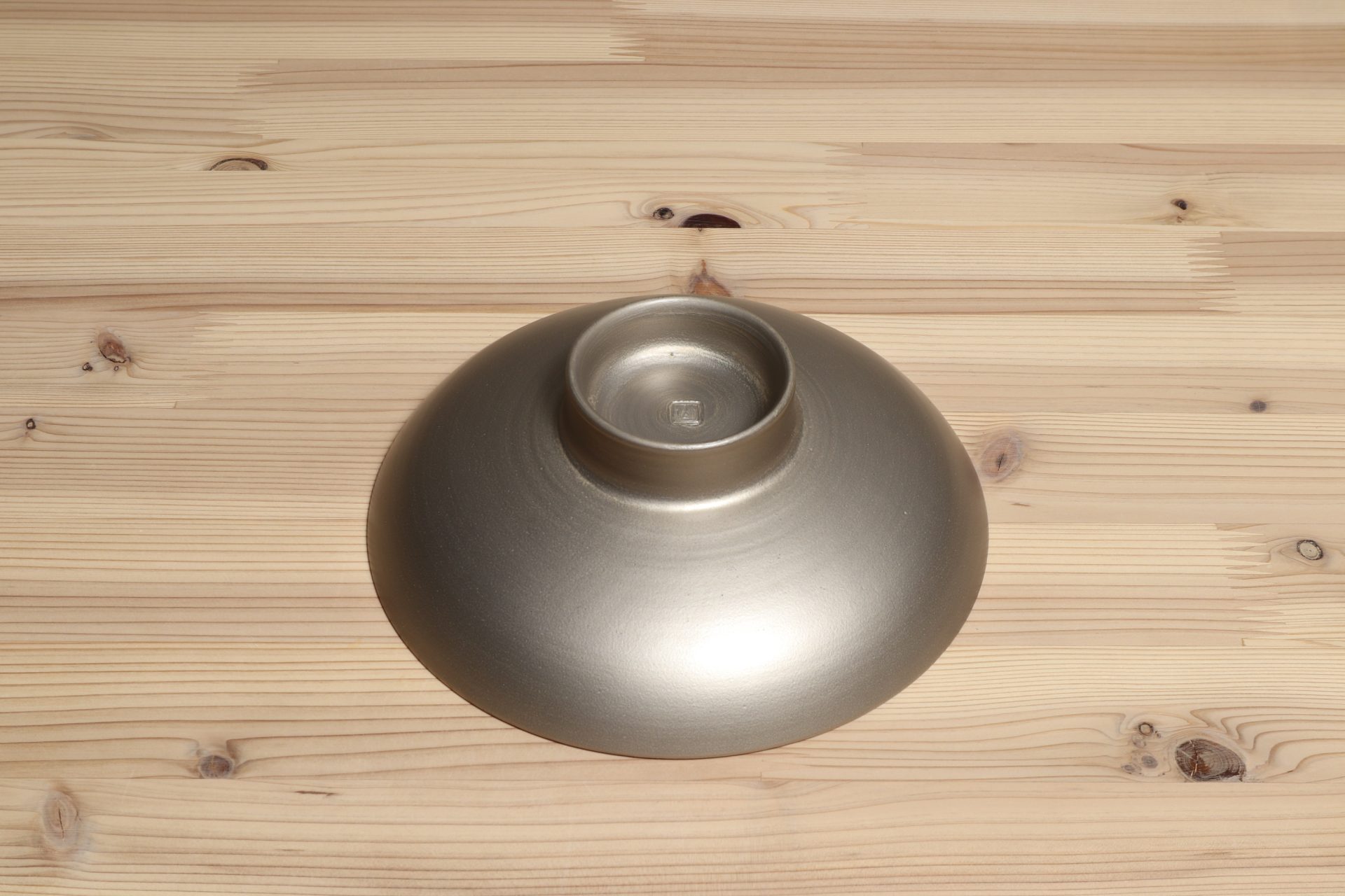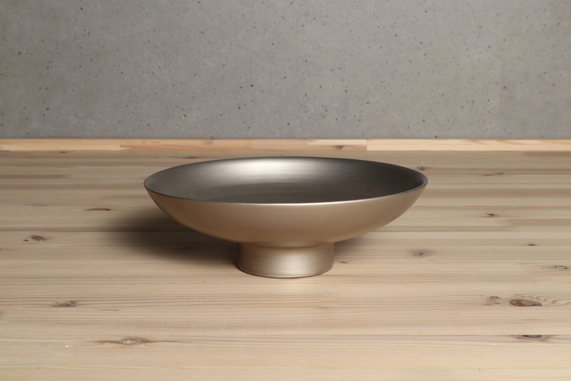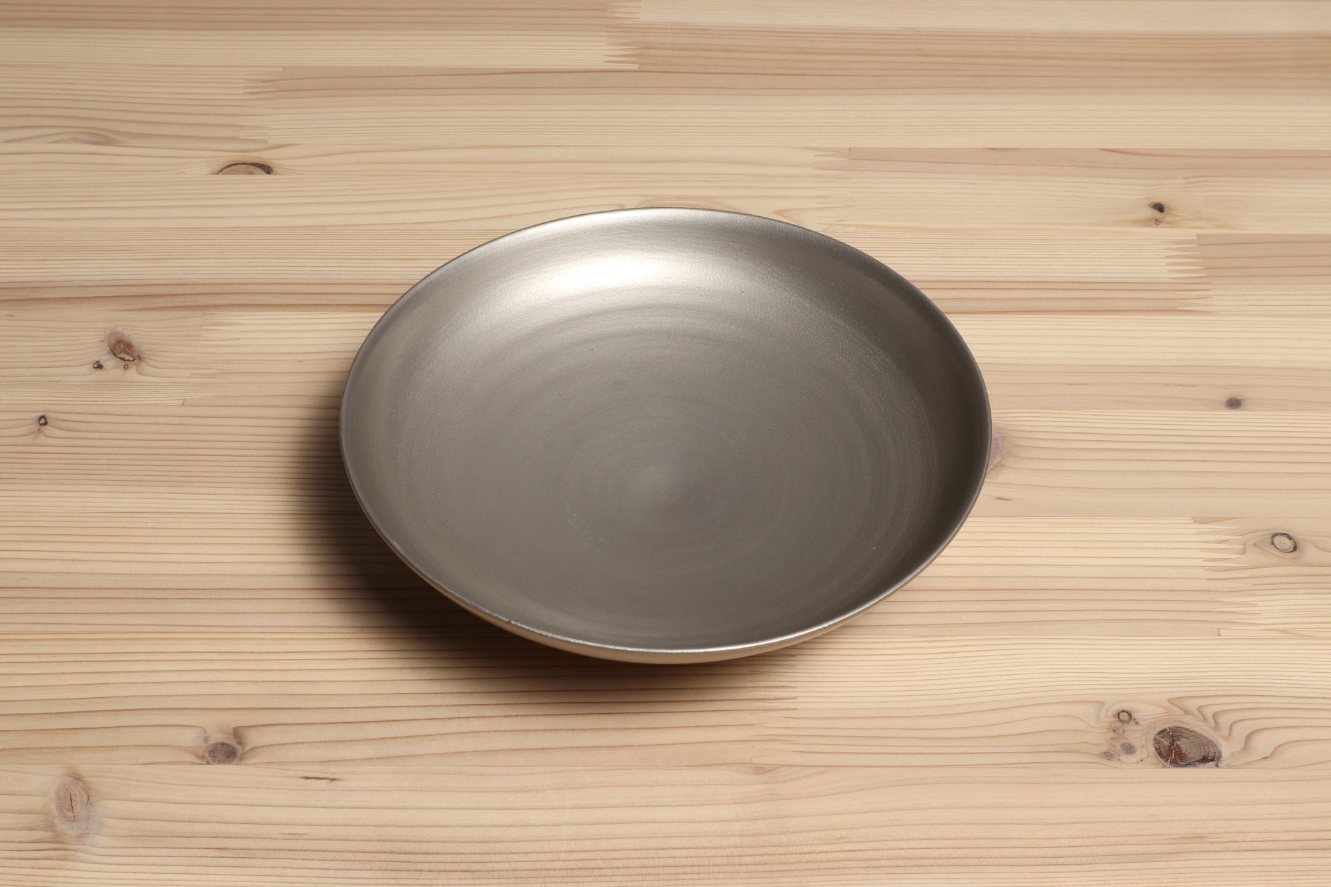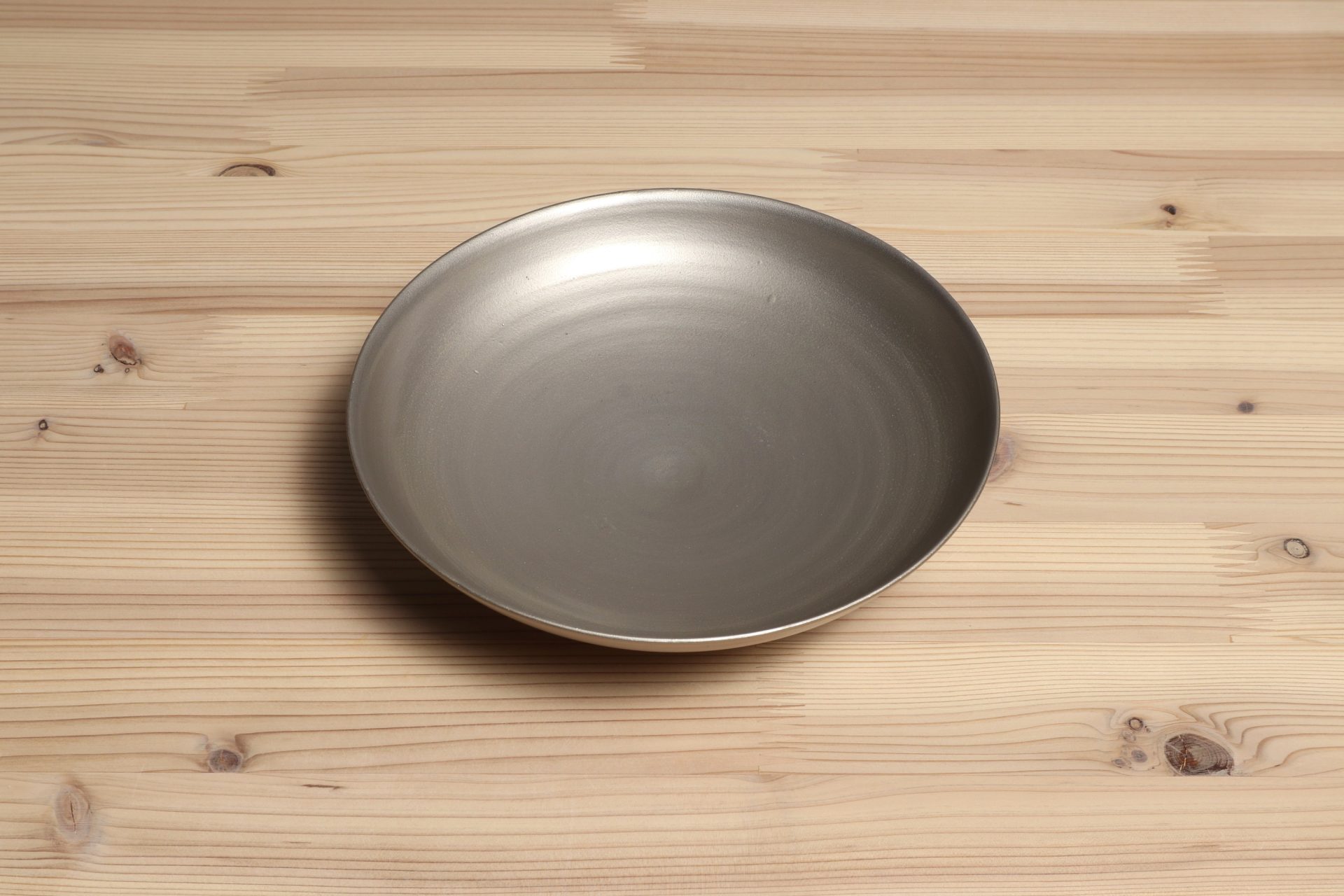 山田晶さんのプラチナ彩高坏皿です。2㎝ほどの少し高い高台が付けられたシンプルな丸皿。落ち着いたマットな光沢のプラチナ彩がモダンな風韻です。