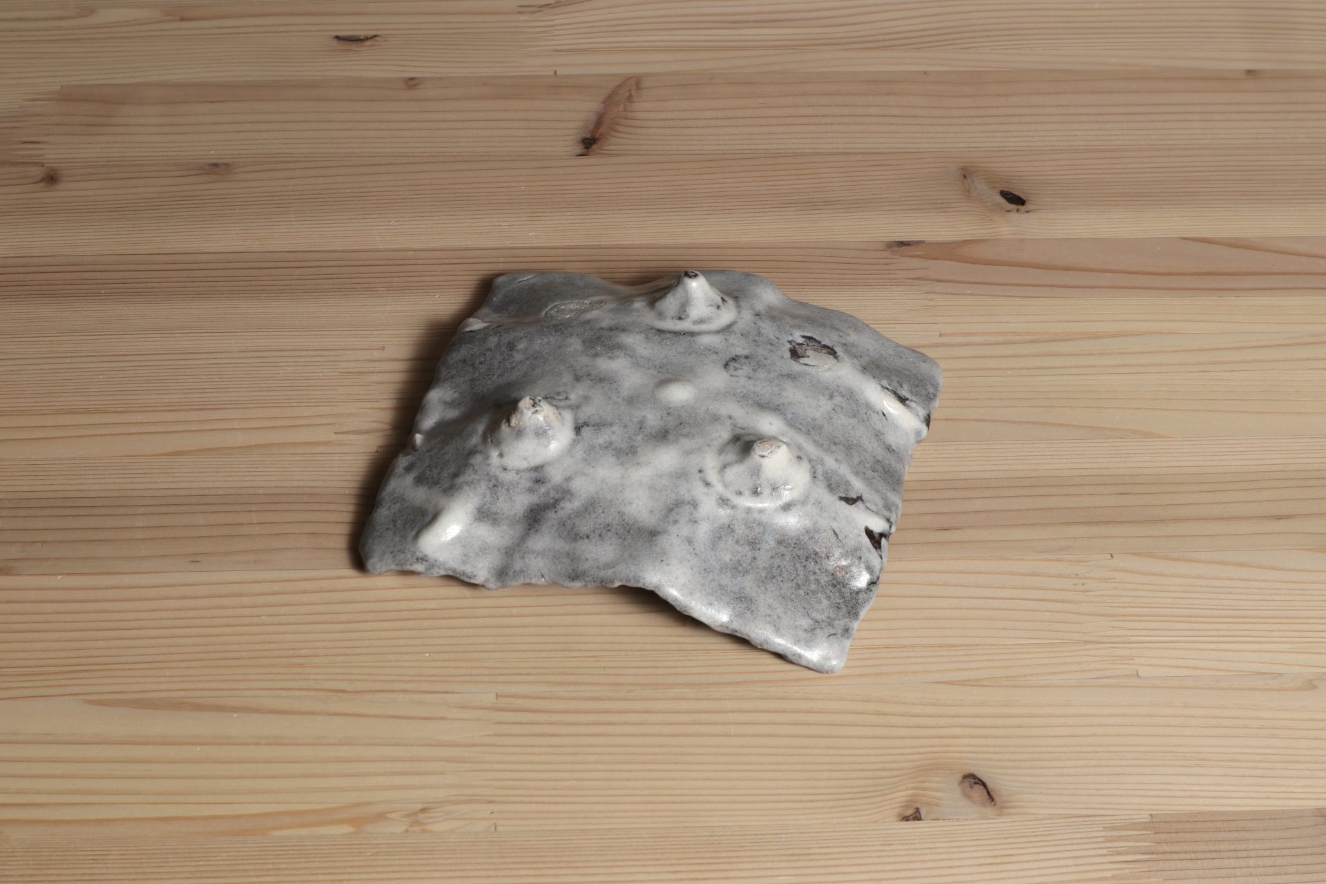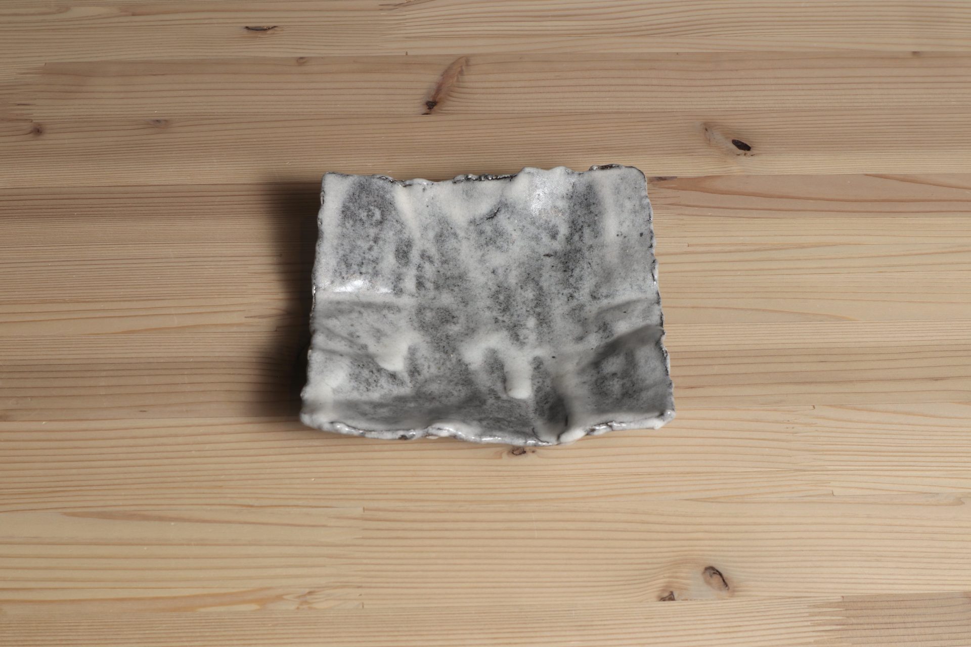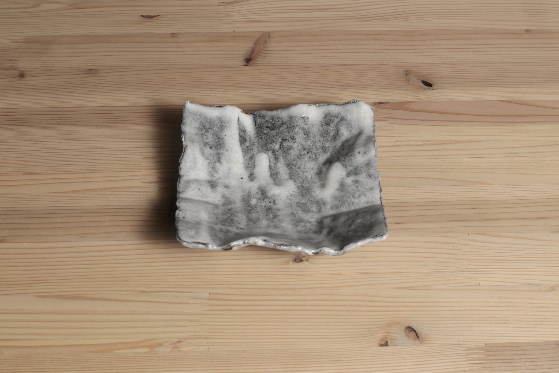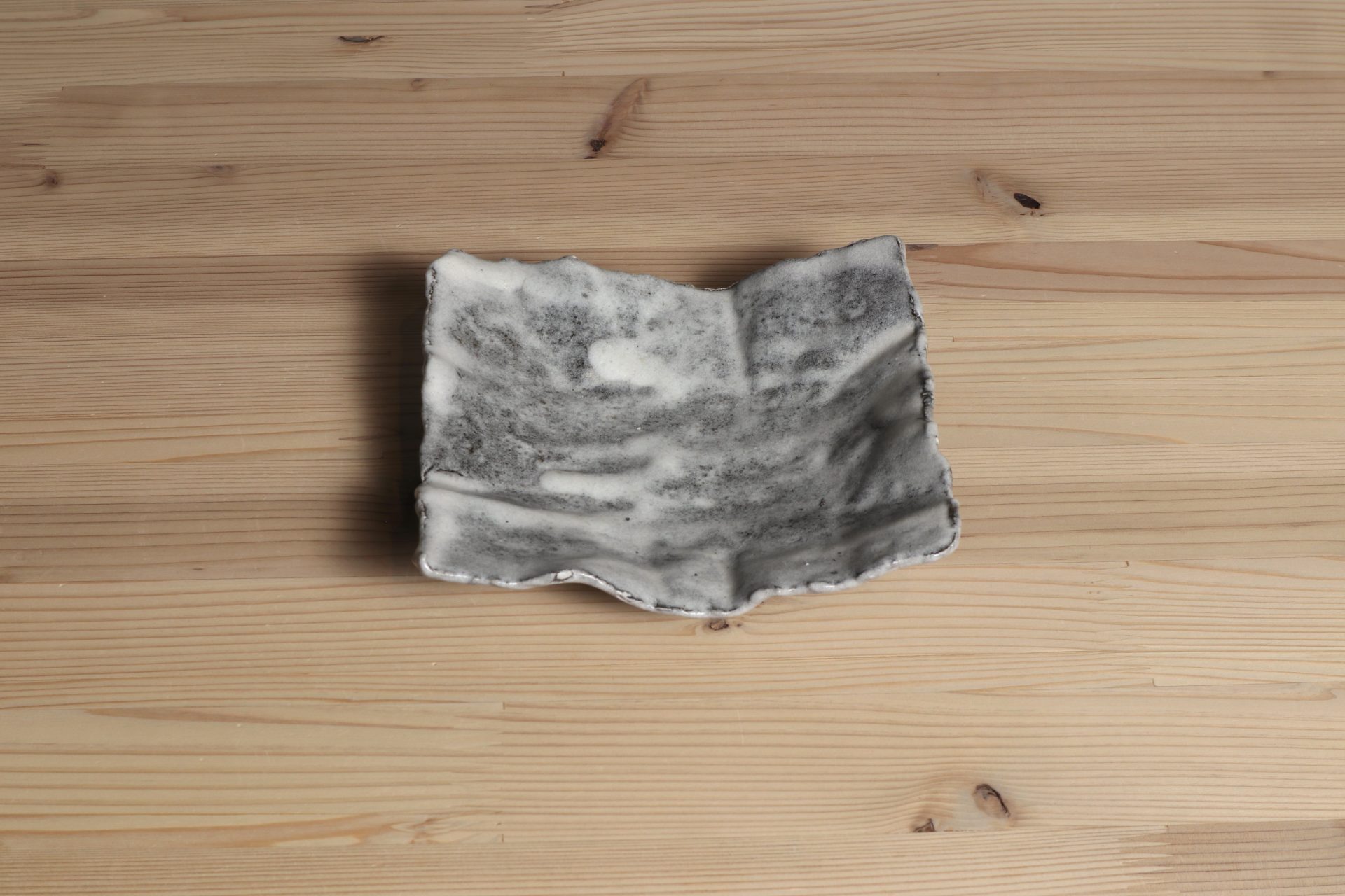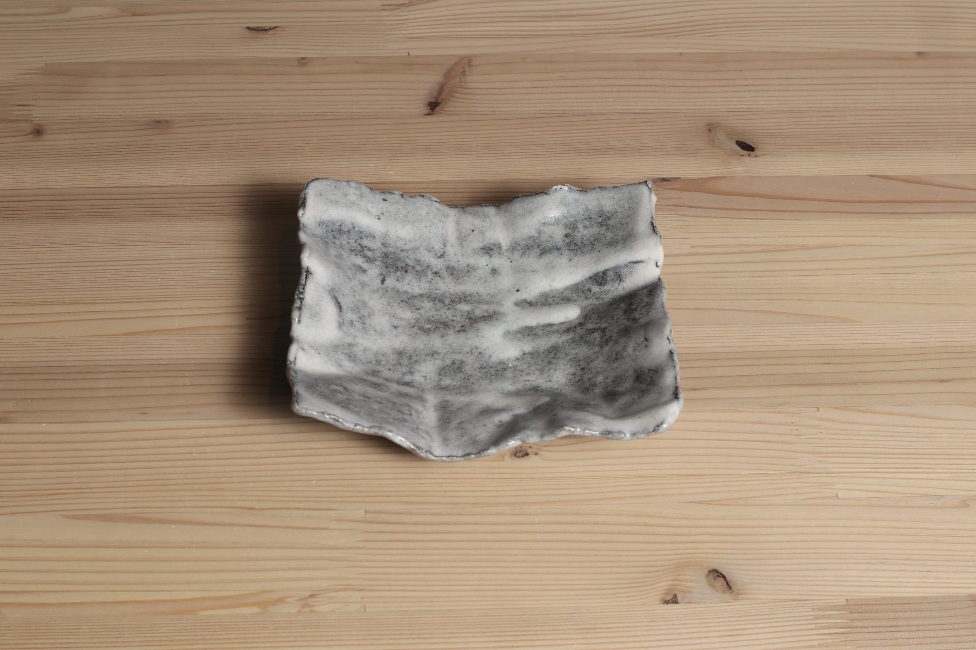 大前悟さんの鼠志野紙皿です。型にあてて成形された、薄手の折り紙のようなフォルムが印象的な四方皿。シックな雰囲気の鼠志野の釉調も魅力です。