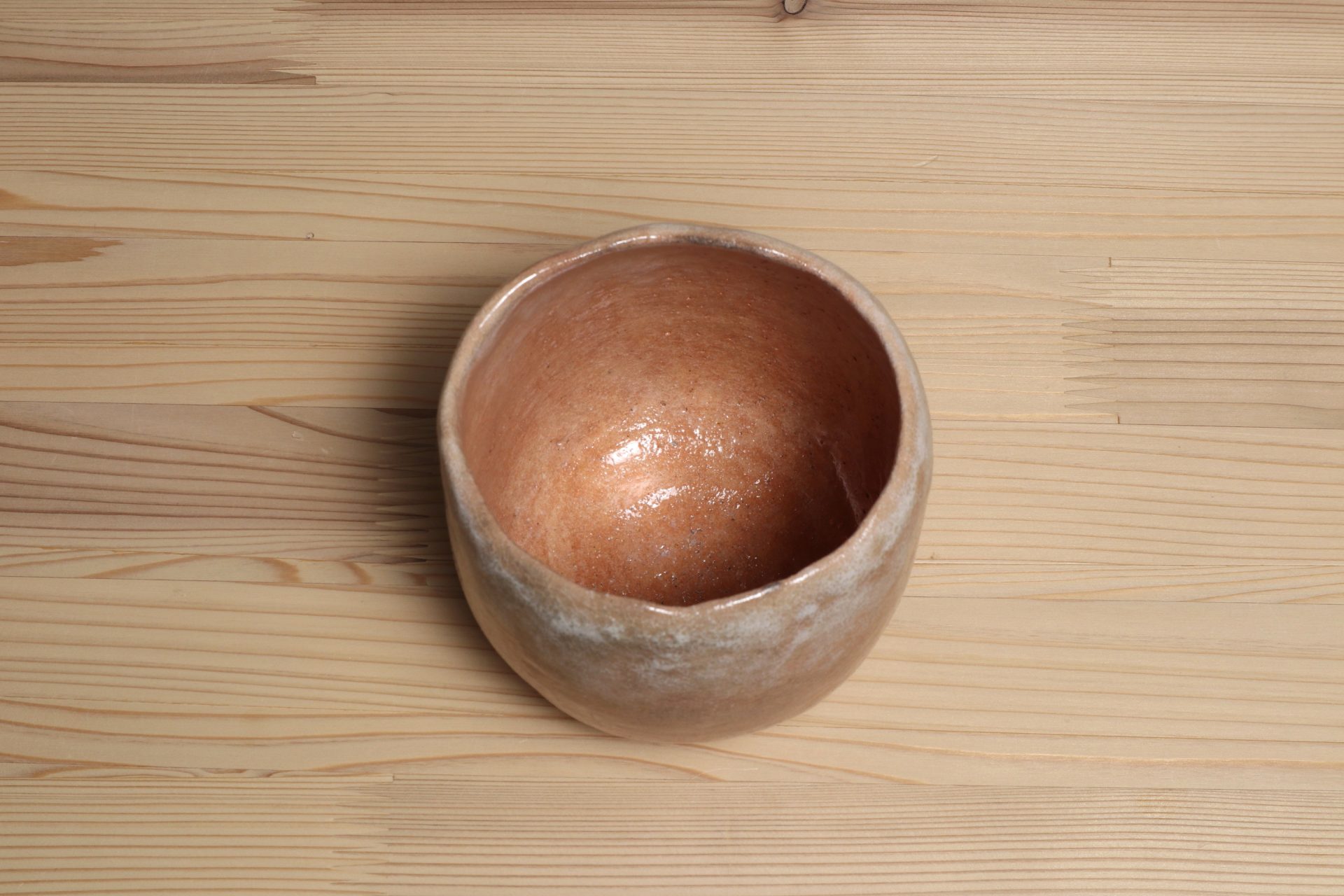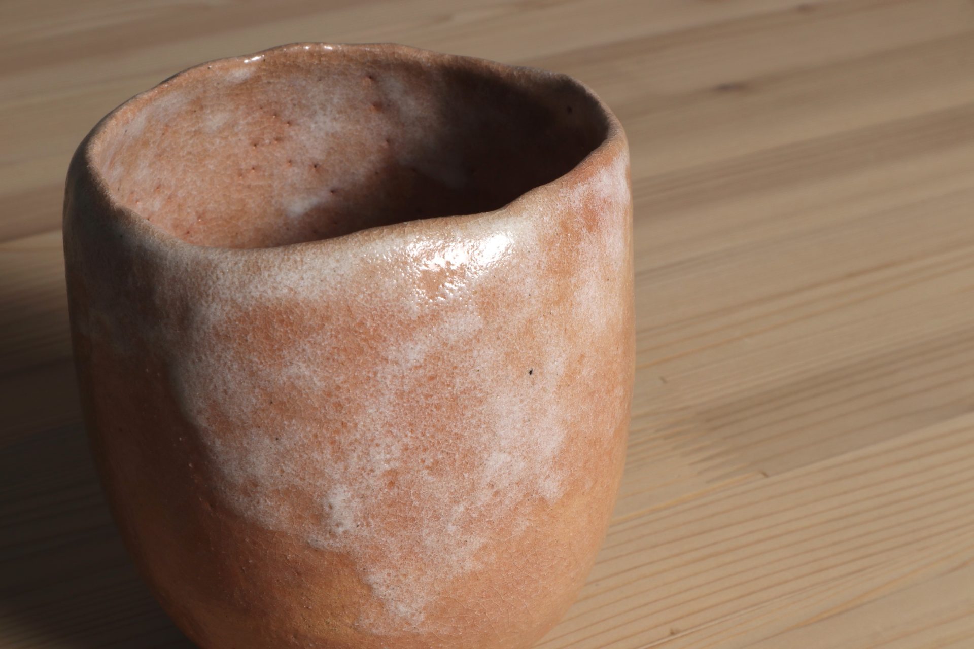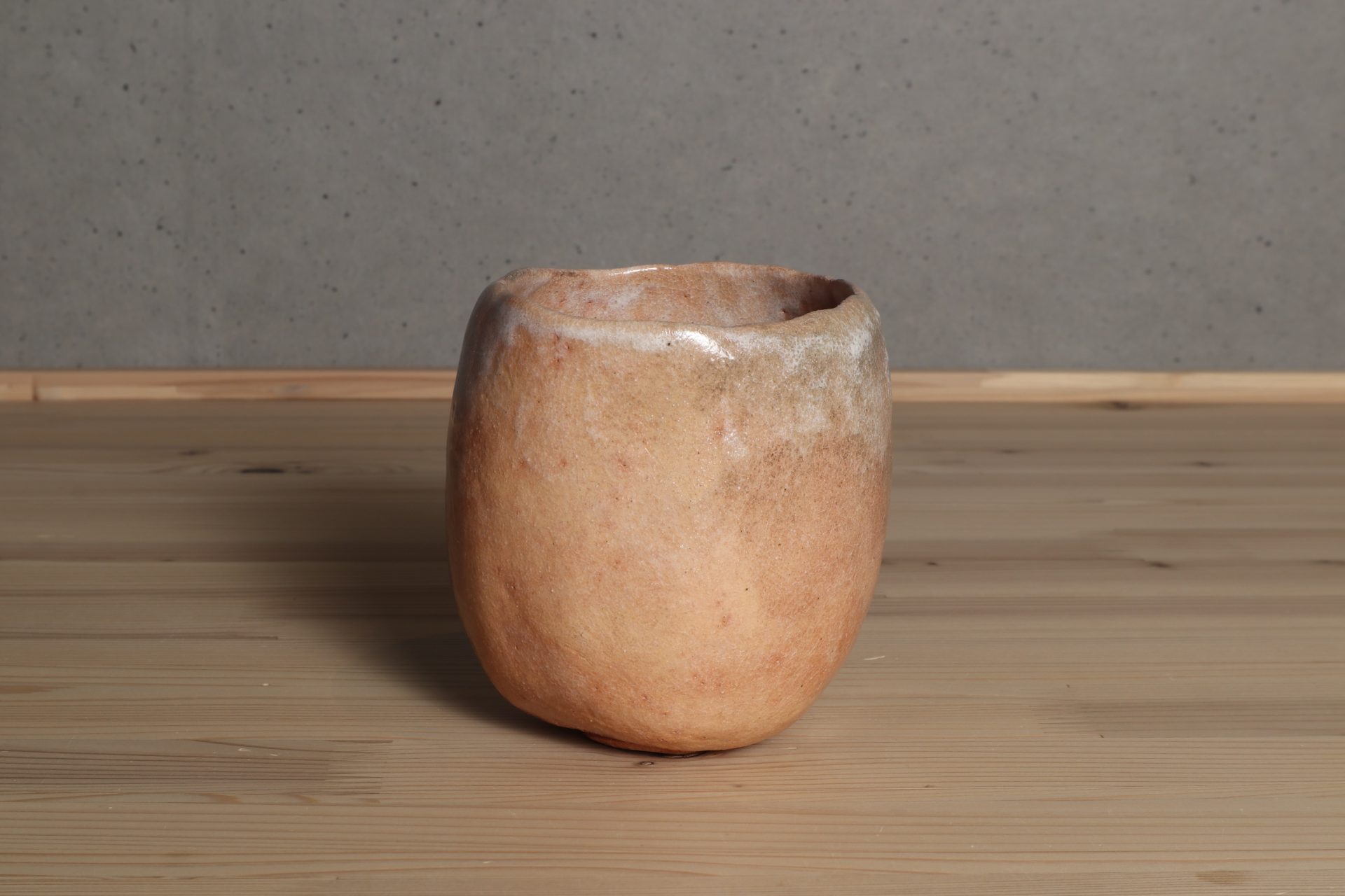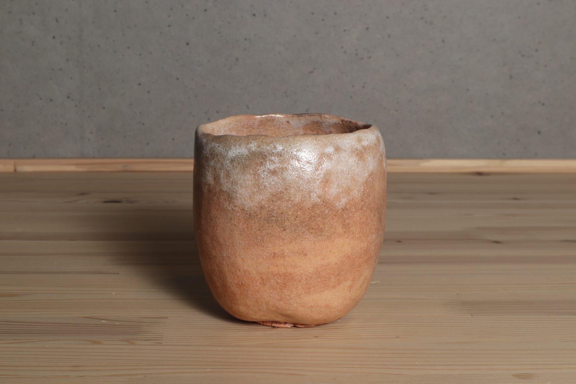 村田眞人さんの窯変赤楽筒茶碗です。腰を穏やかに張り出し、抱え込むように穏やかに手びねり成形された筒型のフォルム。緊張感ある口造り、飄々とした付け高台。窯変による黒褐色の赤に霞がかかったような幕釉が趣のある景色となっています。手にすっぽりと納まる感覚が心地良い一碗。