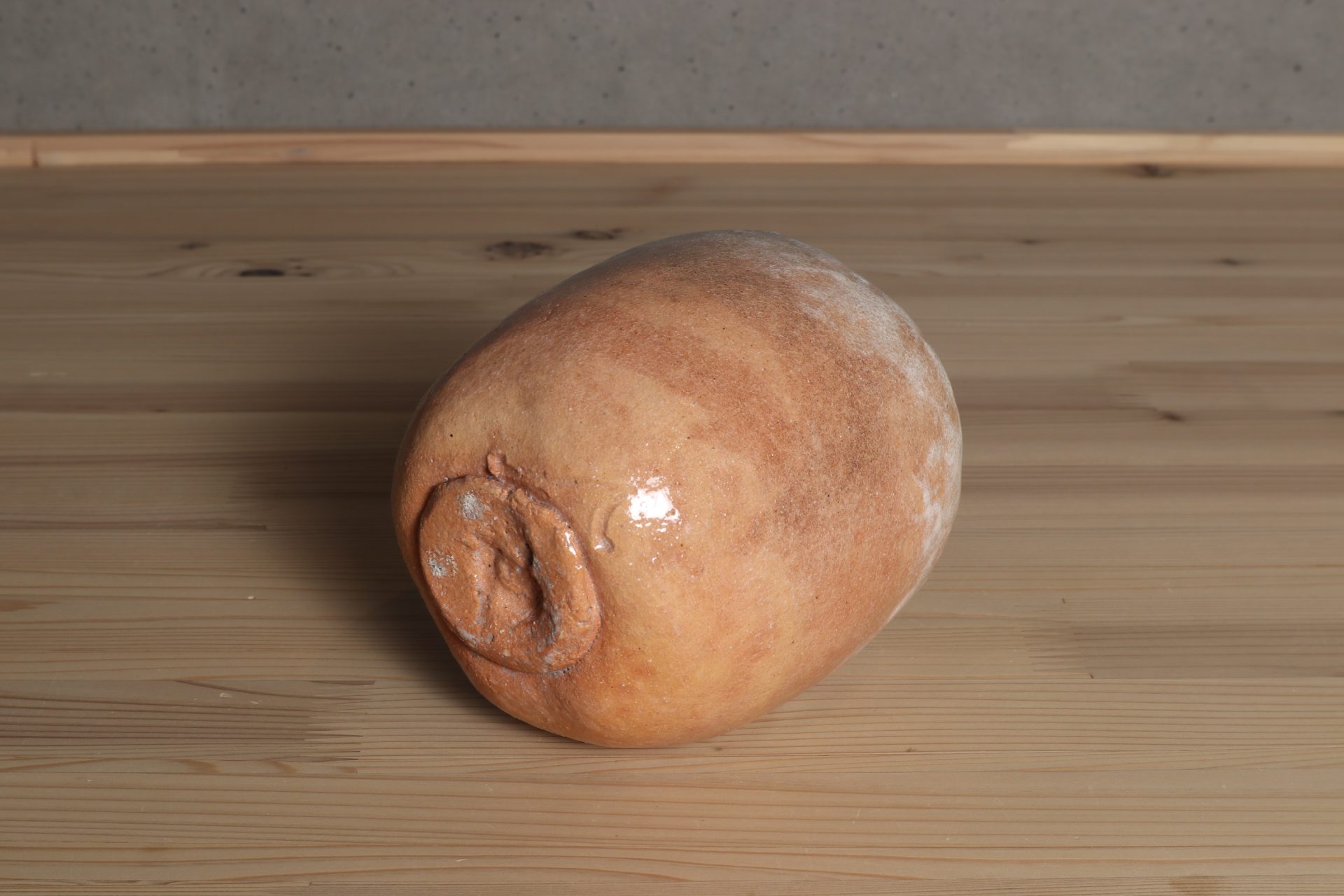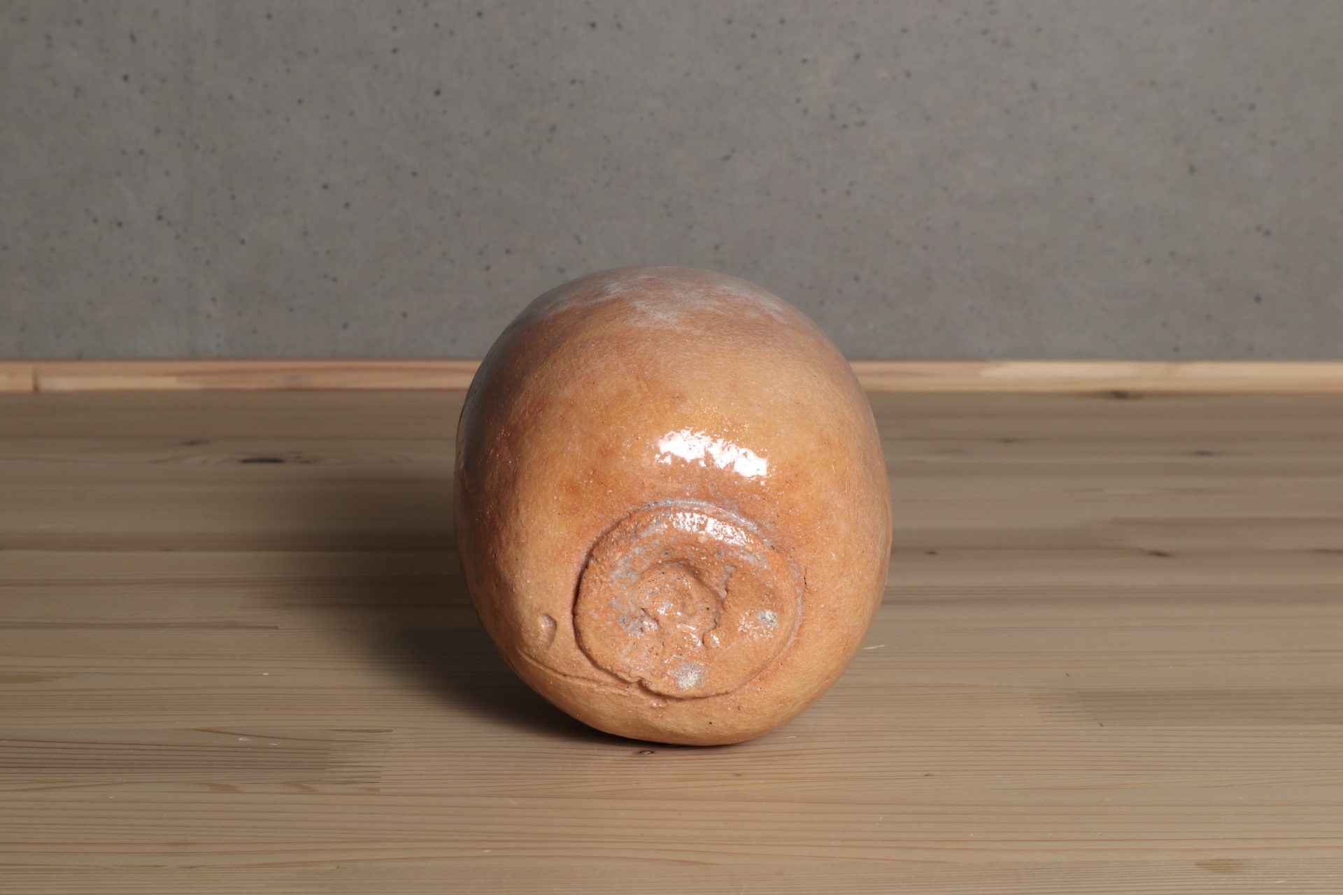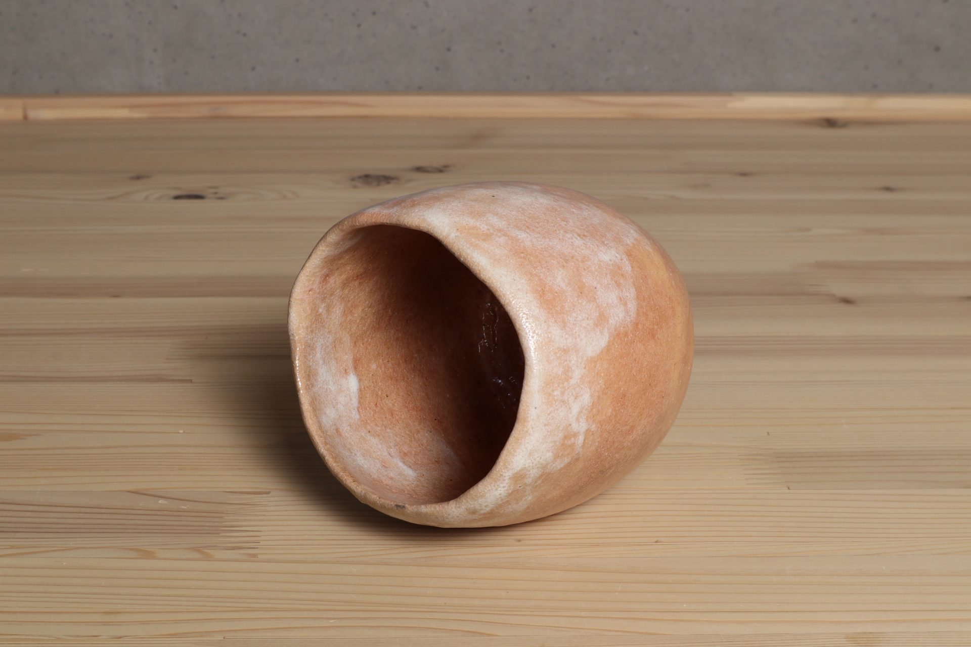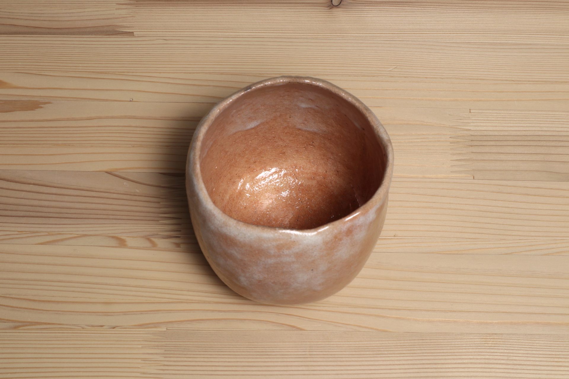 村田眞人さんの窯変赤楽筒茶碗です。腰を穏やかに張り出し、抱え込むように穏やかに手びねり成形された筒型のフォルム。緊張感ある口造り、飄々とした付け高台。窯変による黒褐色の赤に霞がかかったような幕釉が趣のある景色となっています。手にすっぽりと納まる感覚が心地良い一碗。