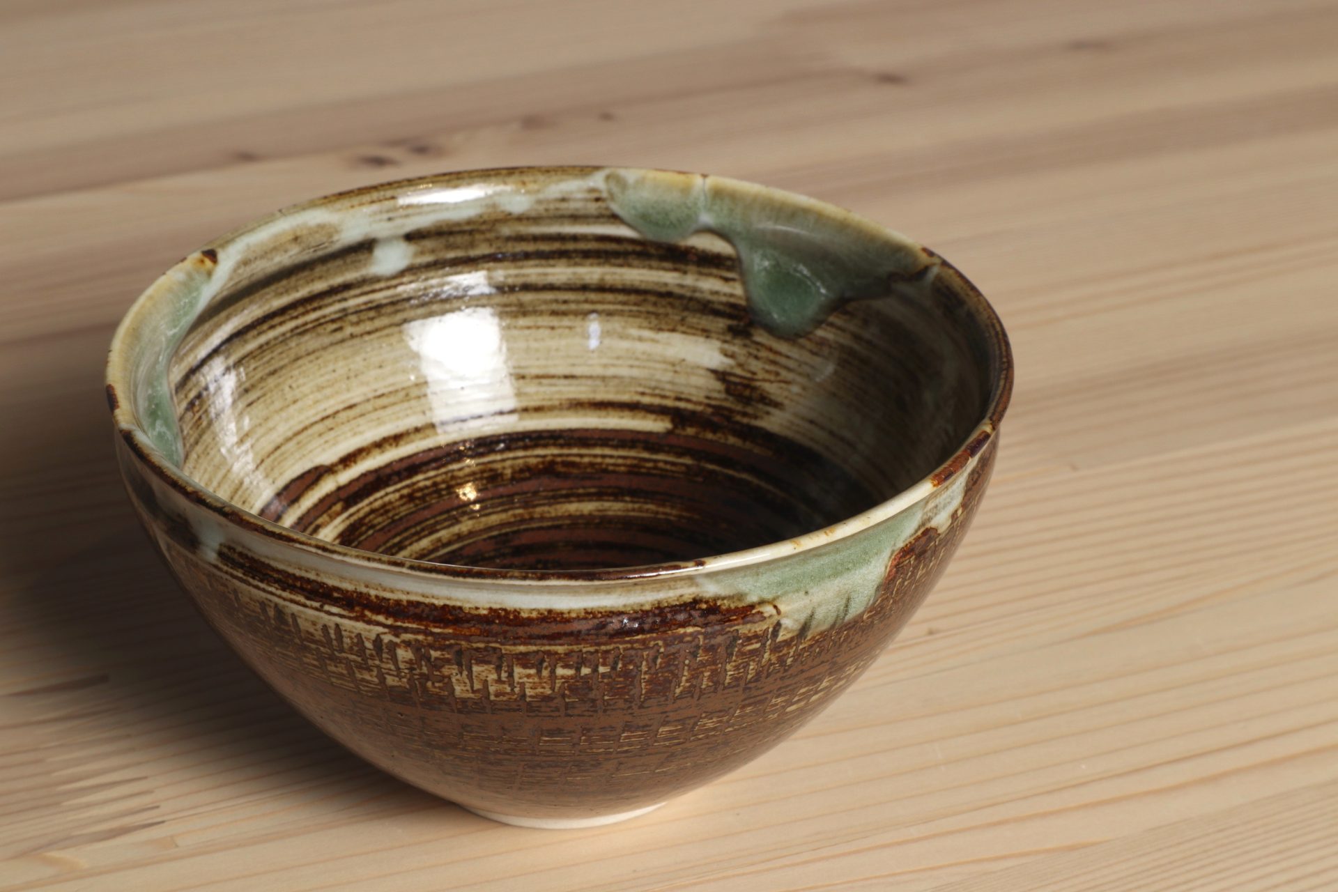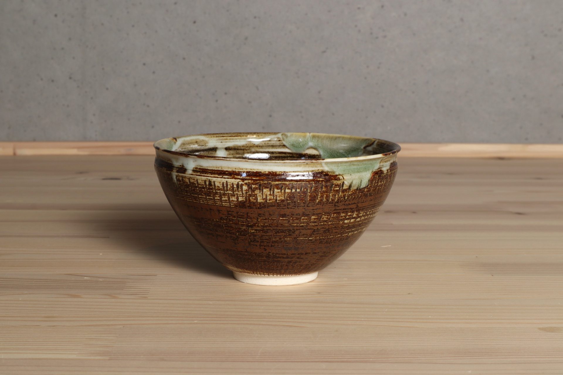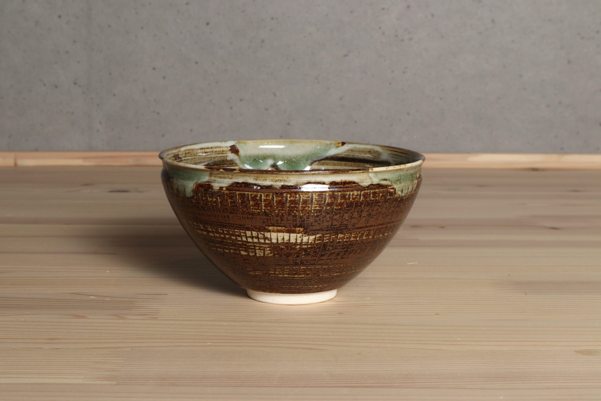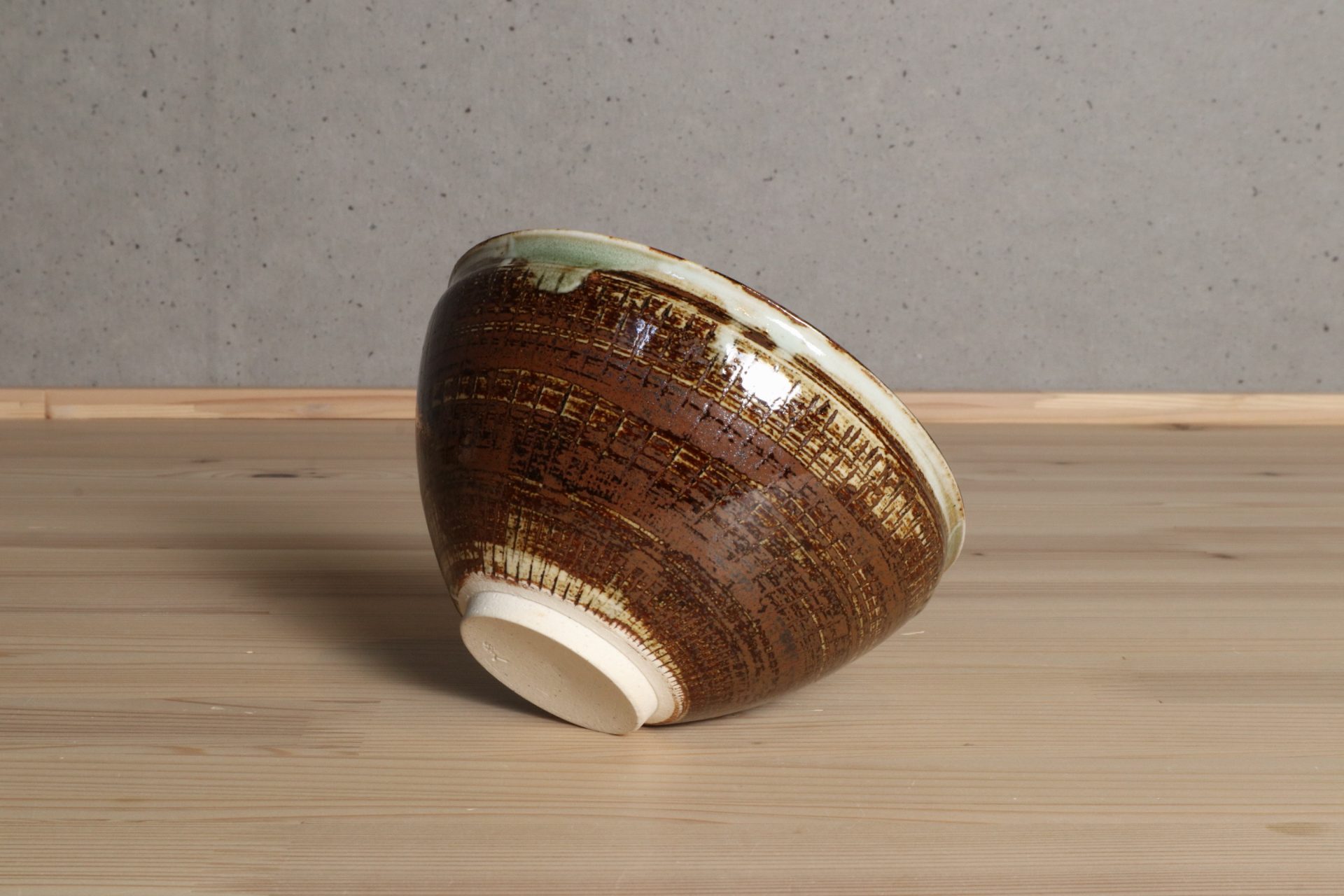 村田眞人さんの仁清写しの三玄天目茶碗です。大徳寺三玄院の注文で仁清が焼いたとされる数茶碗が本歌。素朴な鎬目の意匠に、褐色の柿釉と渦巻く刷毛目、口縁には緑釉が掛けられています。