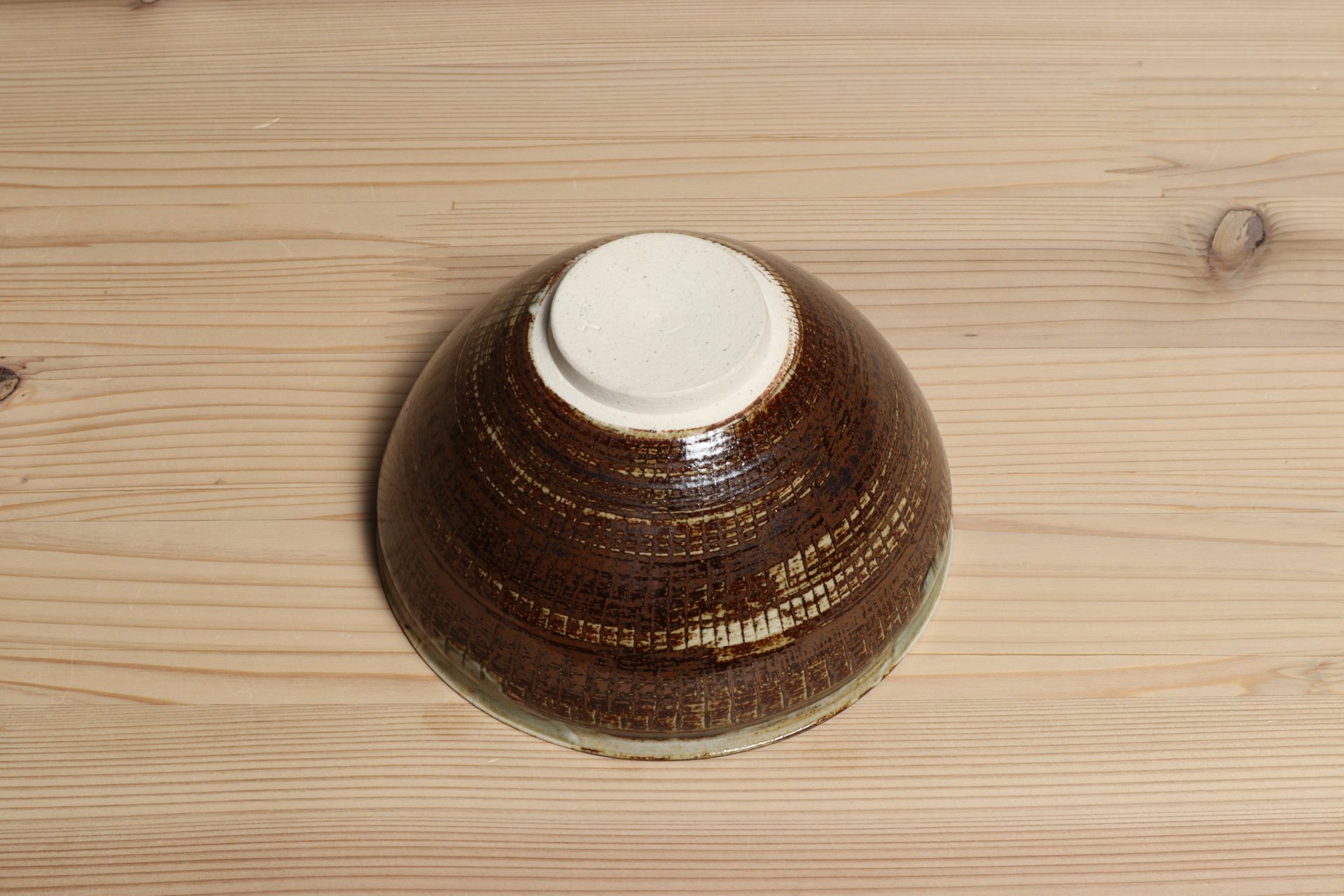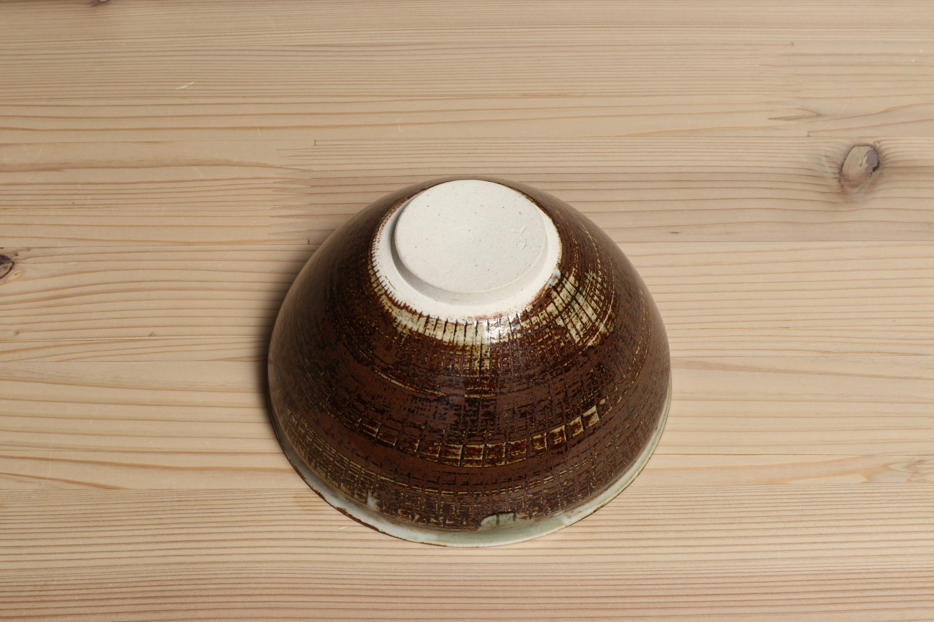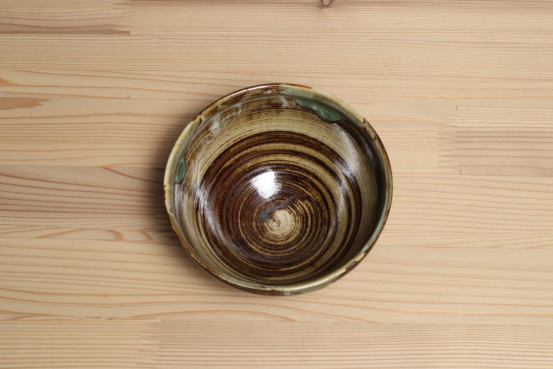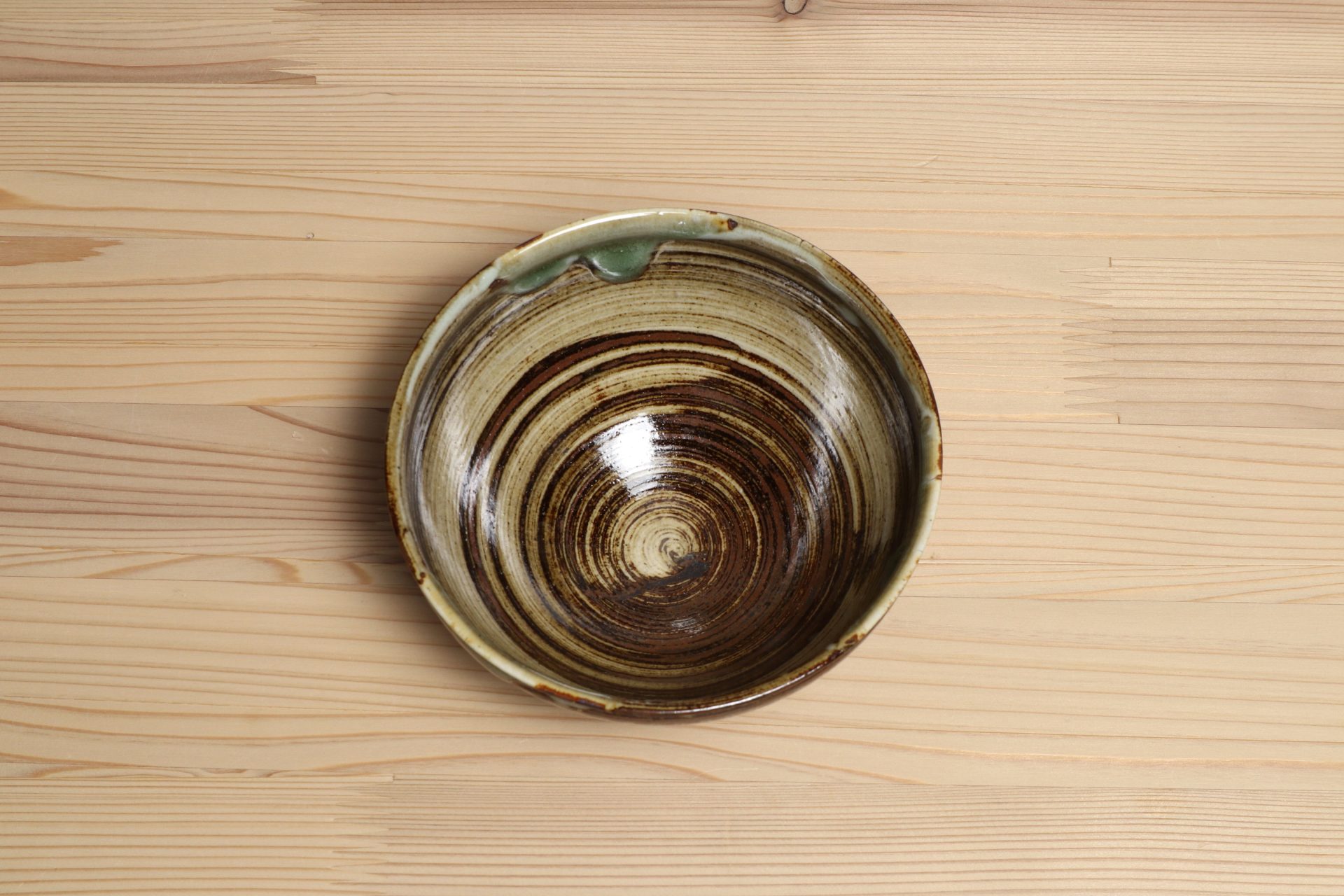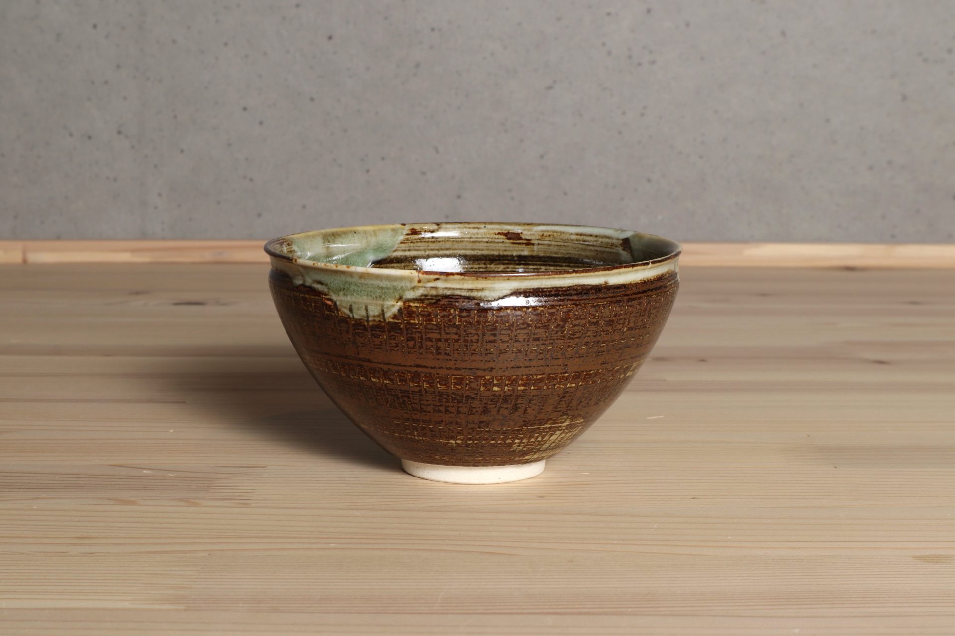 村田眞人さんの仁清写しの三玄天目茶碗です。大徳寺三玄院の注文で仁清が焼いたとされる数茶碗が本歌。素朴な鎬目の意匠に、褐色の柿釉と渦巻く刷毛目、口縁には緑釉が掛けられています。