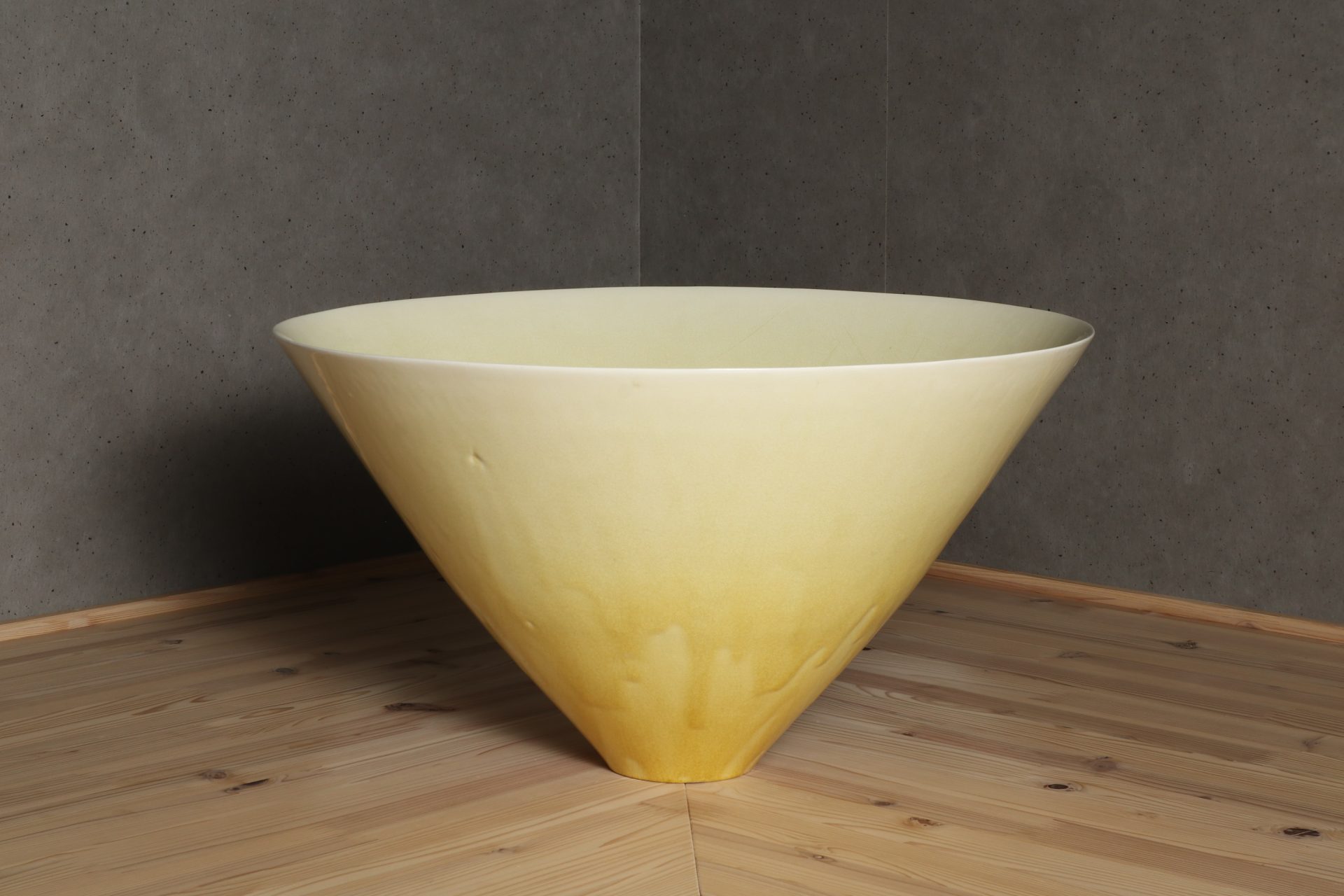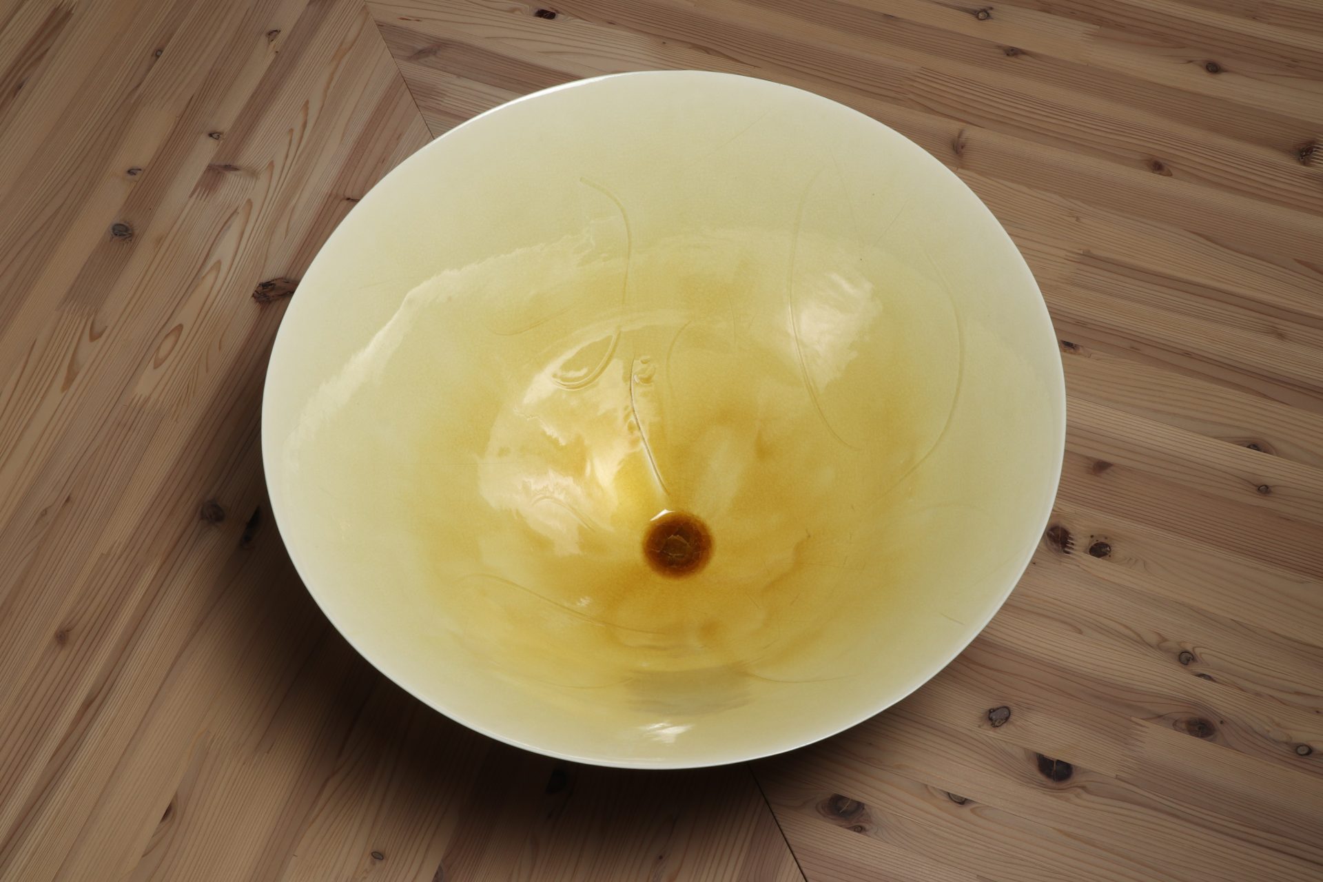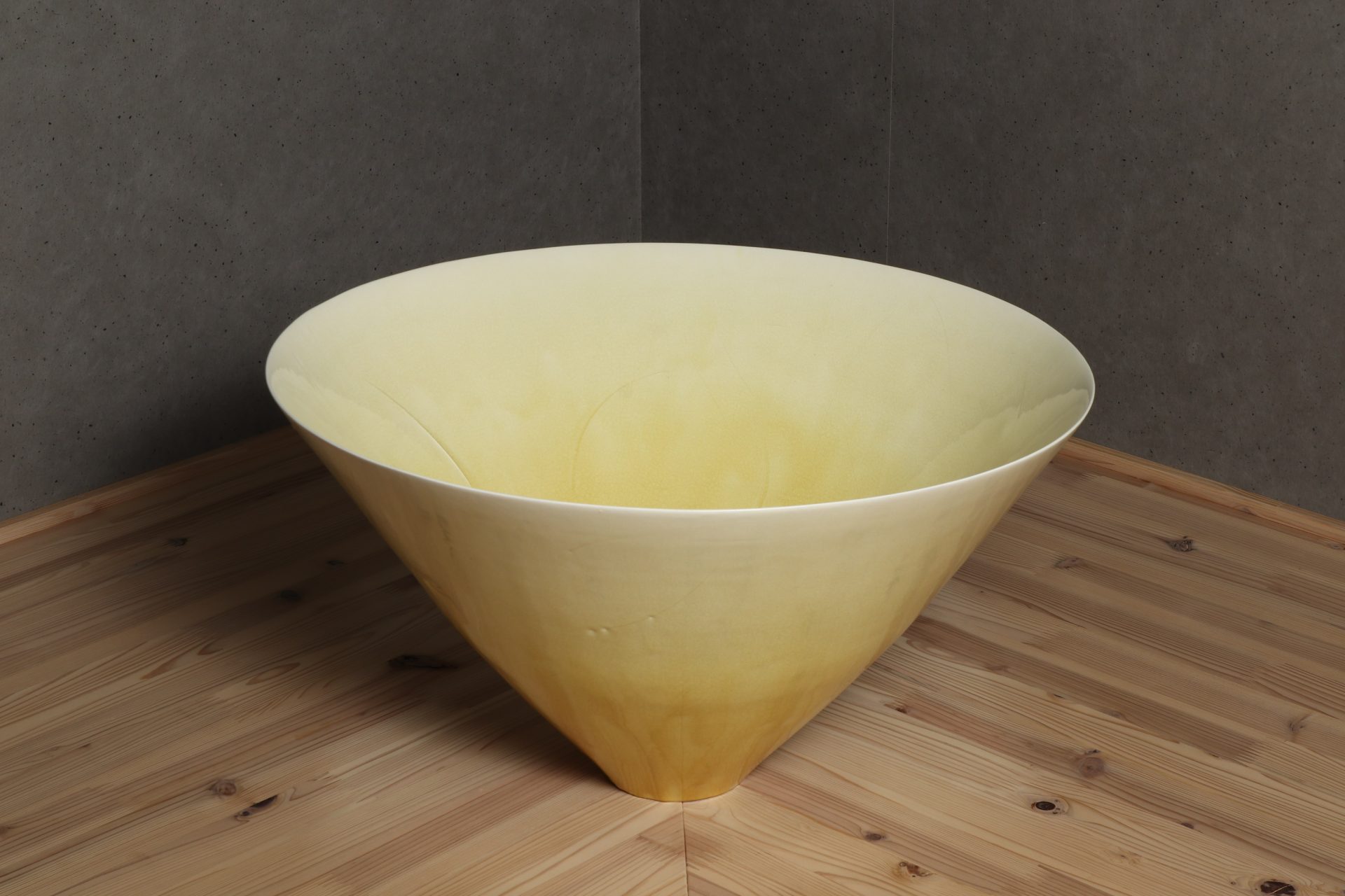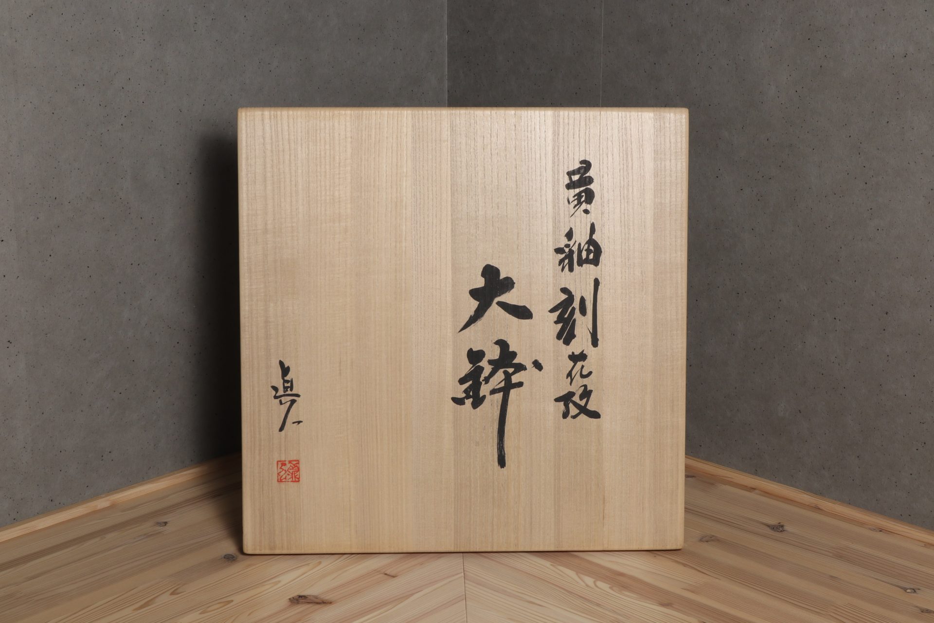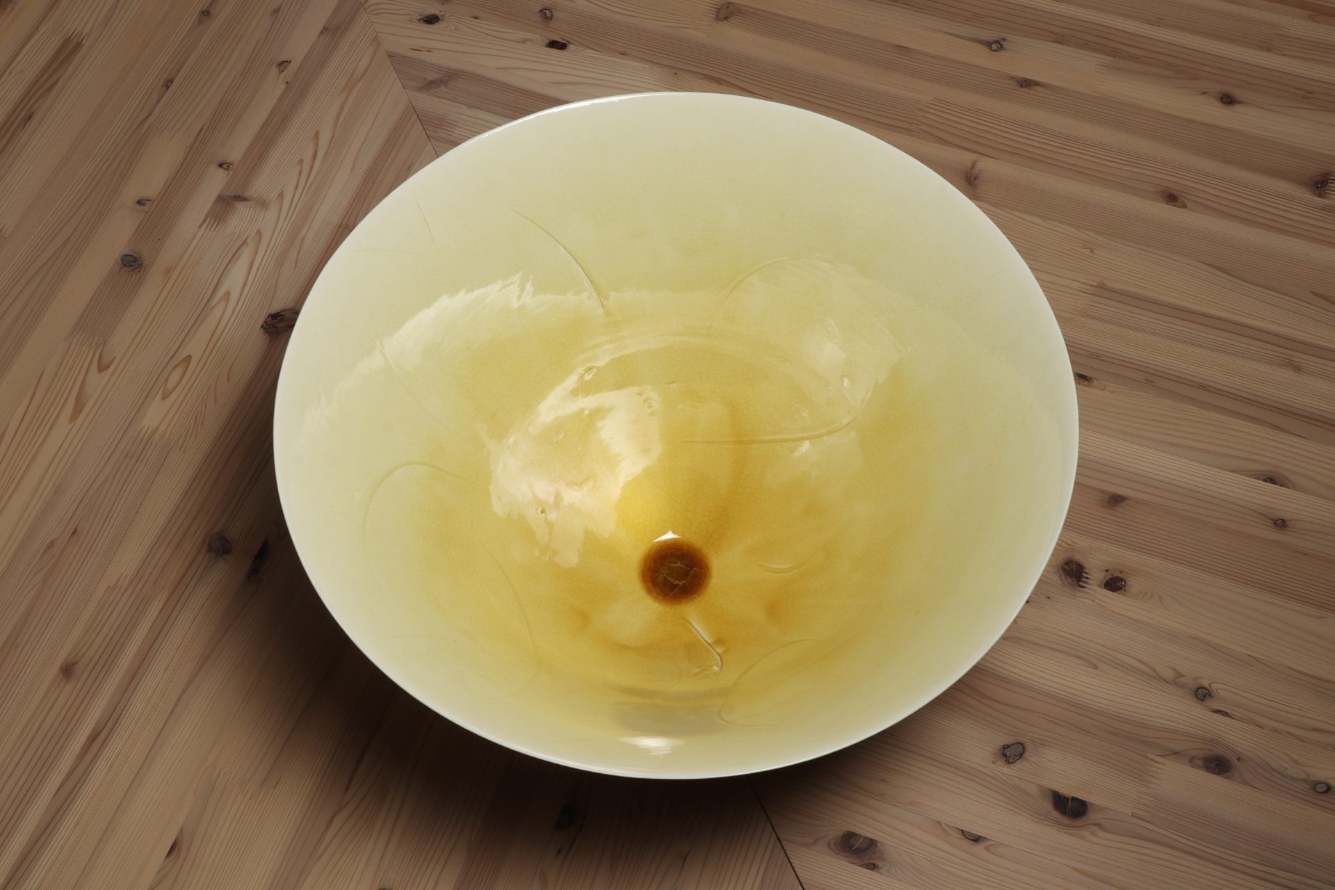 村田眞人さんの黄釉花紋大鉢で溜塗りの蓋が添えられています。透明感のある美しい黄釉の表情に、器全体が一つの花の様な、軽やかに刻まれた花紋の意匠。第58回日本伝統工芸展の入選作品。特別価格でのご紹介です。
