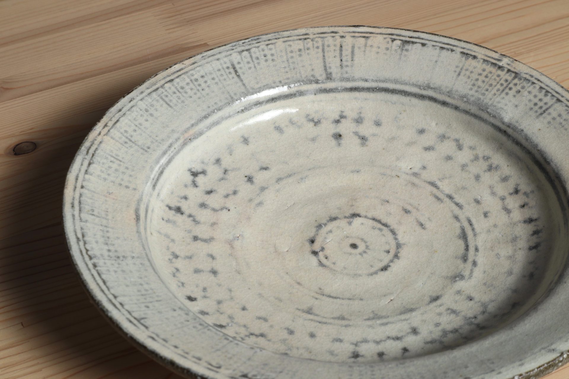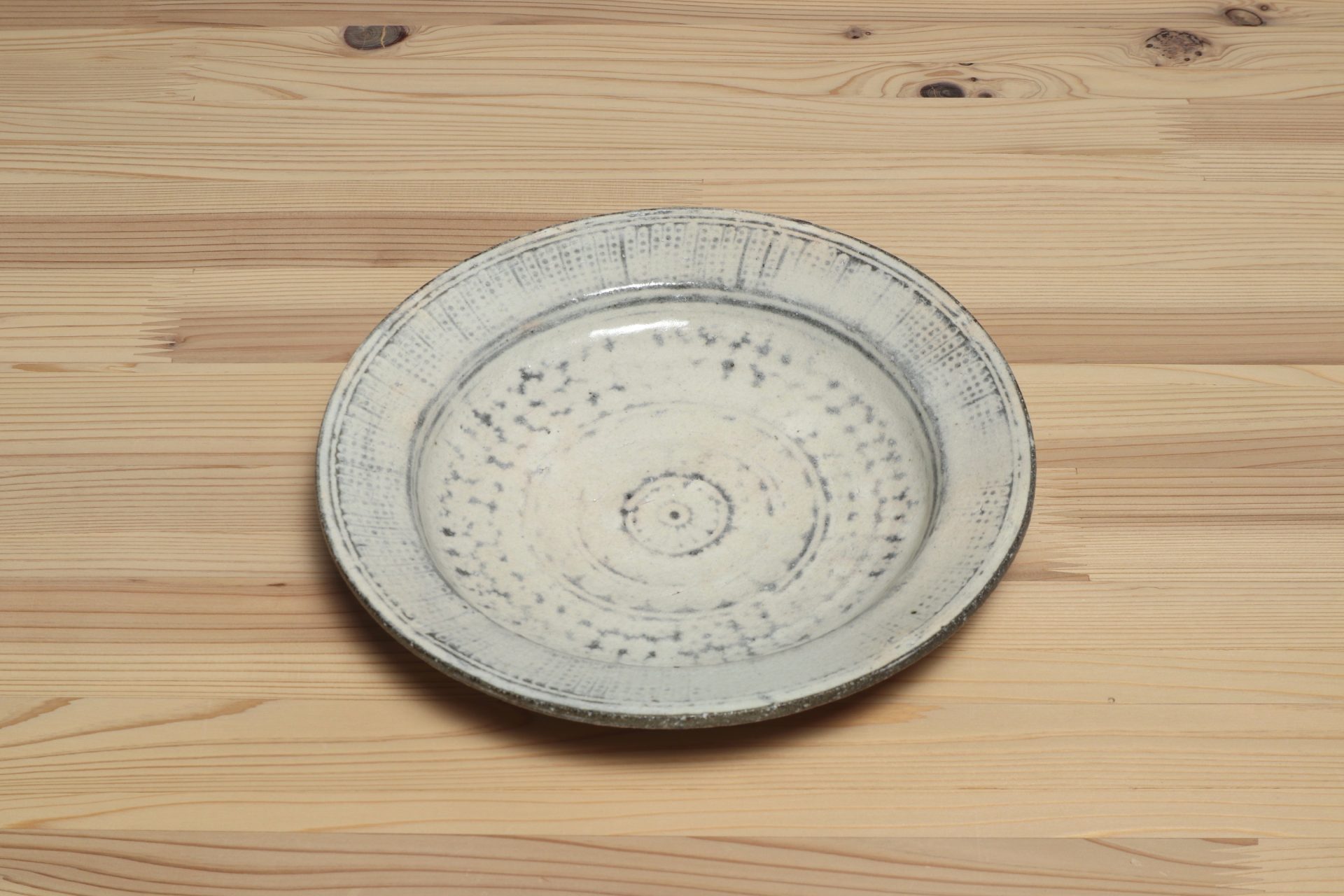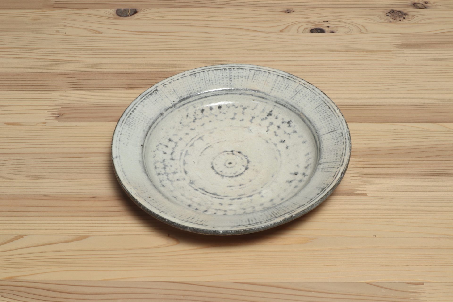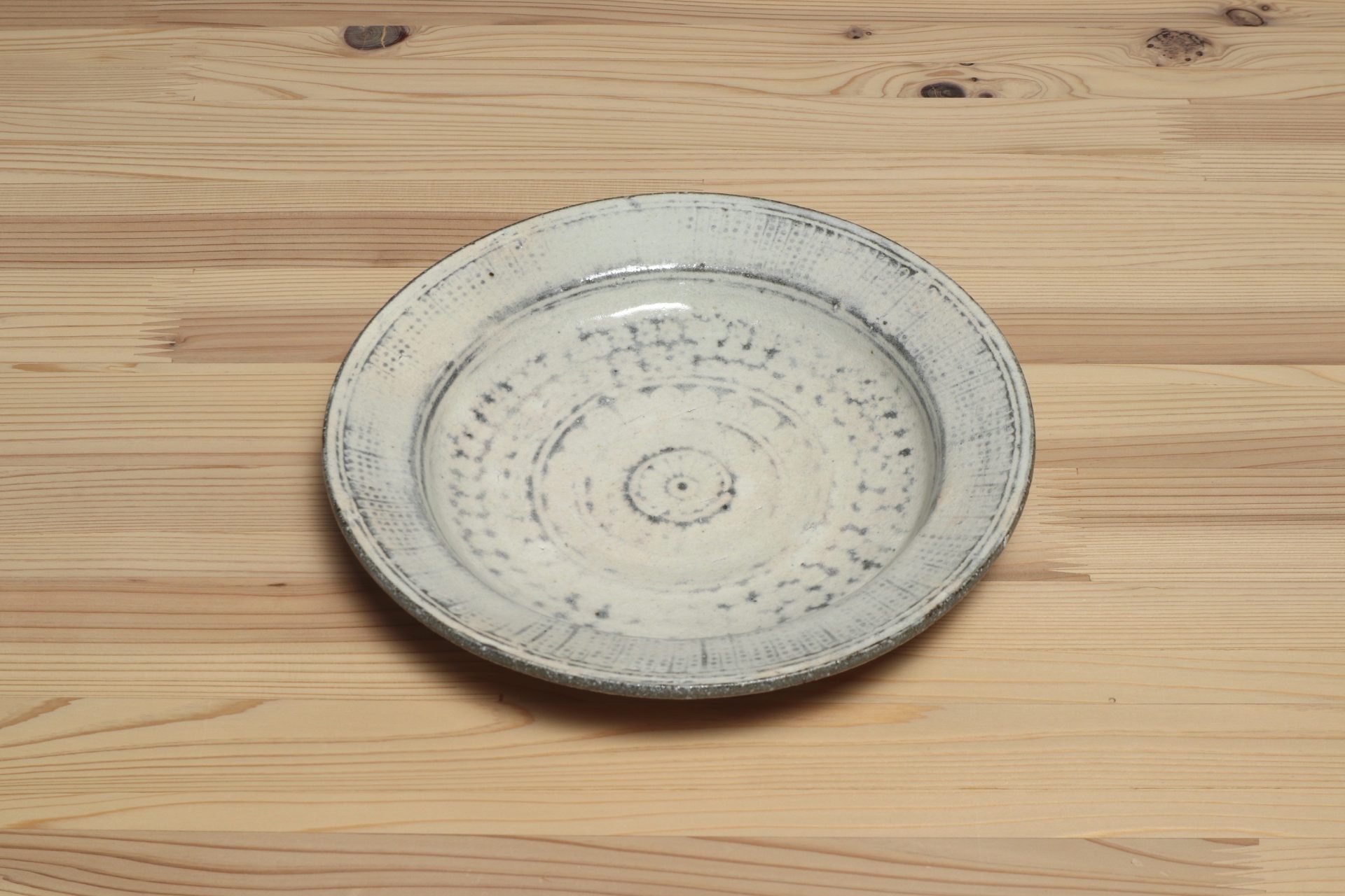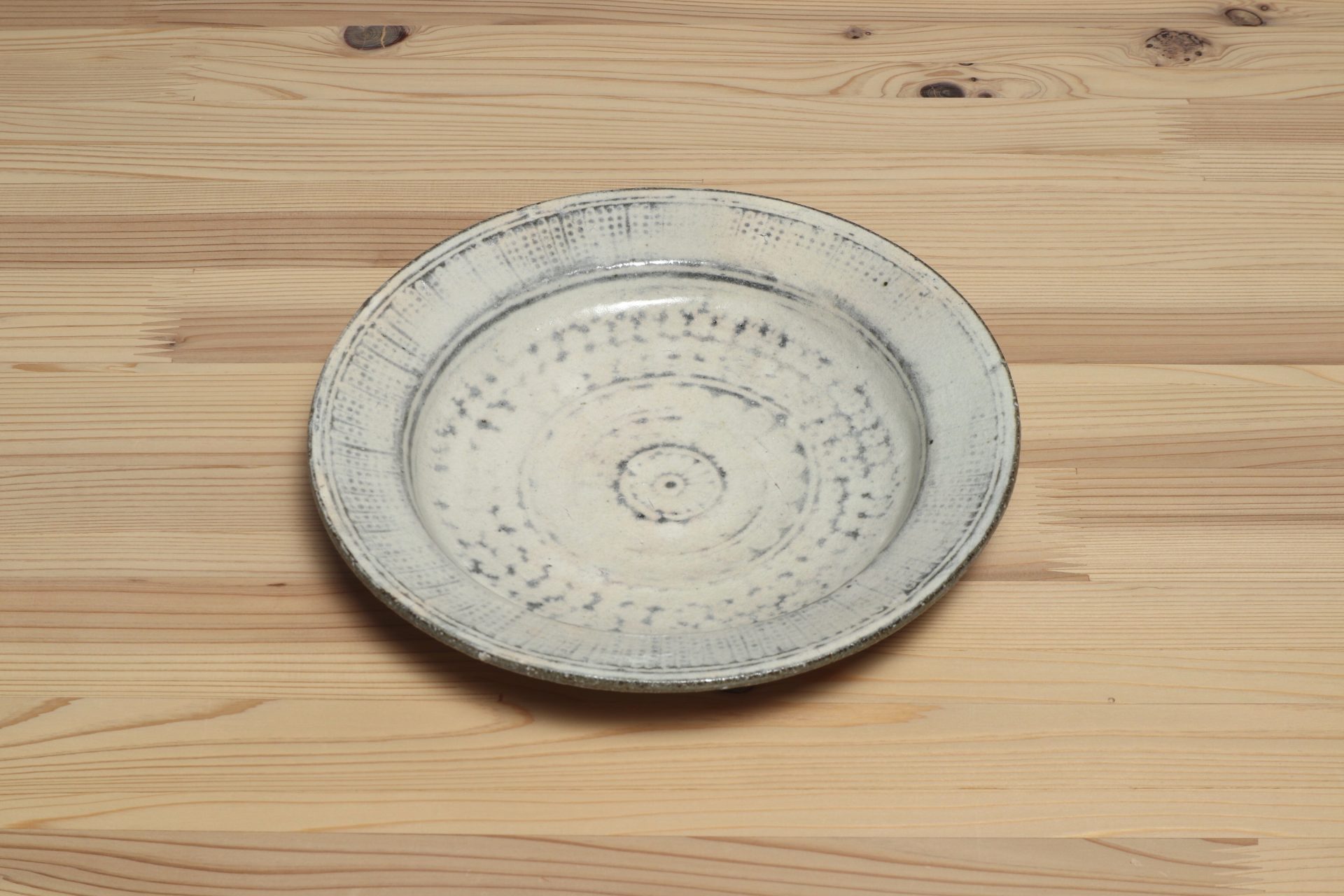 佐藤正一さんの三島リム皿です。シンプルながらも丹念に刻印象嵌された三島の意匠が魅力です。