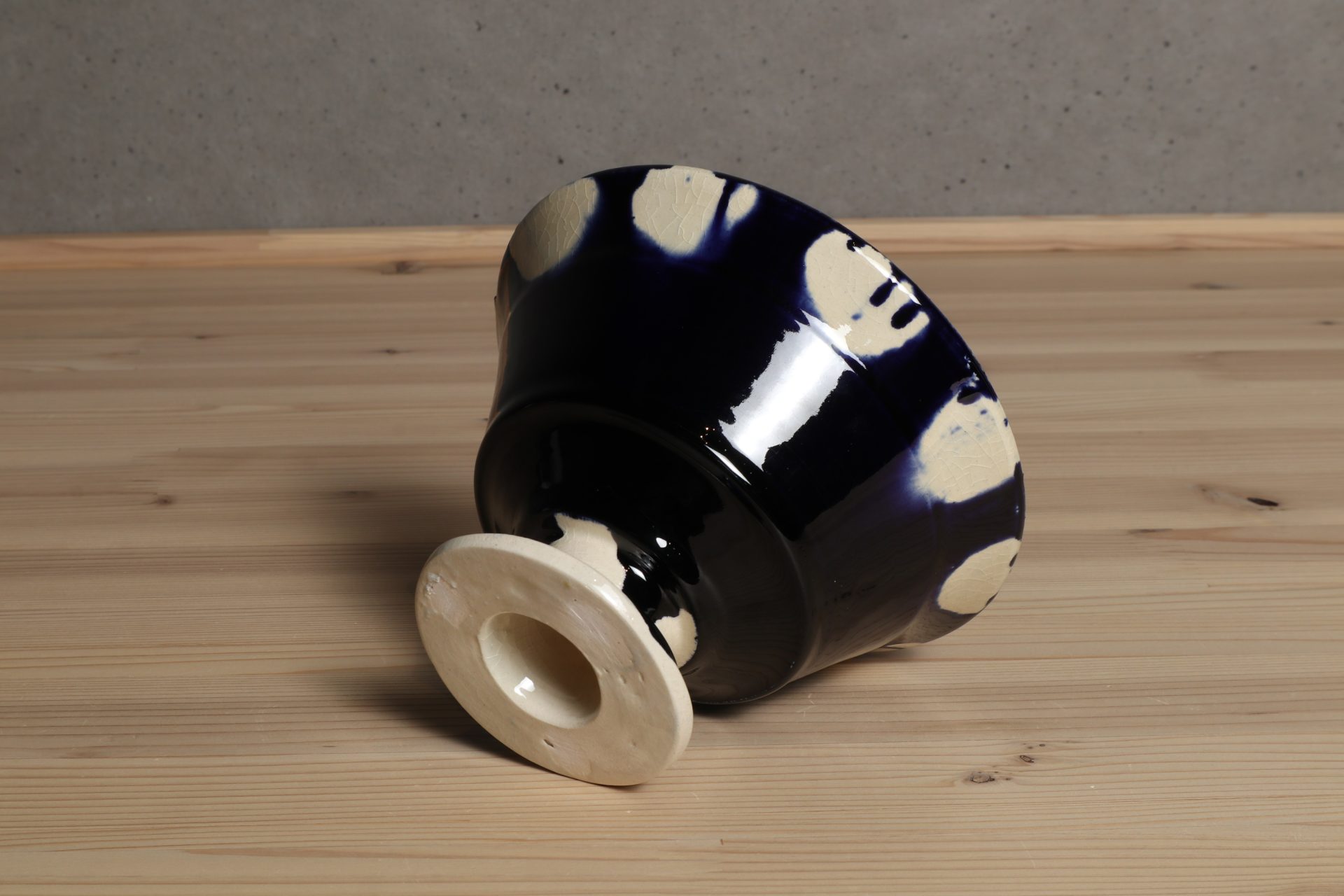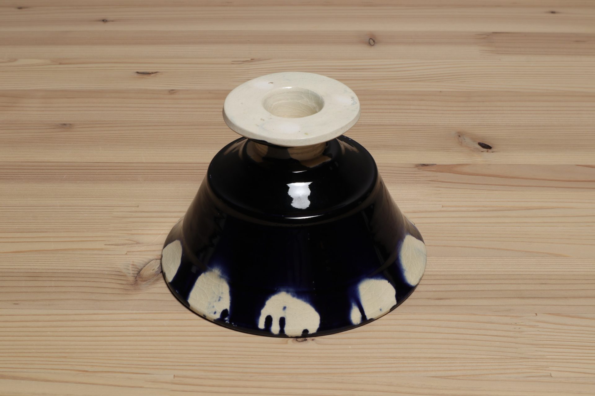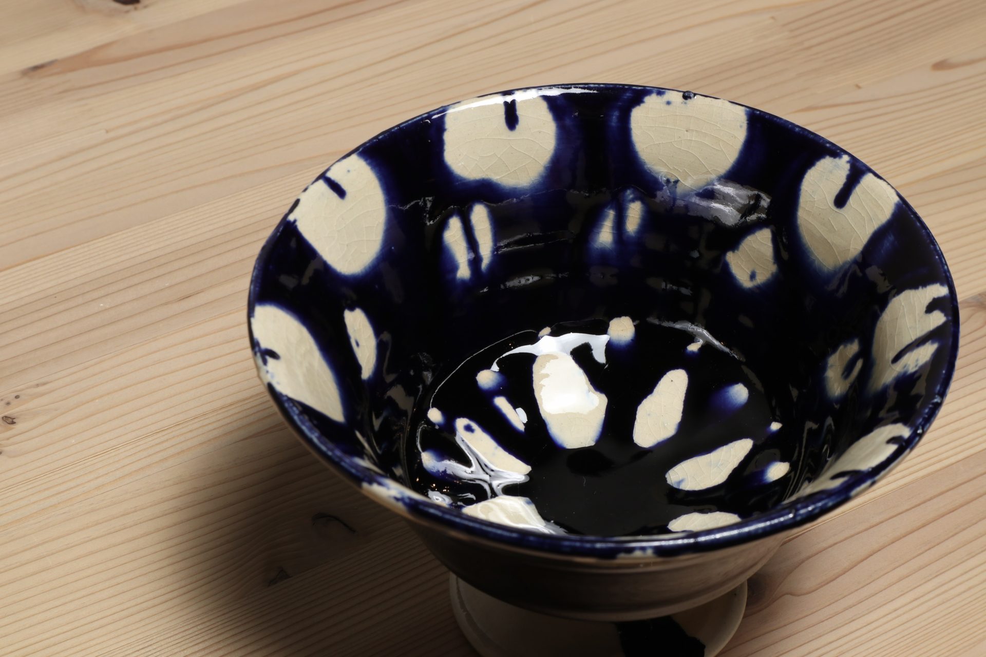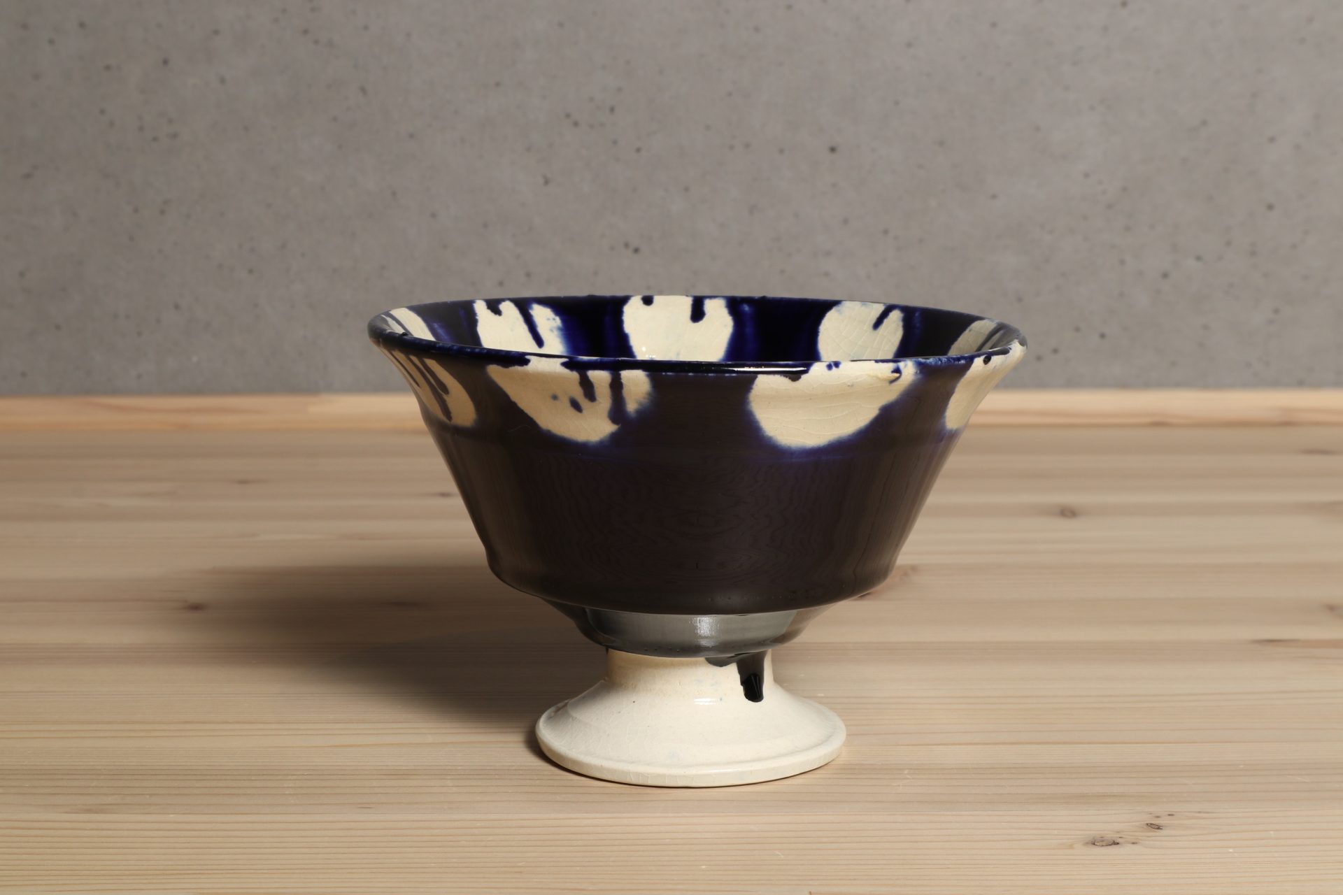 安食ひろさんの瑠璃釉花火茶碗です。シャープな口造りに端正な碗形、高坏とされた高台。唐三彩の雰囲気で施釉された瑠璃釉が、まるで夜空に咲く「花火」のような意匠です。シックでエレガントな雰囲気の茶碗。