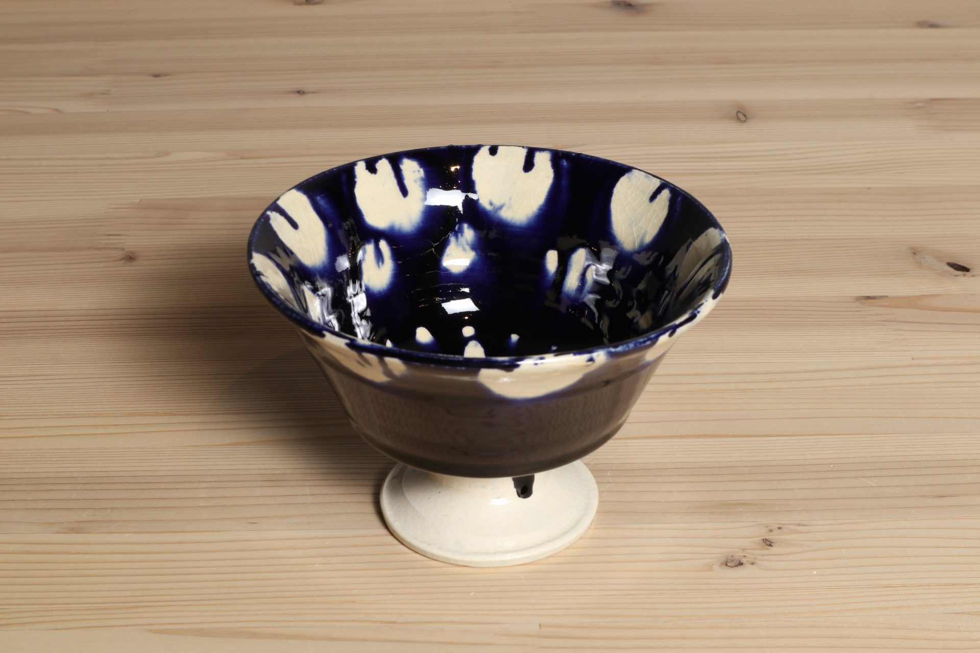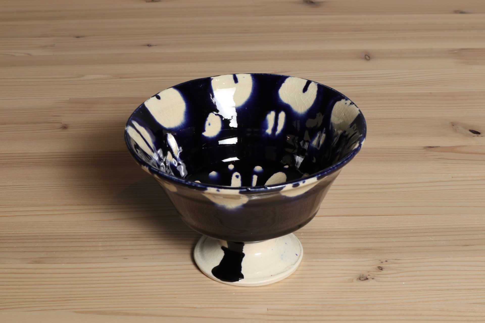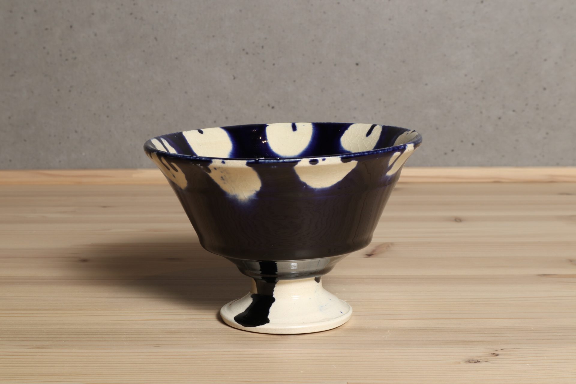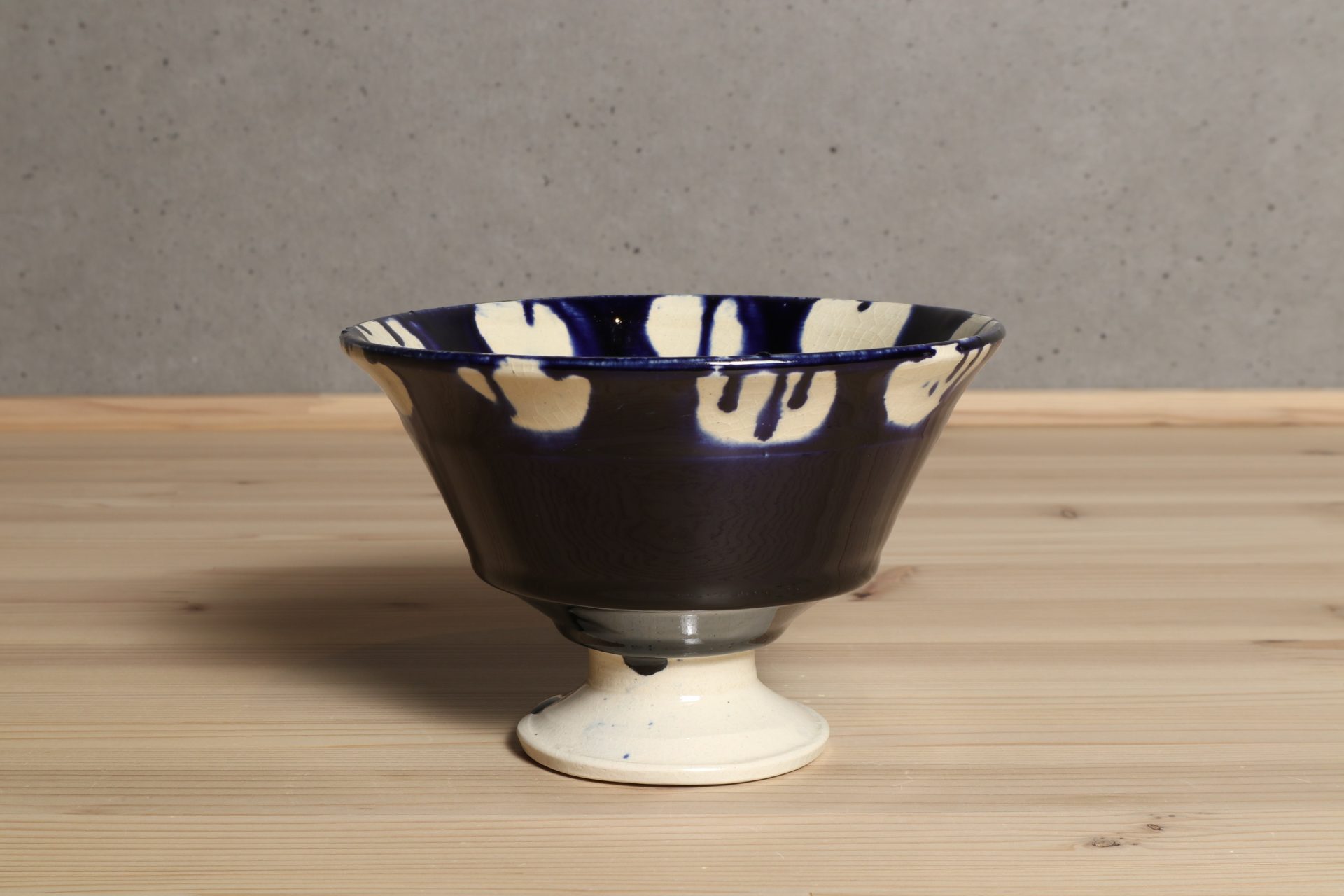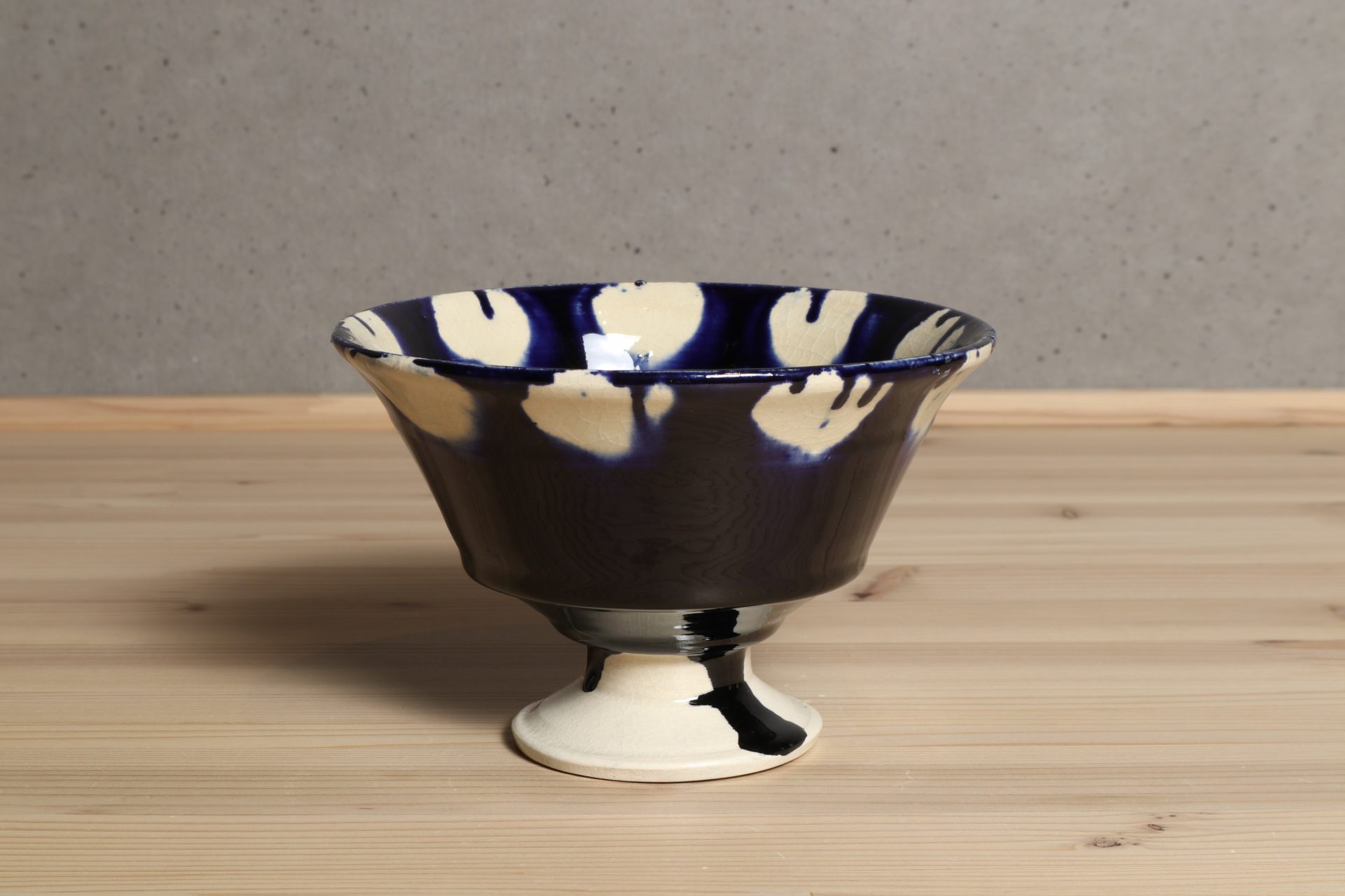 安食ひろさんの瑠璃釉花火茶碗です。シャープな口造りに端正な碗形、高坏とされた高台。唐三彩の雰囲気で施釉された瑠璃釉が、まるで夜空に咲く「花火」のような意匠です。シックでエレガントな雰囲気の茶碗。