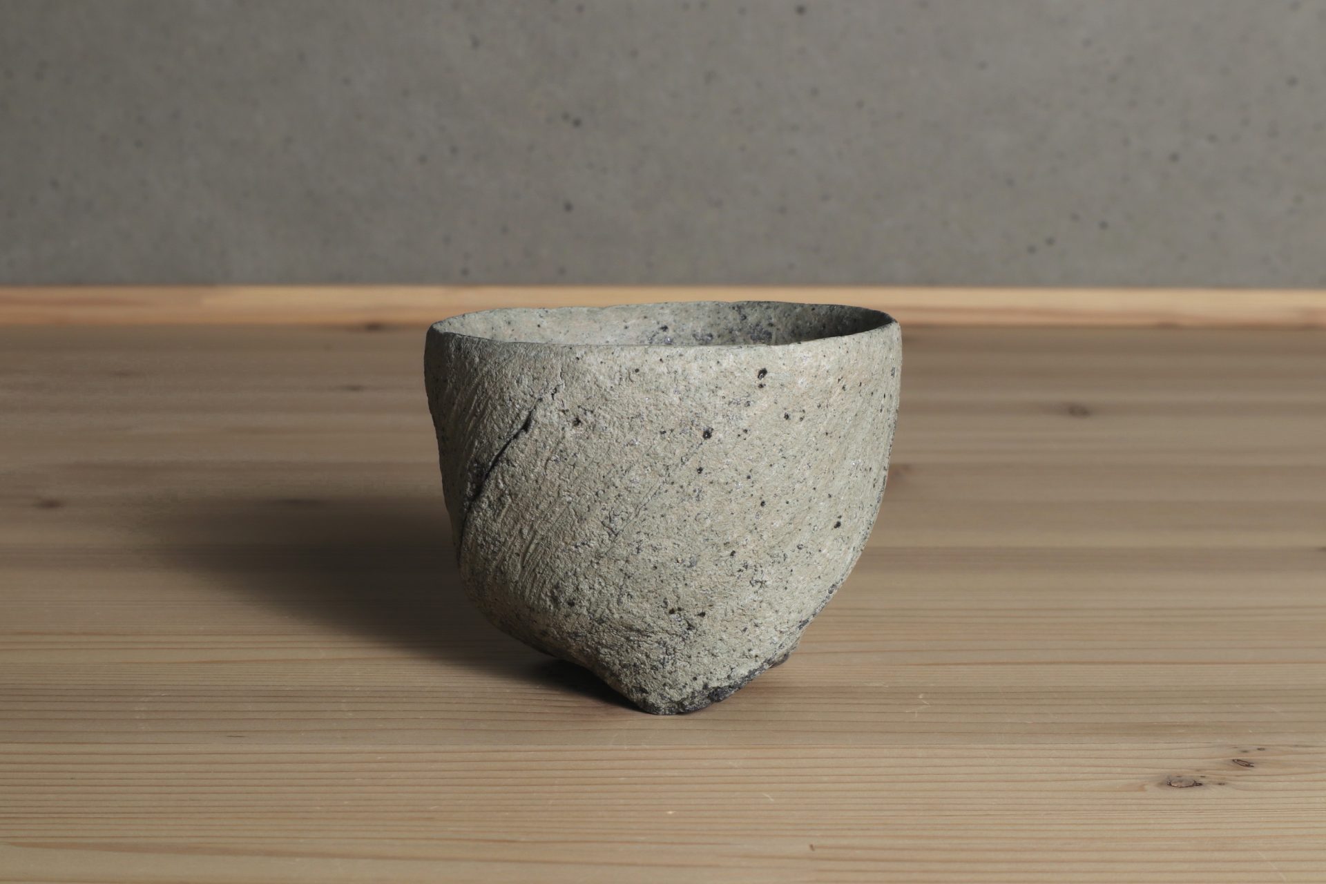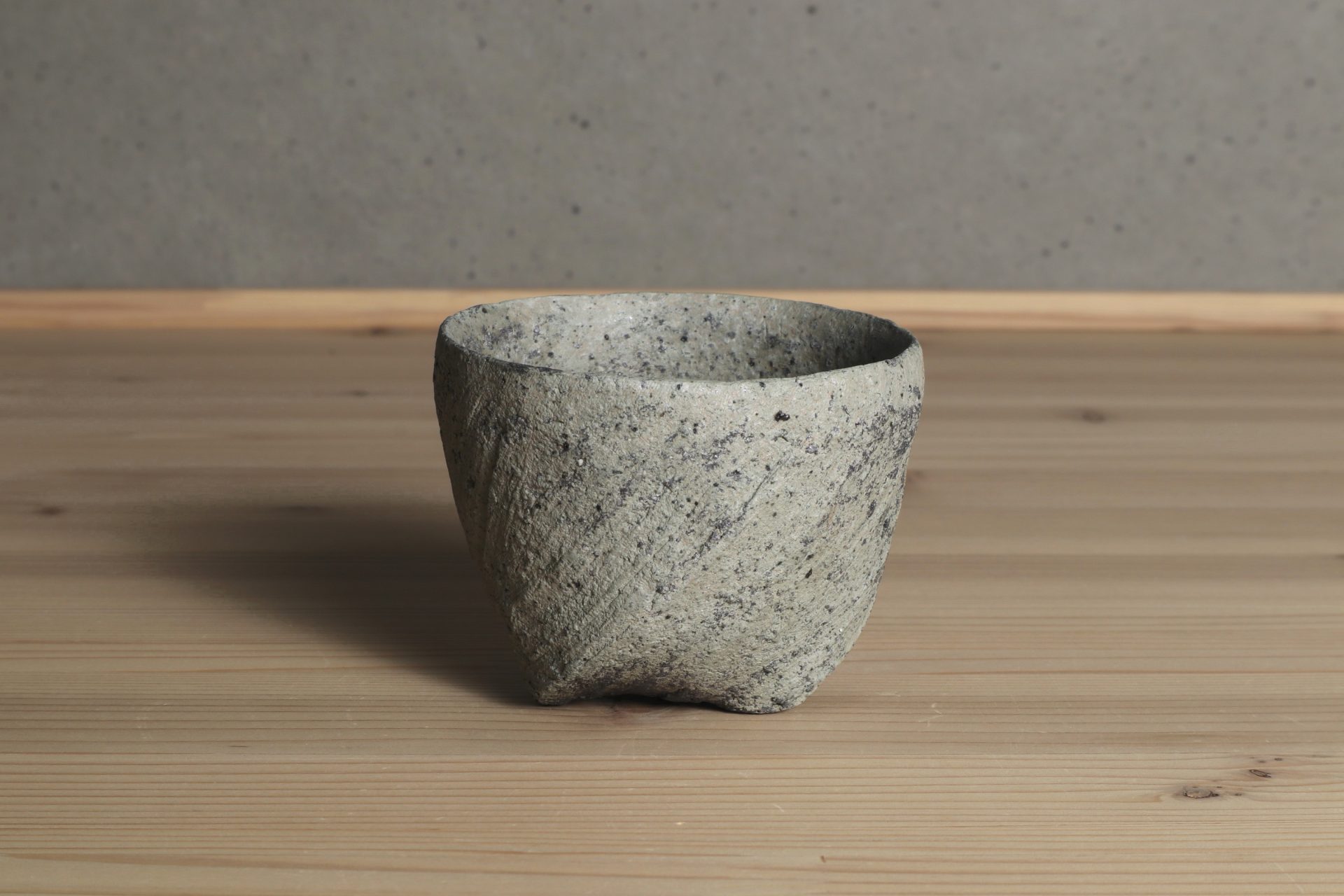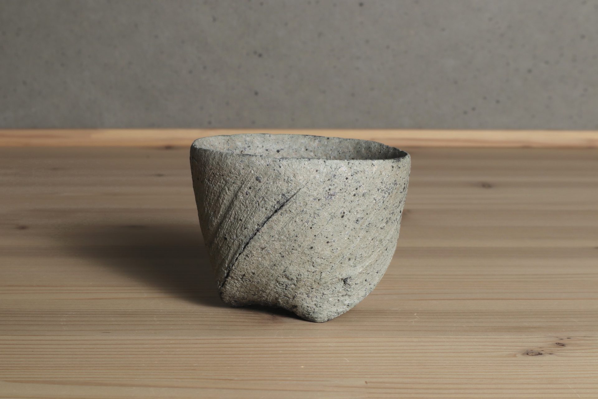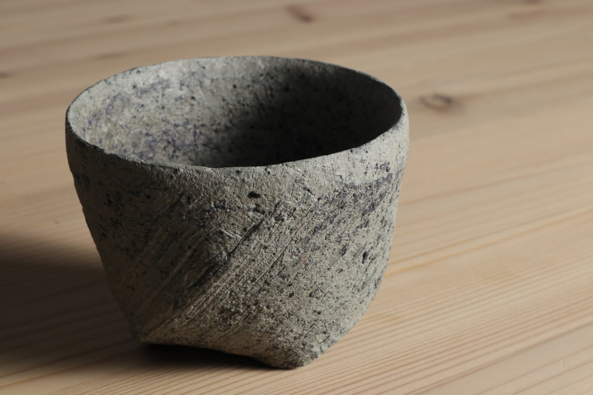 三原研さんの炻器盃です。神々が集うと言われる地元・出雲の風土に思いを馳せ、須恵器や土器のようなプリミティブな質感で表現する「炻器」。シンプルだからこそ、高い造形感覚と手間を厭わない技術の積み重ねによって生まれる作品となっています。大地をそのまま切り出したような、素朴で枯せた土の質感。炎の作用によるしっとりとした青や赤の色彩、遊び心ある高台など、プリミティブな佇まいが魅惑的な酒盃です。