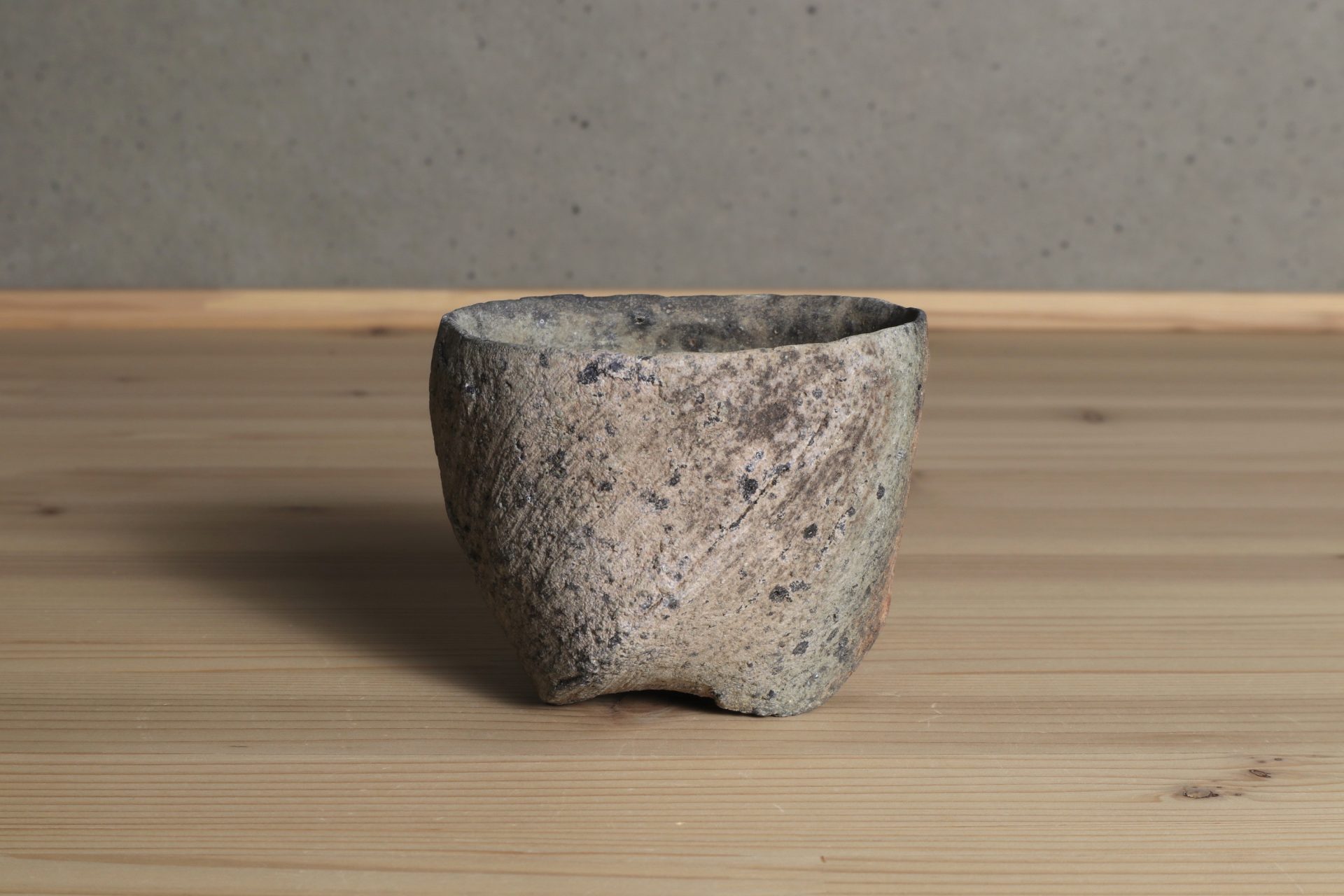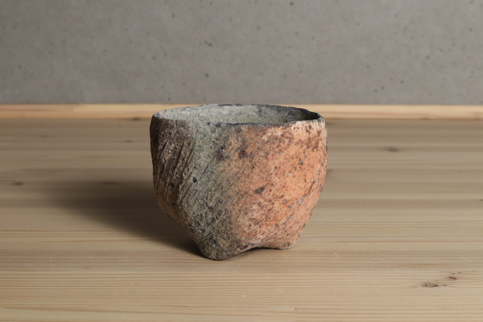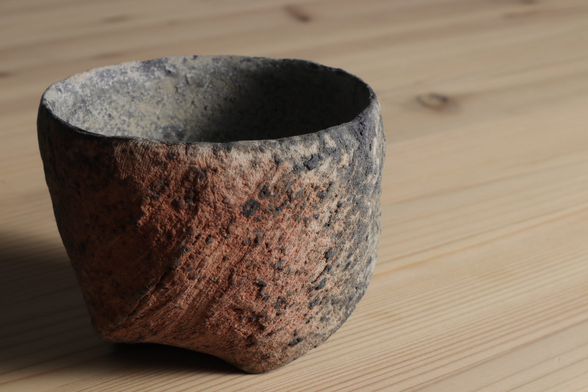三原研さんの炻器盃です。神々が集うと言われる地元・出雲の風土に思いを馳せ、須恵器や土器のようなプリミティブな質感で表現する「炻器」。シンプルだからこそ、高い造形感覚と手間を厭わない技術の積み重ねによって生まれる作品となっています。大地をそのまま切り出したような、素朴で枯せた土の質感。炎の作用によるしっとりとした青や赤の色彩、遊び心ある高台など、プリミティブな佇まいが魅惑的な酒盃です。