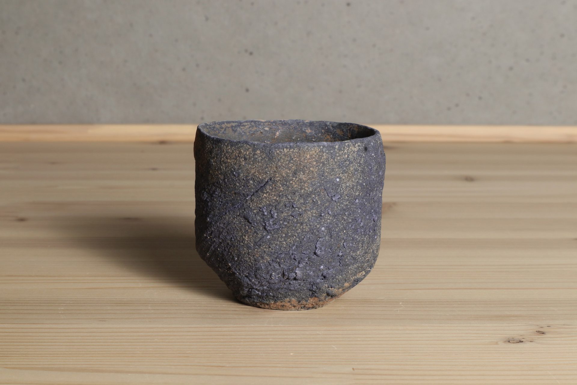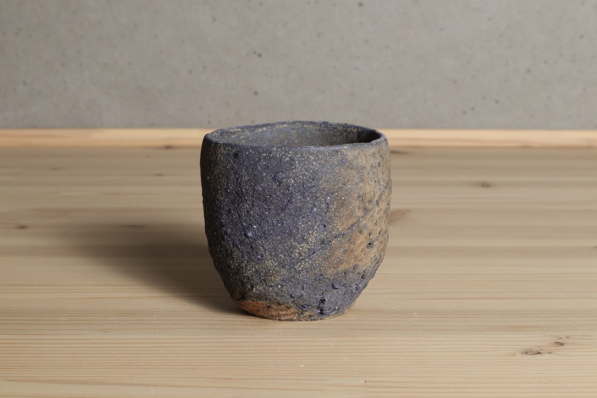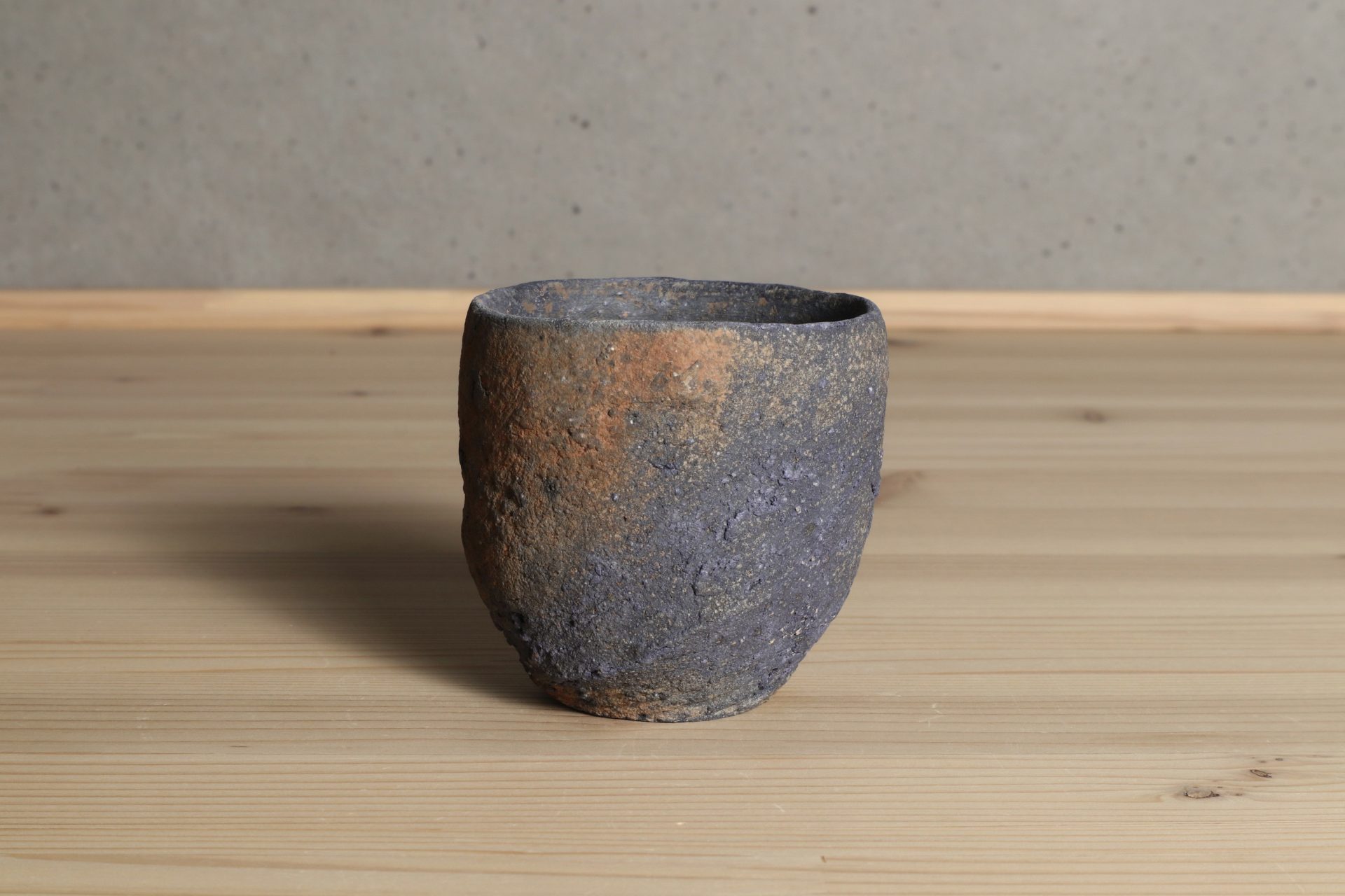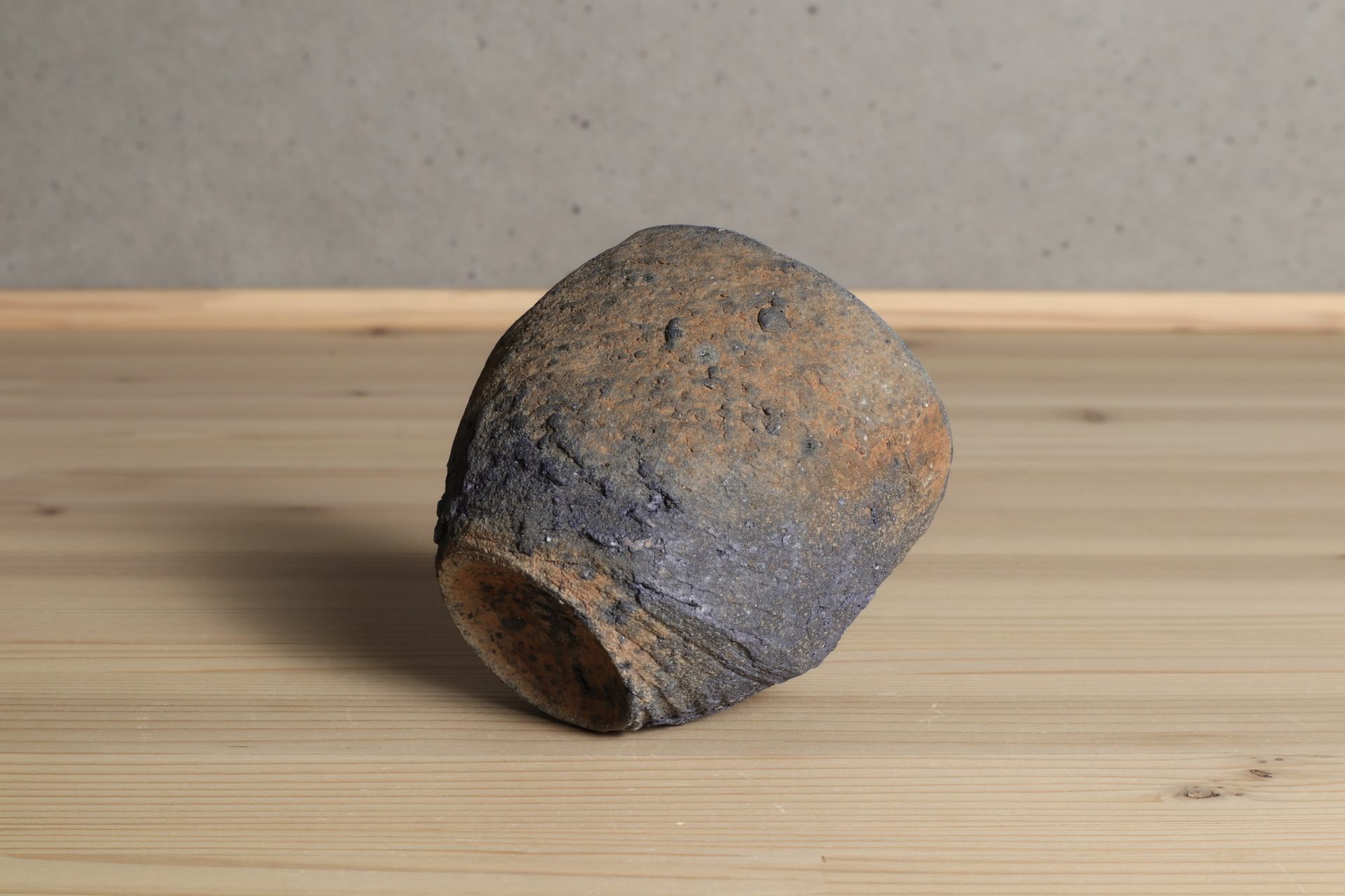 三原研さんの炻器盃です。神々が集うと言われる地元・出雲の風土に思いを馳せ、須恵器や土器のようなプリミティブな質感で表現する「炻器」。シンプルだからこそ、高い造形感覚と手間を厭わない技術の積み重ねによって生まれる作品となっています。大地をそのまま切り出したような、素朴で枯せた土の質感。炎の作用によるしっとりとした青や赤の色彩、遊び心ある高台など、プリミティブな佇まいが魅惑的な酒盃です。