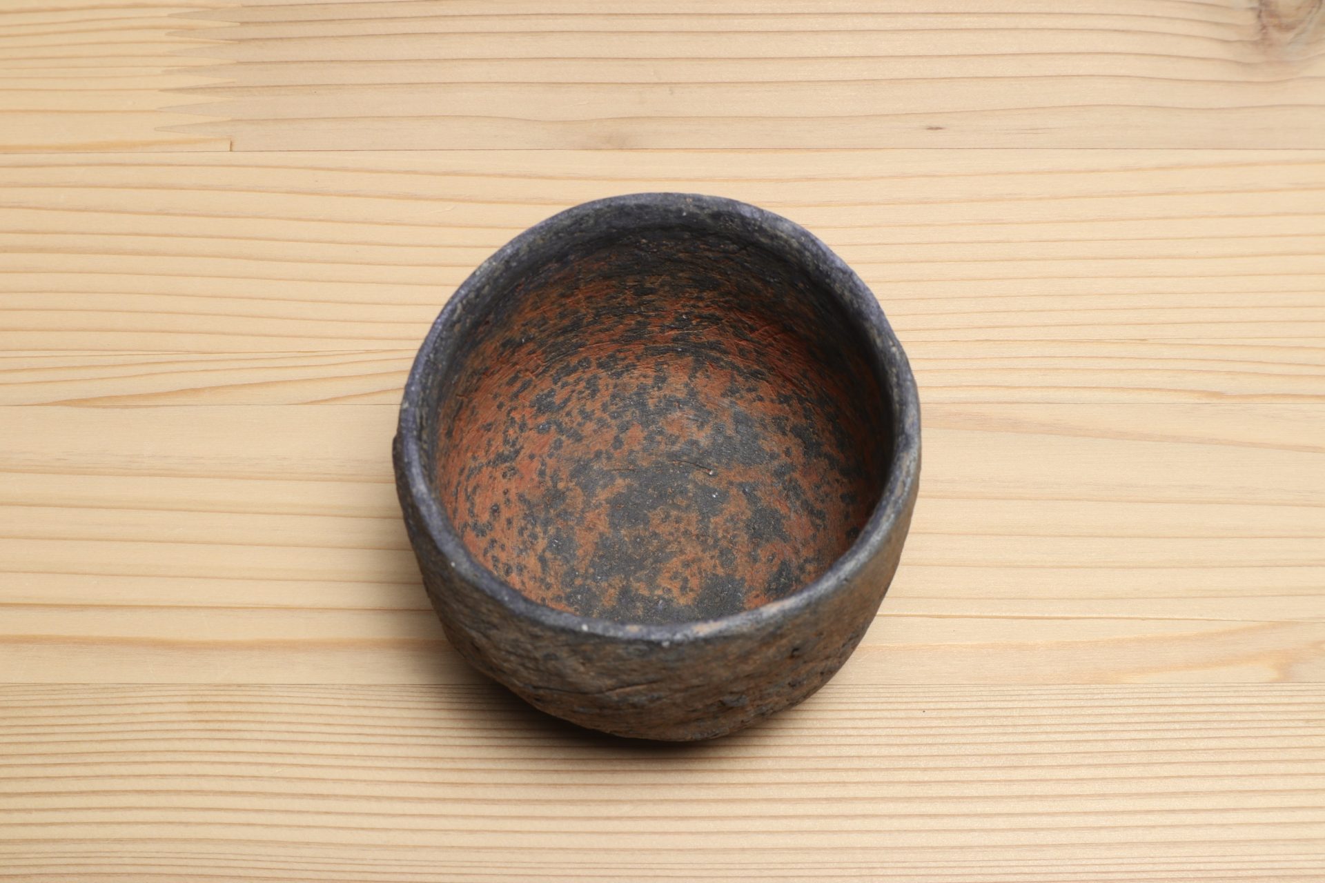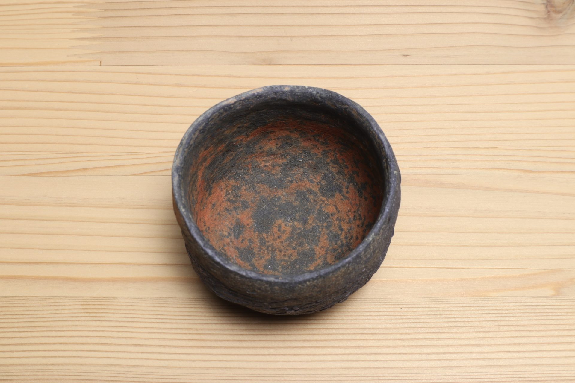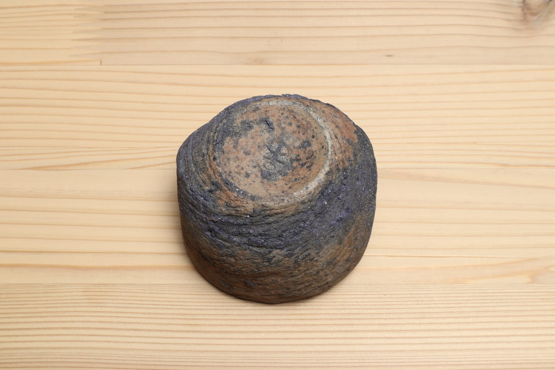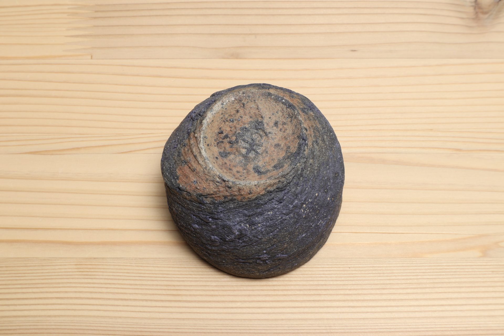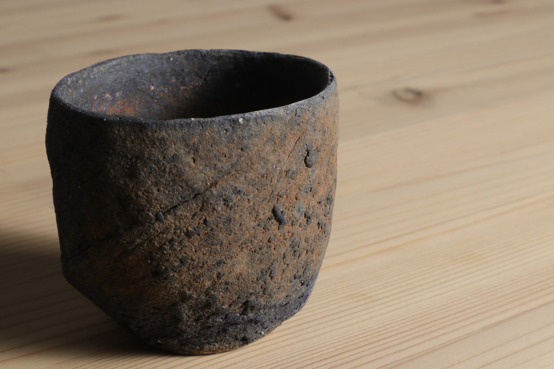三原研さんの炻器盃です。神々が集うと言われる地元・出雲の風土に思いを馳せ、須恵器や土器のようなプリミティブな質感で表現する「炻器」。シンプルだからこそ、高い造形感覚と手間を厭わない技術の積み重ねによって生まれる作品となっています。大地をそのまま切り出したような、素朴で枯せた土の質感。炎の作用によるしっとりとした青や赤の色彩、遊び心ある高台など、プリミティブな佇まいが魅惑的な酒盃です。