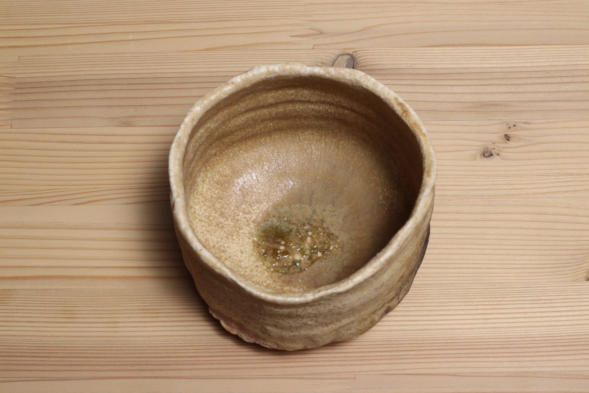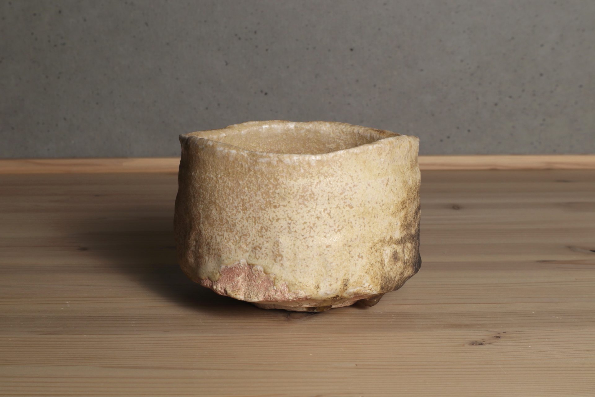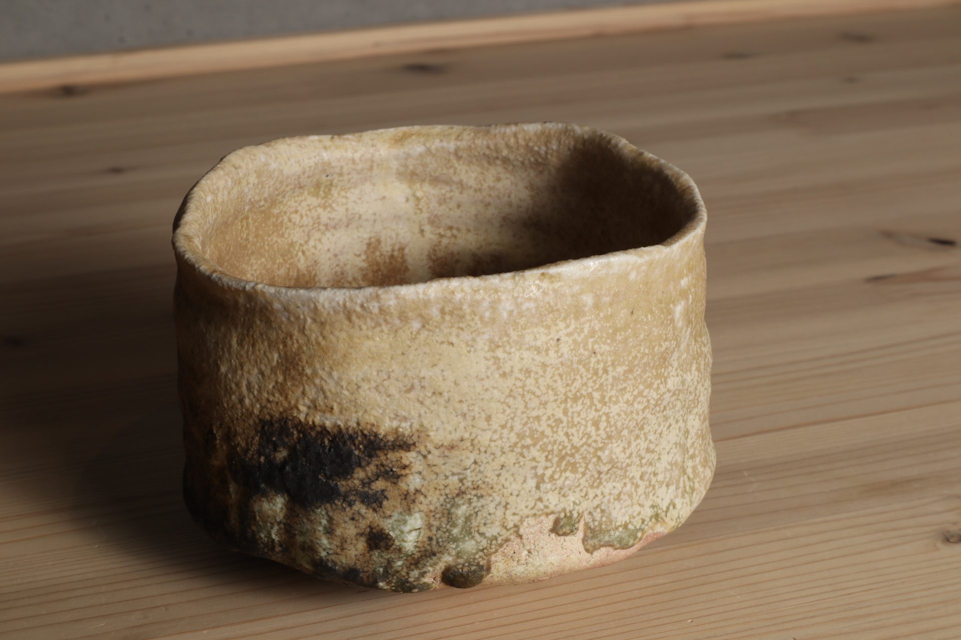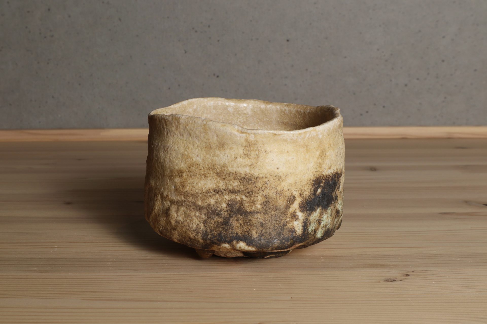 堀一郎さんの黄瀬戸茶碗です。緊張感ある動きのある口造りに、腰を力強く張り出した重厚なフォルム。唯一無二のレベルを感じる、無骨で気取らない高台削り。マッドな枯せた黄瀬戸釉が静謐な風韻を醸し出しています。高台に流れた玉垂れや灰被も魅力の一碗。