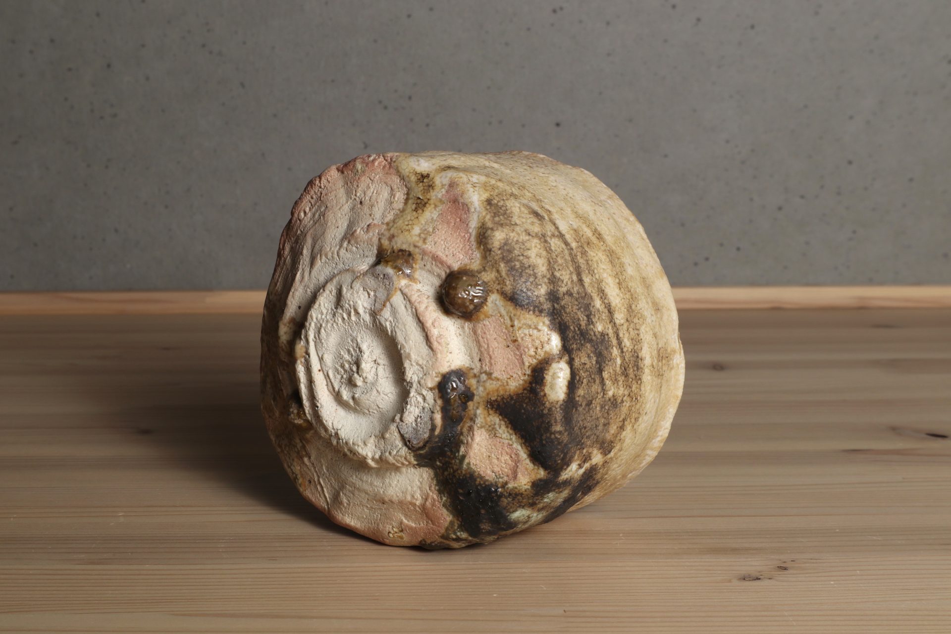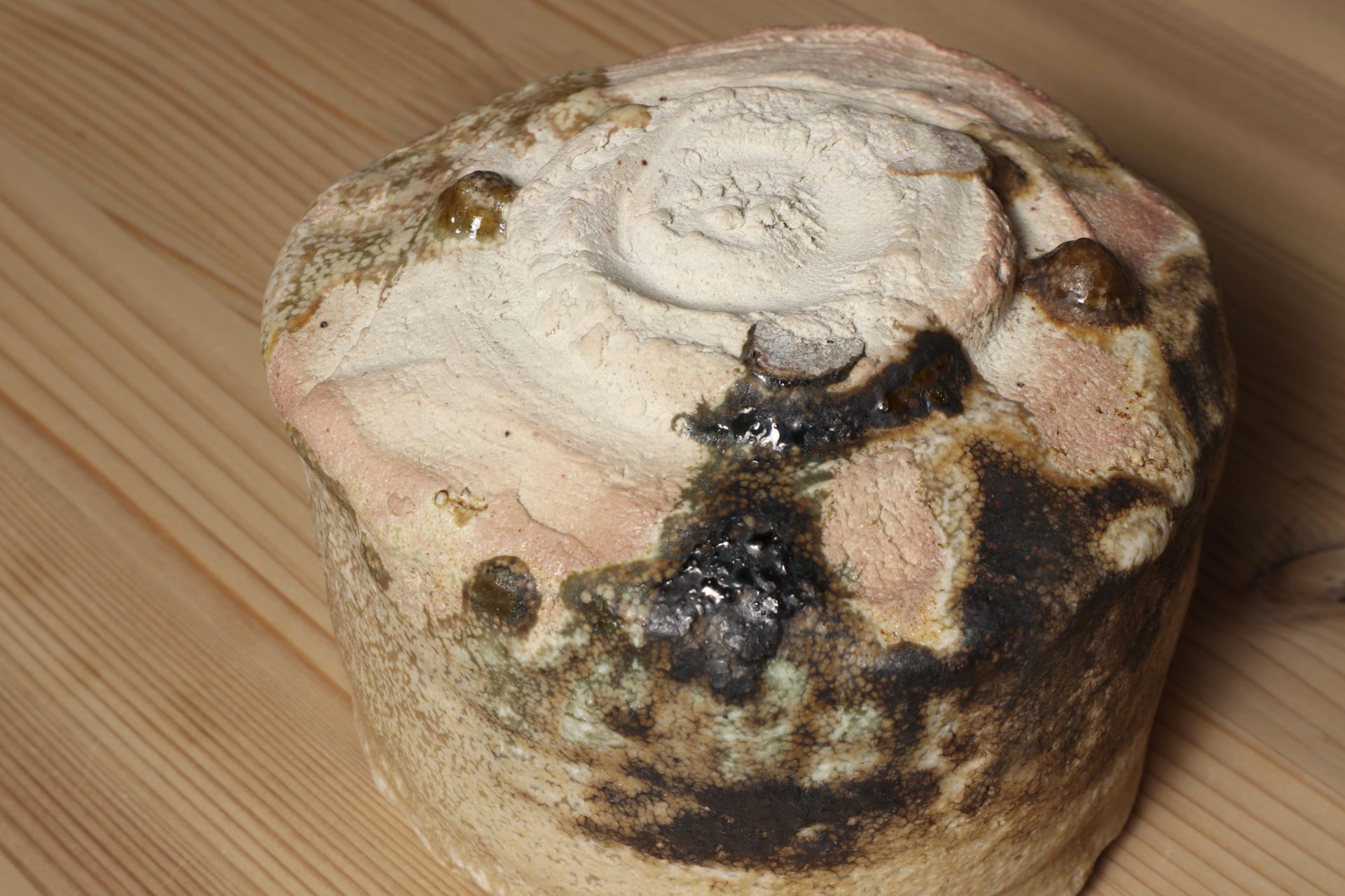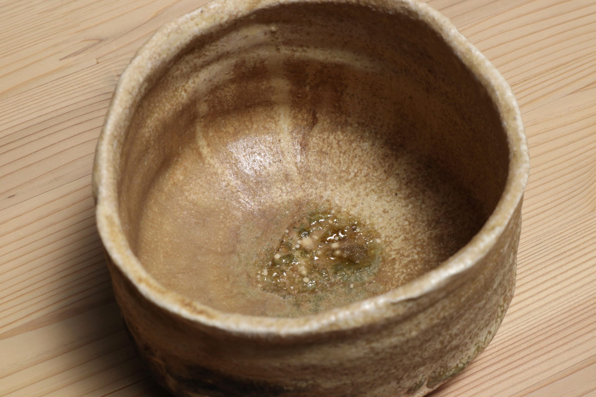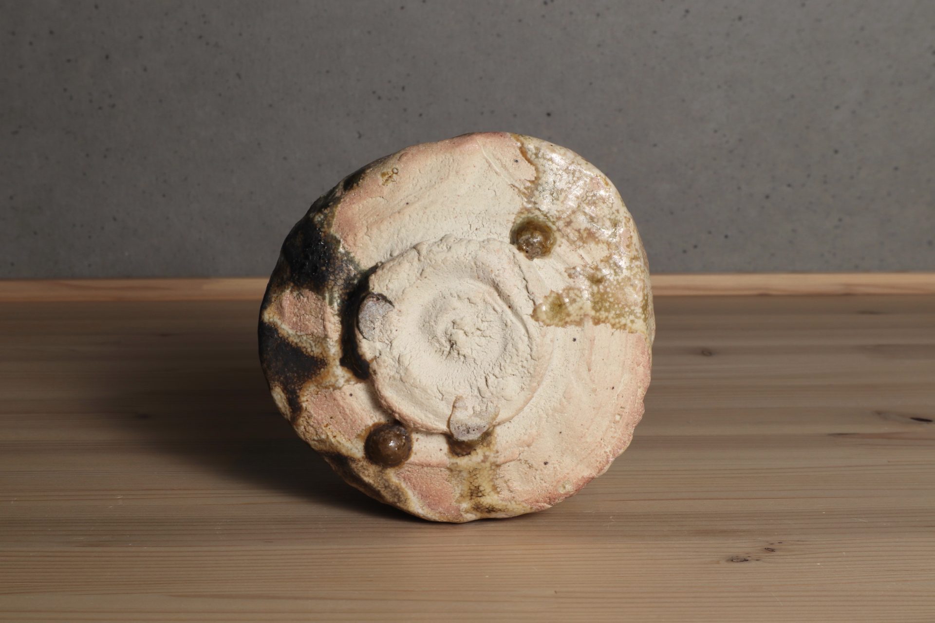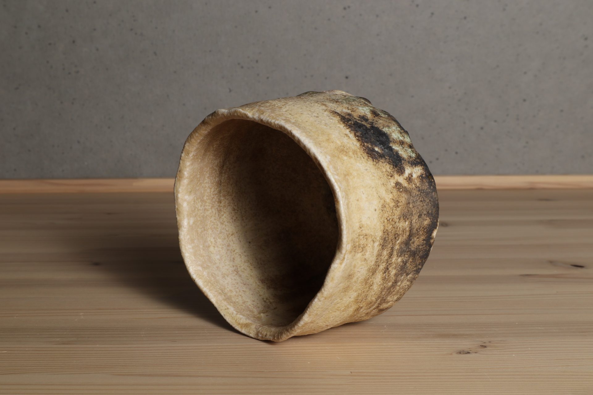堀一郎さんの黄瀬戸茶碗です。緊張感ある動きのある口造りに、腰を力強く張り出した重厚なフォルム。唯一無二のレベルを感じる、無骨で気取らない高台削り。マッドな枯せた黄瀬戸釉が静謐な風韻を醸し出しています。高台に流れた玉垂れや灰被も魅力の一碗。