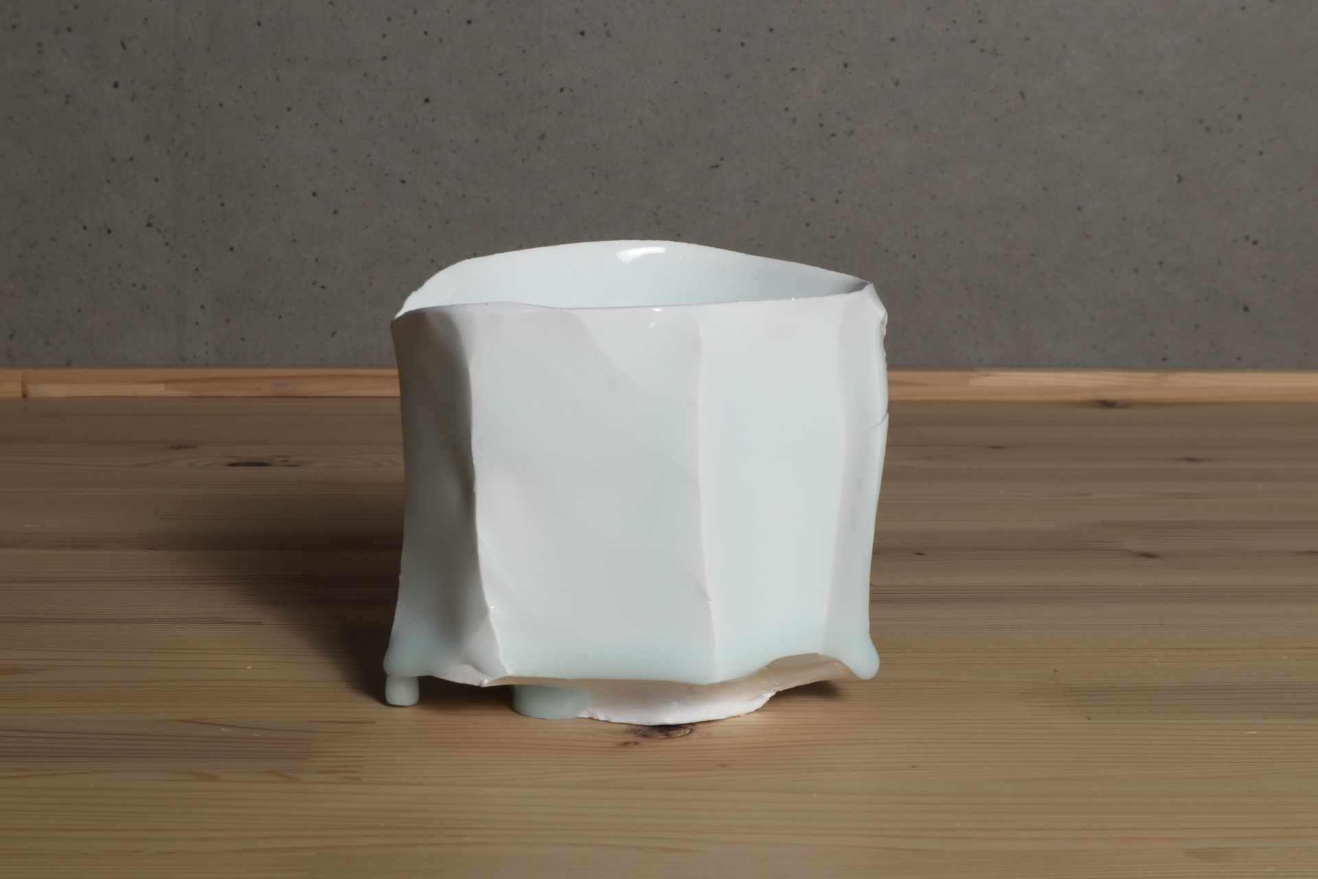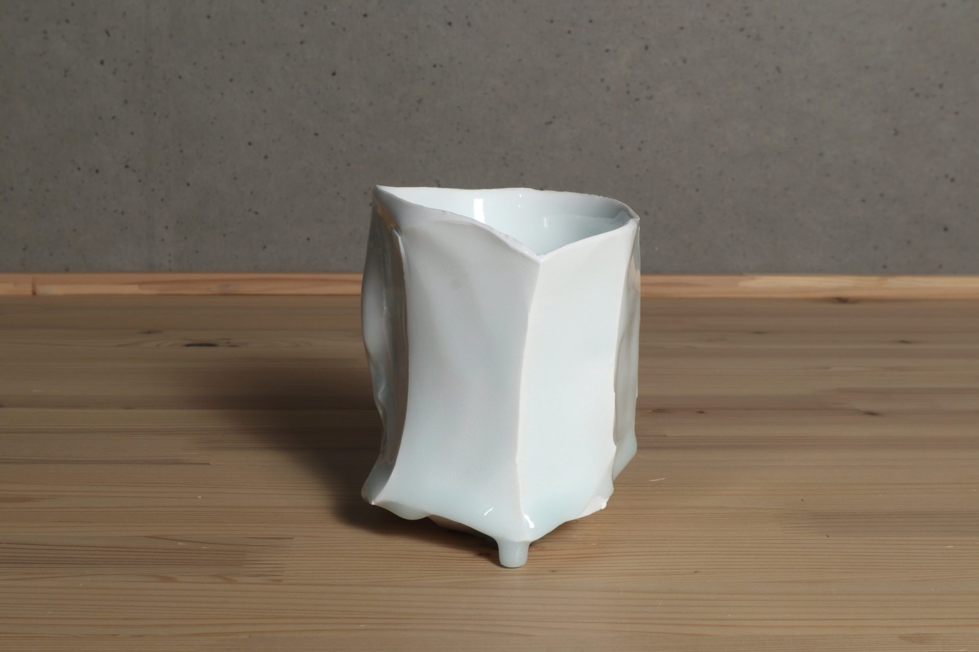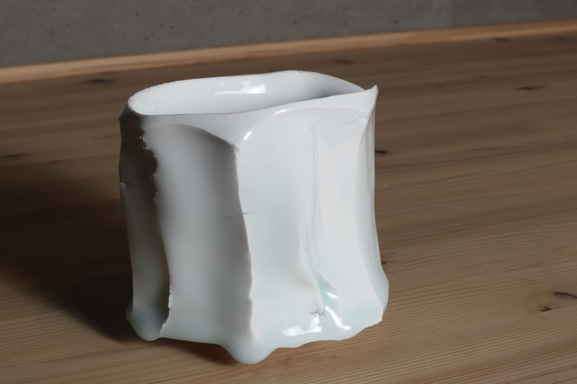 加藤委さんの青白磁面取茶碗です。厚手に轆轤成形したものを、豪胆に、そして繊細に刃物で削ぎ落した筒型のフォルム。シャープで緊張感ある面取りと、柔らかく有機的な稜線が心地良い風韻です。ニュージーランド産カオリンの磁土をキャンバスに、透き通るような美しい青白磁の色調。雫のような玉垂れ、六角に削ぎ落されたロックな高台も魅力です。