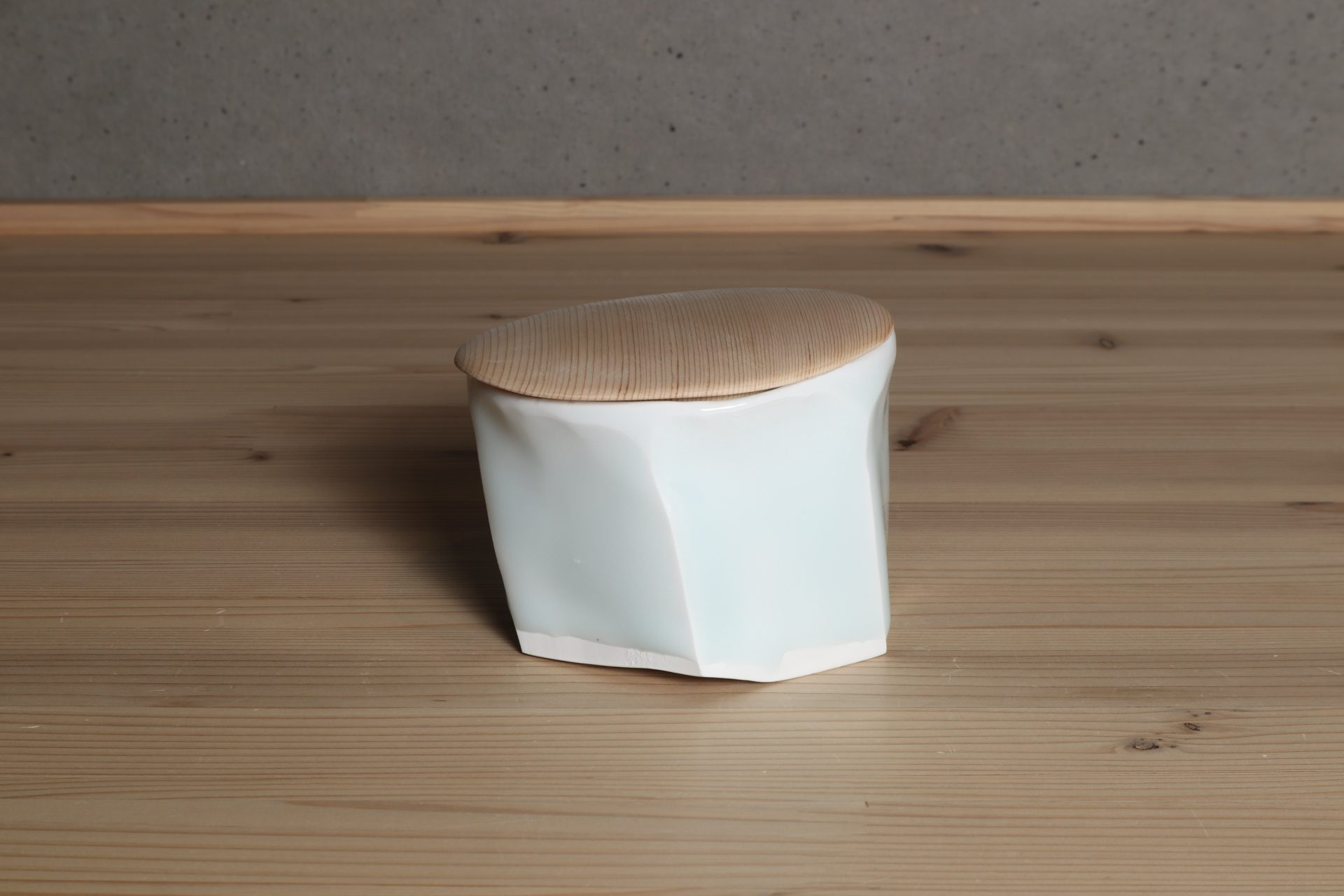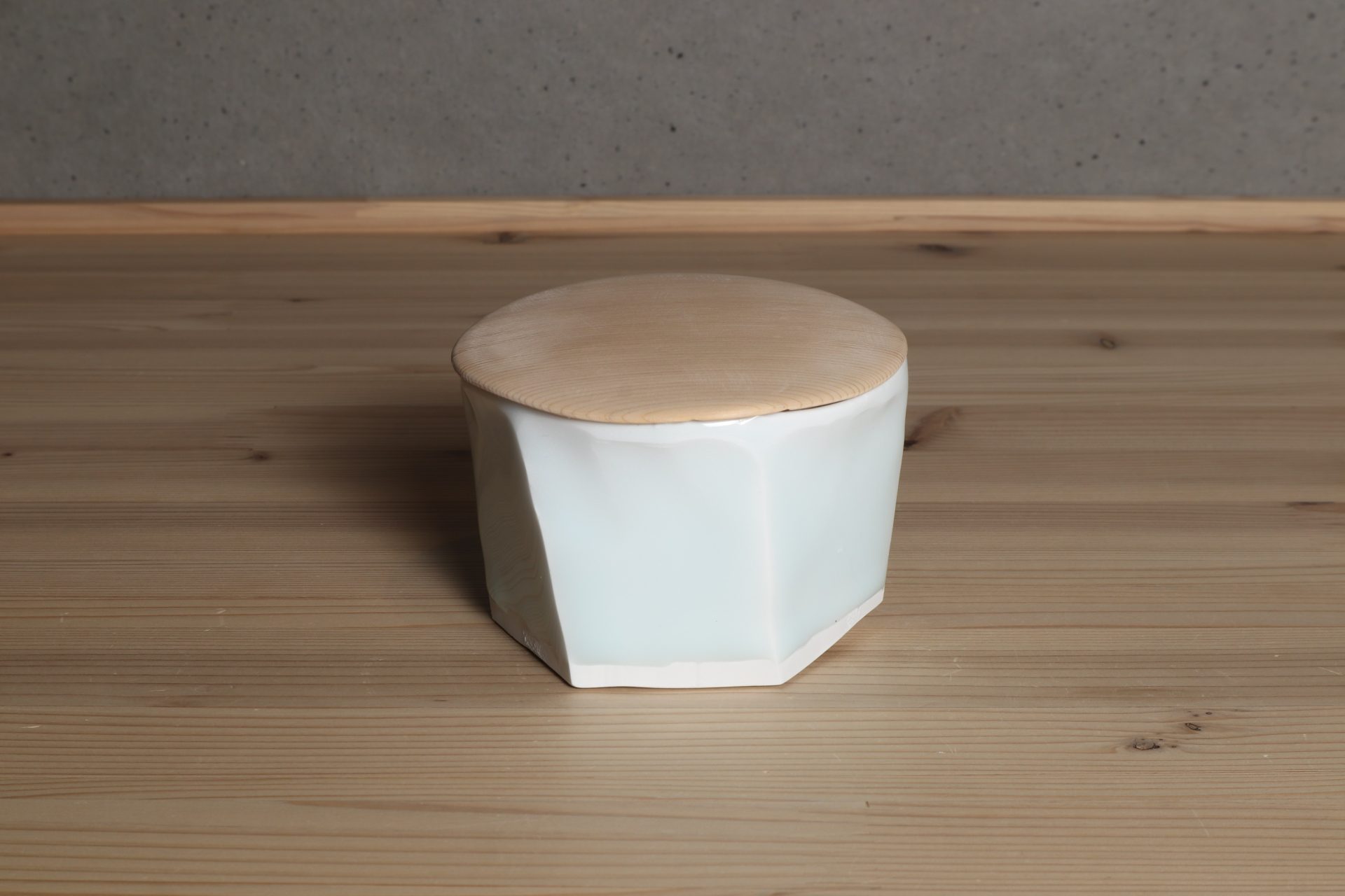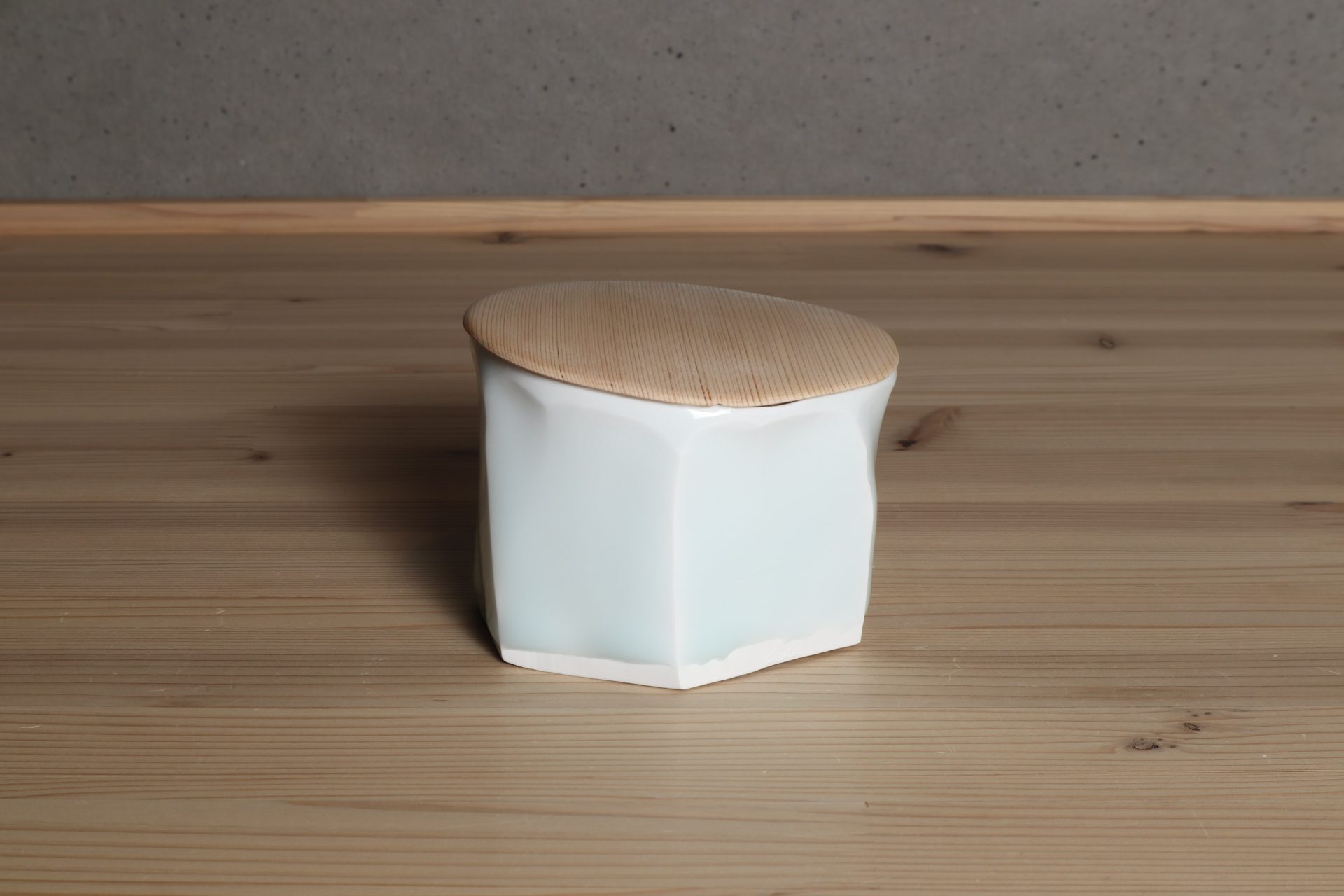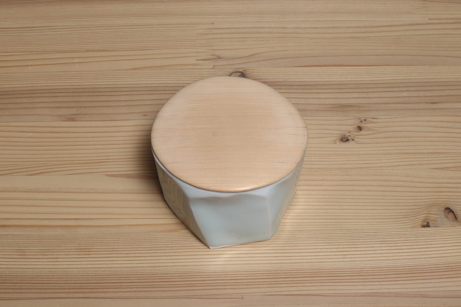 加藤委さんの青白磁面取碗 檜蓋付です。小鉢サイズの六角面取碗に、檜の蓋をオリジナルで誂えた蓋物です。中に何を入れるか、どう活かして楽しむか・・・を探してみて下さい。蓋の制作は野澤寛さん(新潟市)です。